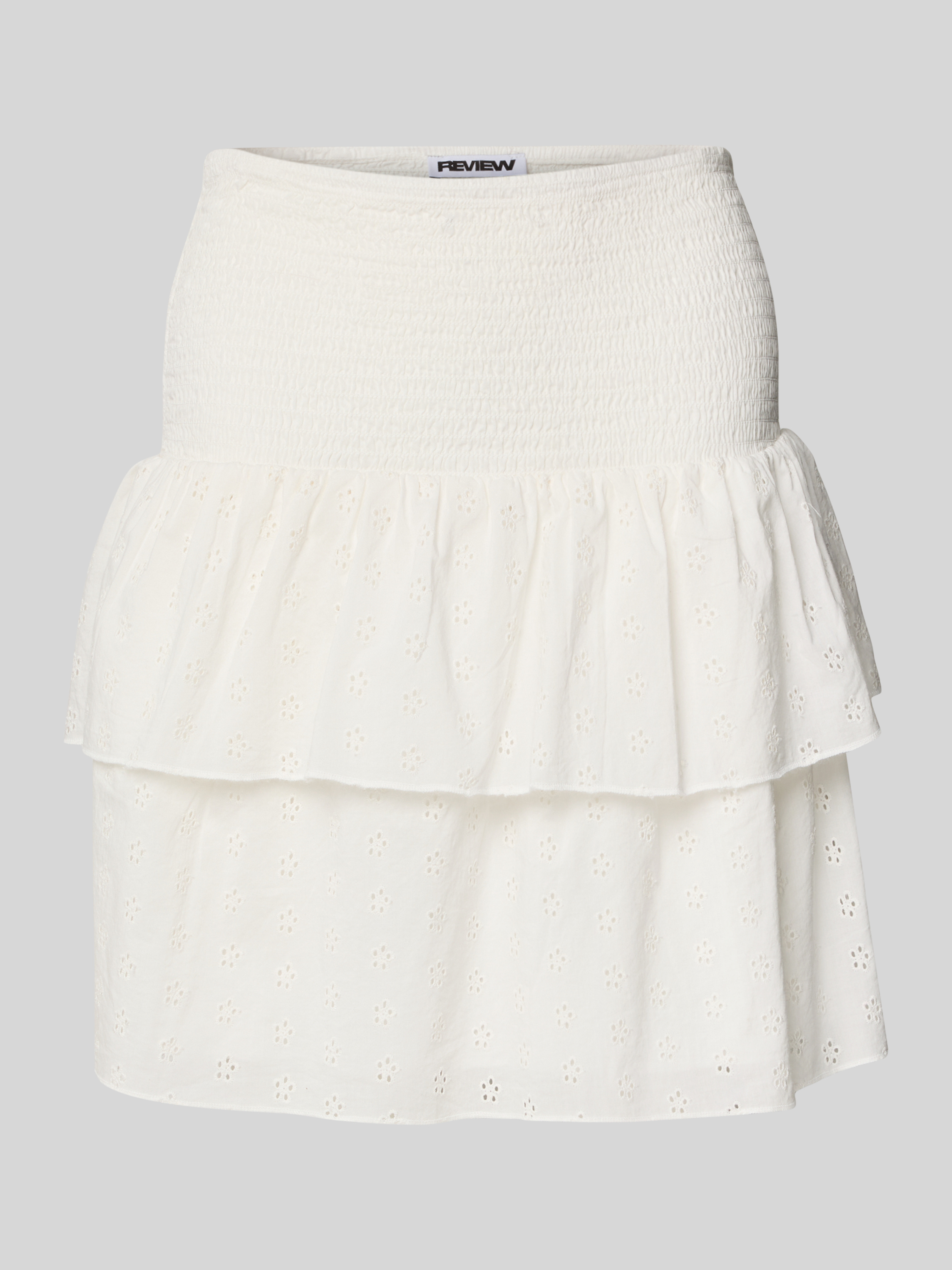 Der Minirock von REVIEW aus reiner Baumwolle vereint Komfort und Stil in einem ansprechenden Design. Der gerade Schnitt und die Smok-Details im elastischen Bund sorgen für eine bequeme Passform, während der Stufen-Look mit Volants dem Outfit eine verspielte Note verleiht. Ideal für vielseitige Kombinationen im Alltag.