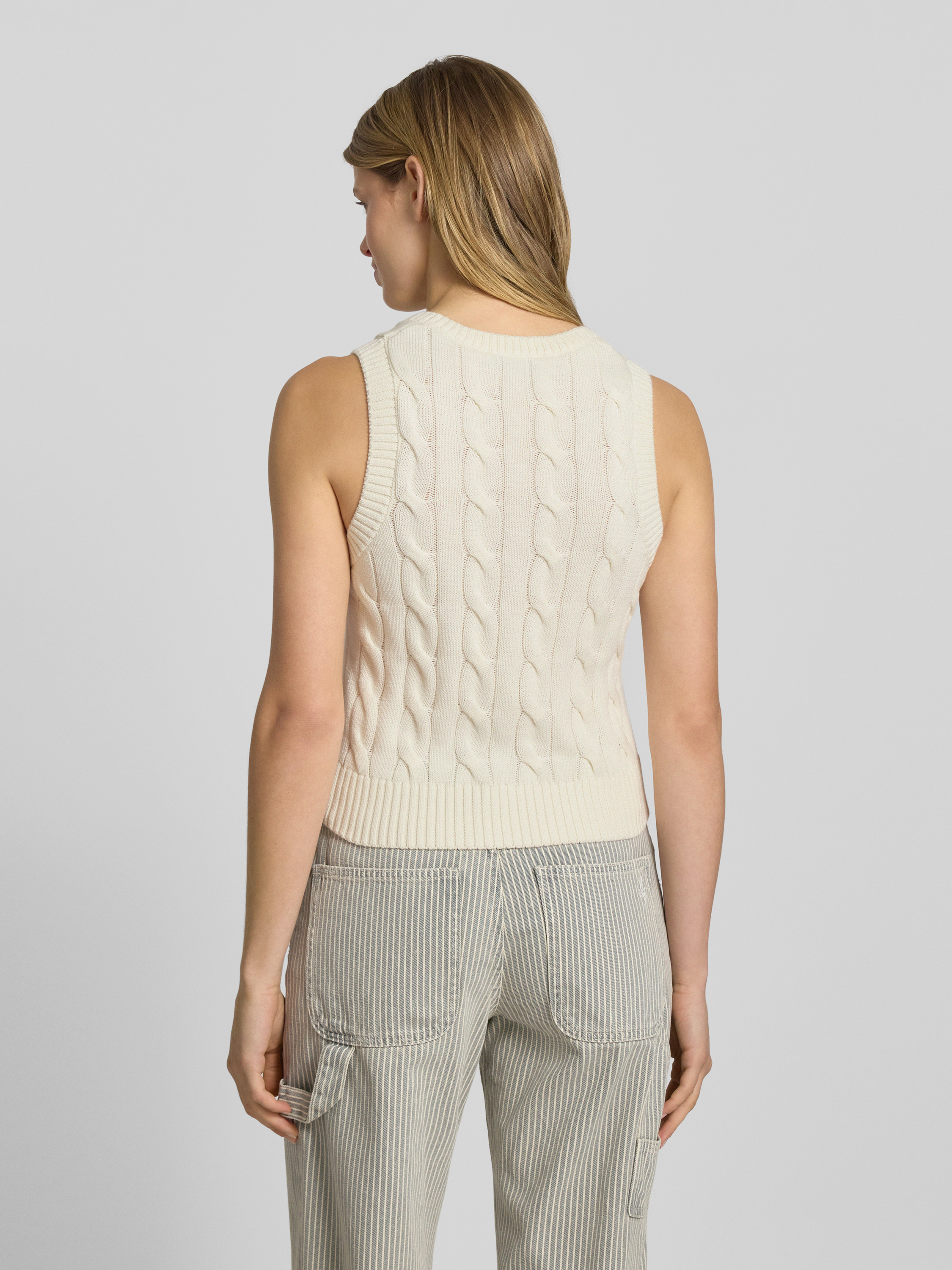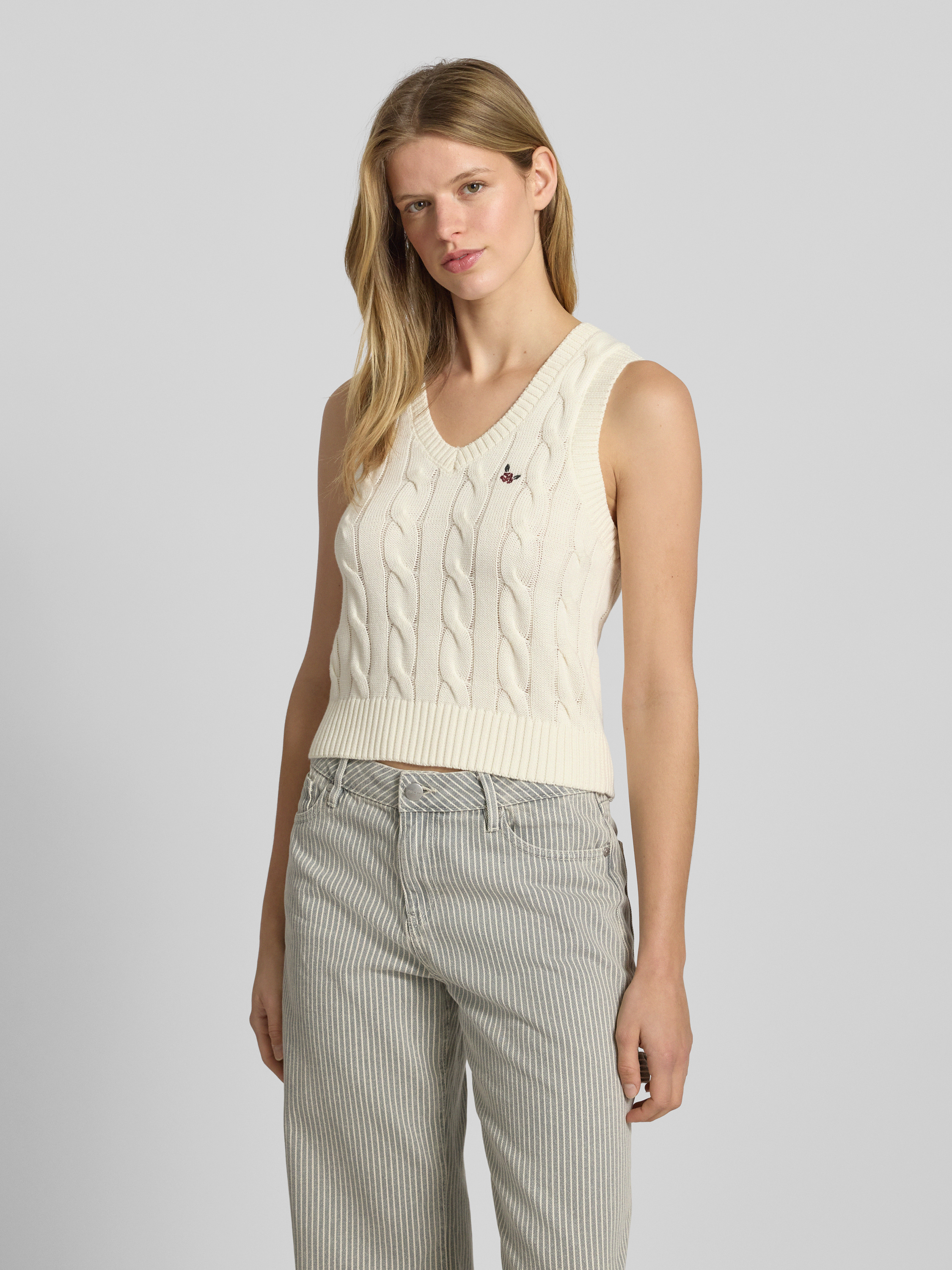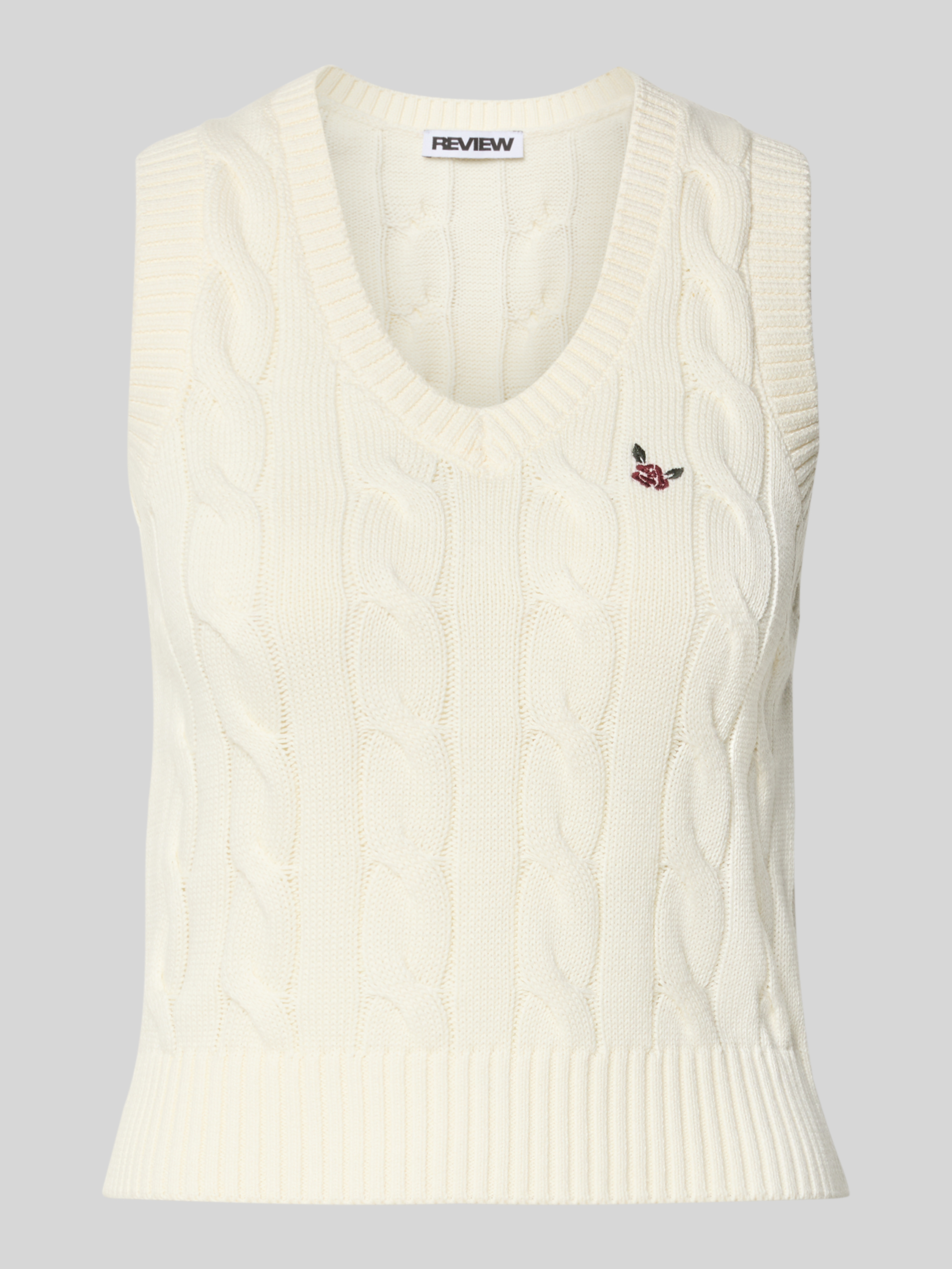 Der Damen Pullunder von Review verbindet klassisches Zopfmuster mit moderner Slim Fit-Silhouette. Reine Baumwolle sorgt für ein angenehmes Gefühl auf der Haut und unterstützt ein komfortables Trageerlebnis im Alltag. Durch den V-Ausschnitt eignet sich das Modell vielseitig zum Kombinieren unterschiedlicher Looks.