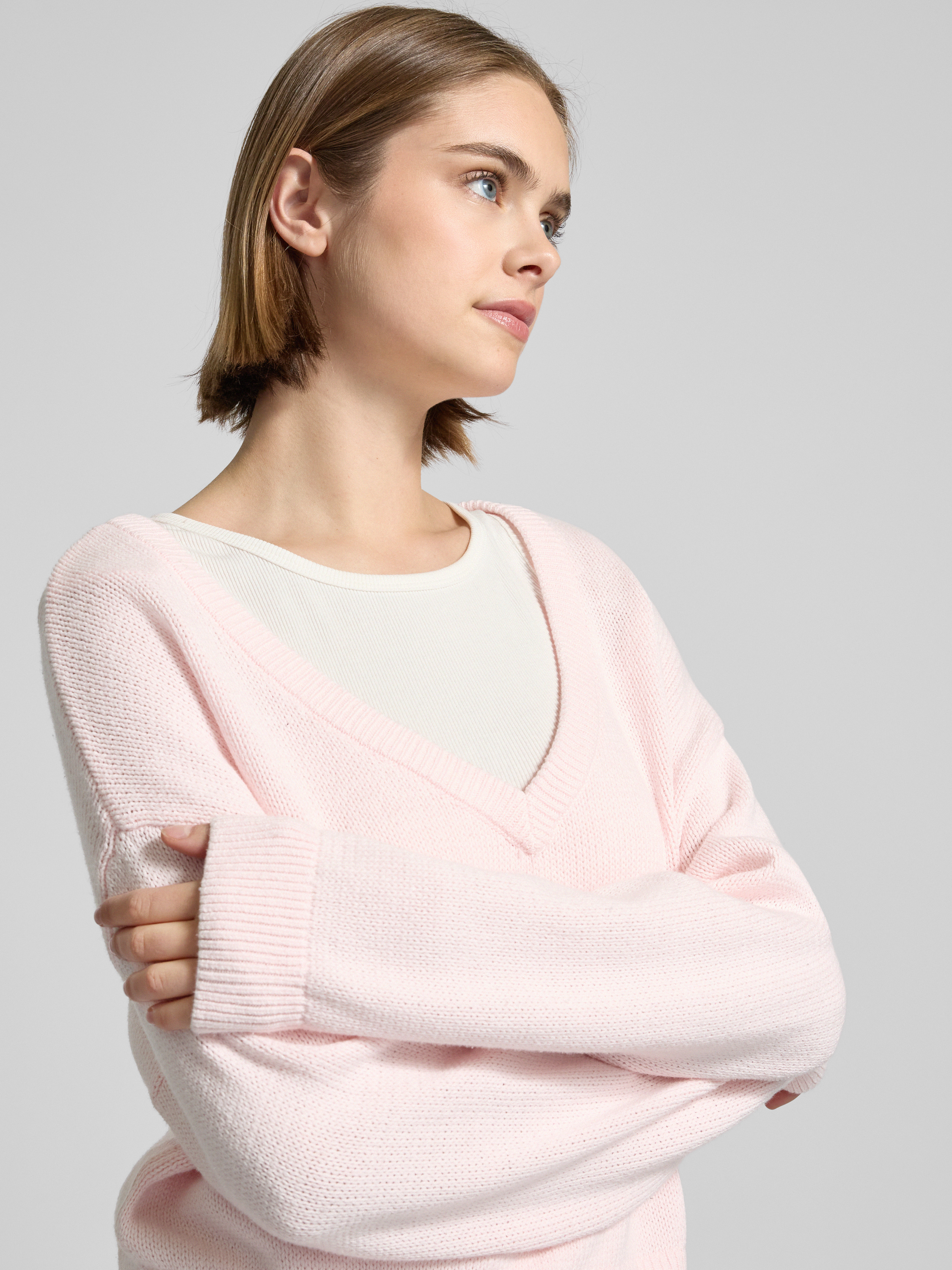 Der Damen Strickpullover von REVIEW kombiniert einen lockeren Schnitt mit einem eleganten V-Ausschnitt, was ihm eine lässige und zugleich stilvolle Note verleiht. Der Baumwoll-Mix sorgt für ein angenehmes Tragegefühl, während gerippte Abschlüsse dem Design Struktur und Form geben. Ideal für entspannte Tage, an denen Komfort im Vordergrund steht.