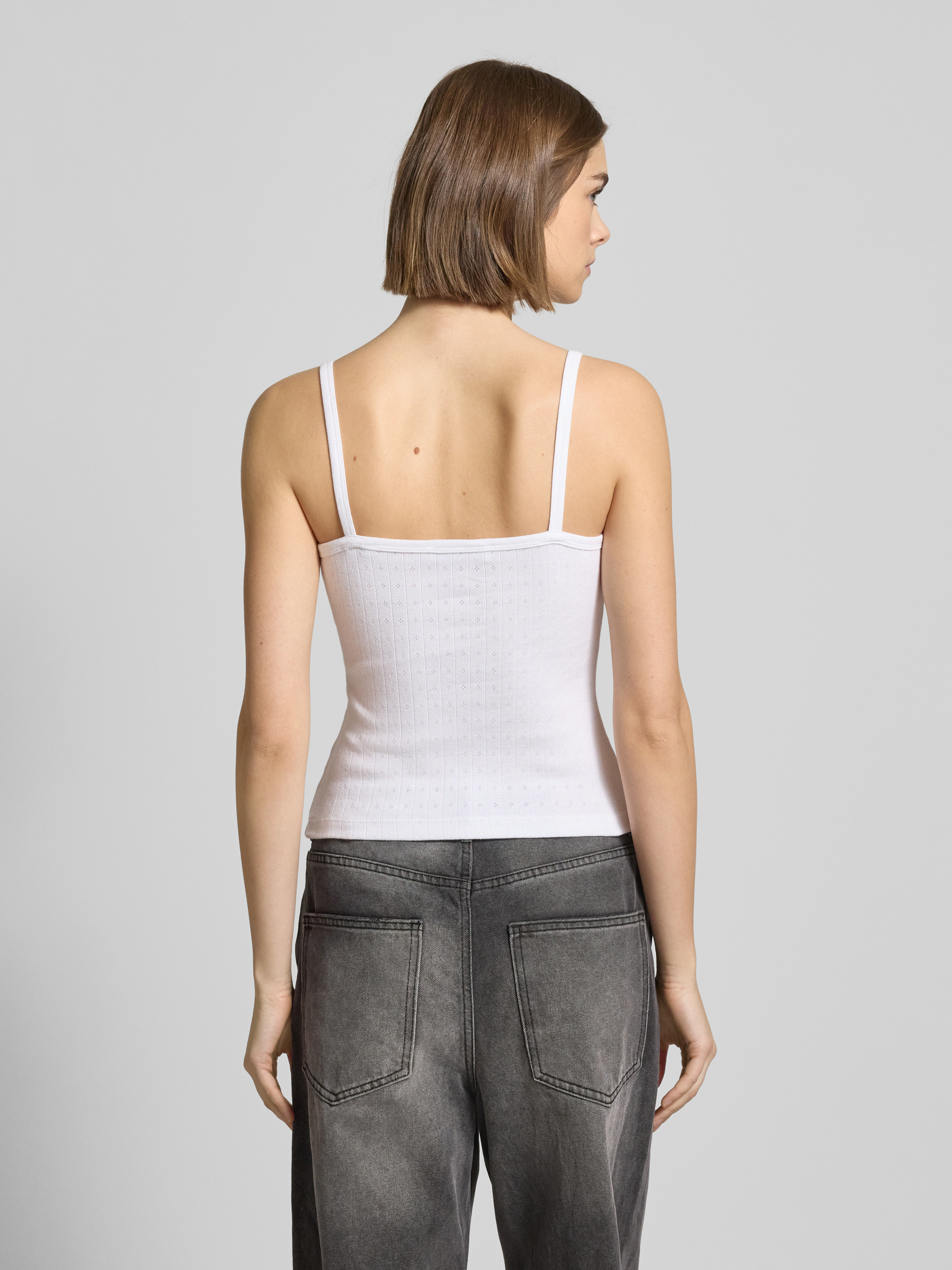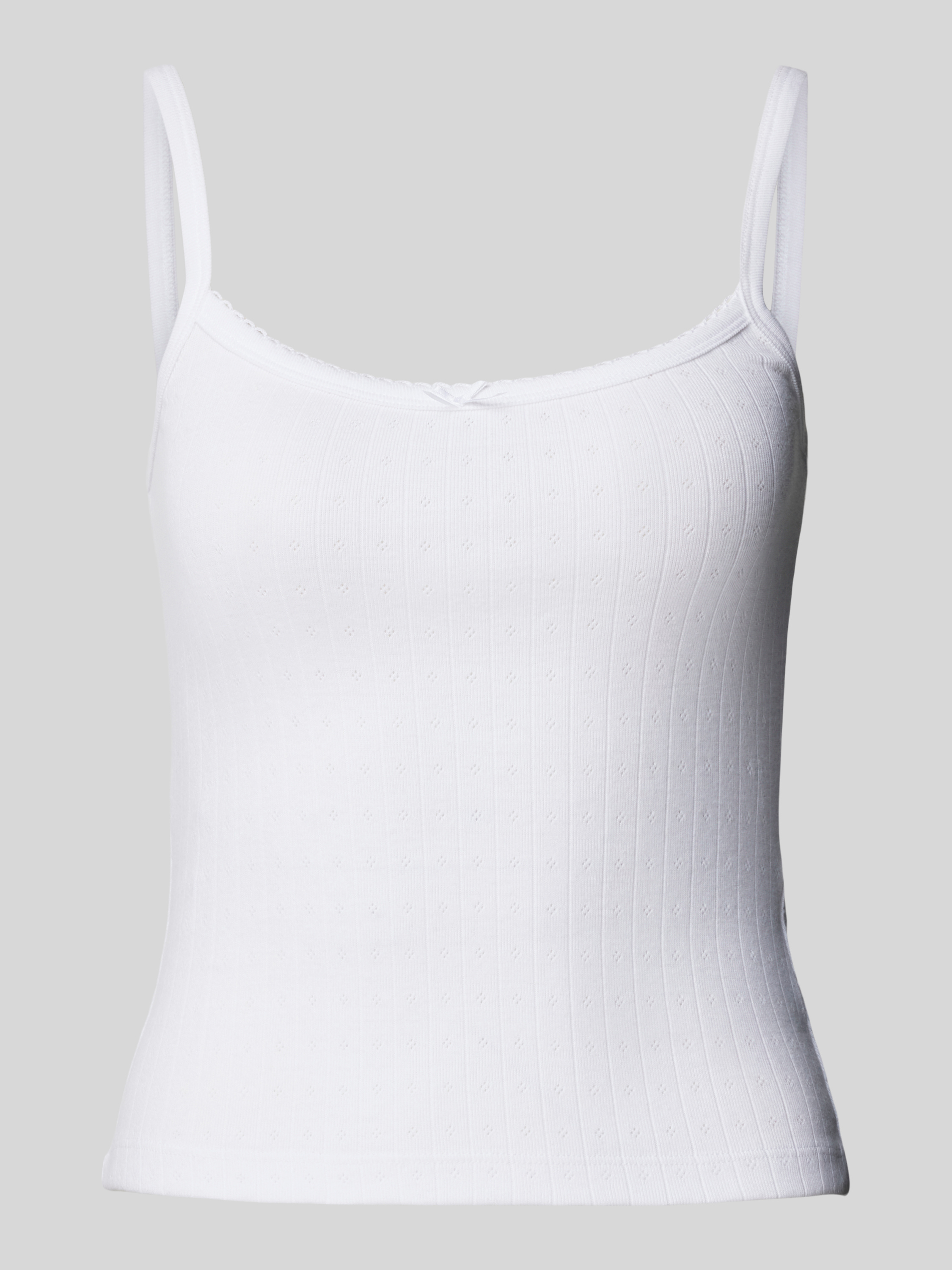 Das Top von REVIEW, aus reiner Baumwolle gefertigt, kombiniert einen körpernahen Schnitt mit zarten Spaghettiträgern und einem charmanten Schleifen-Detail. Der U-Boot-Ausschnitt ergänzt den Spitzenbesatz elegant und schafft so ein feminines Gesamtbild. Ein vielseitiges Kleidungsstück, das sich ideal für verschiedenste Anlässe eignet.