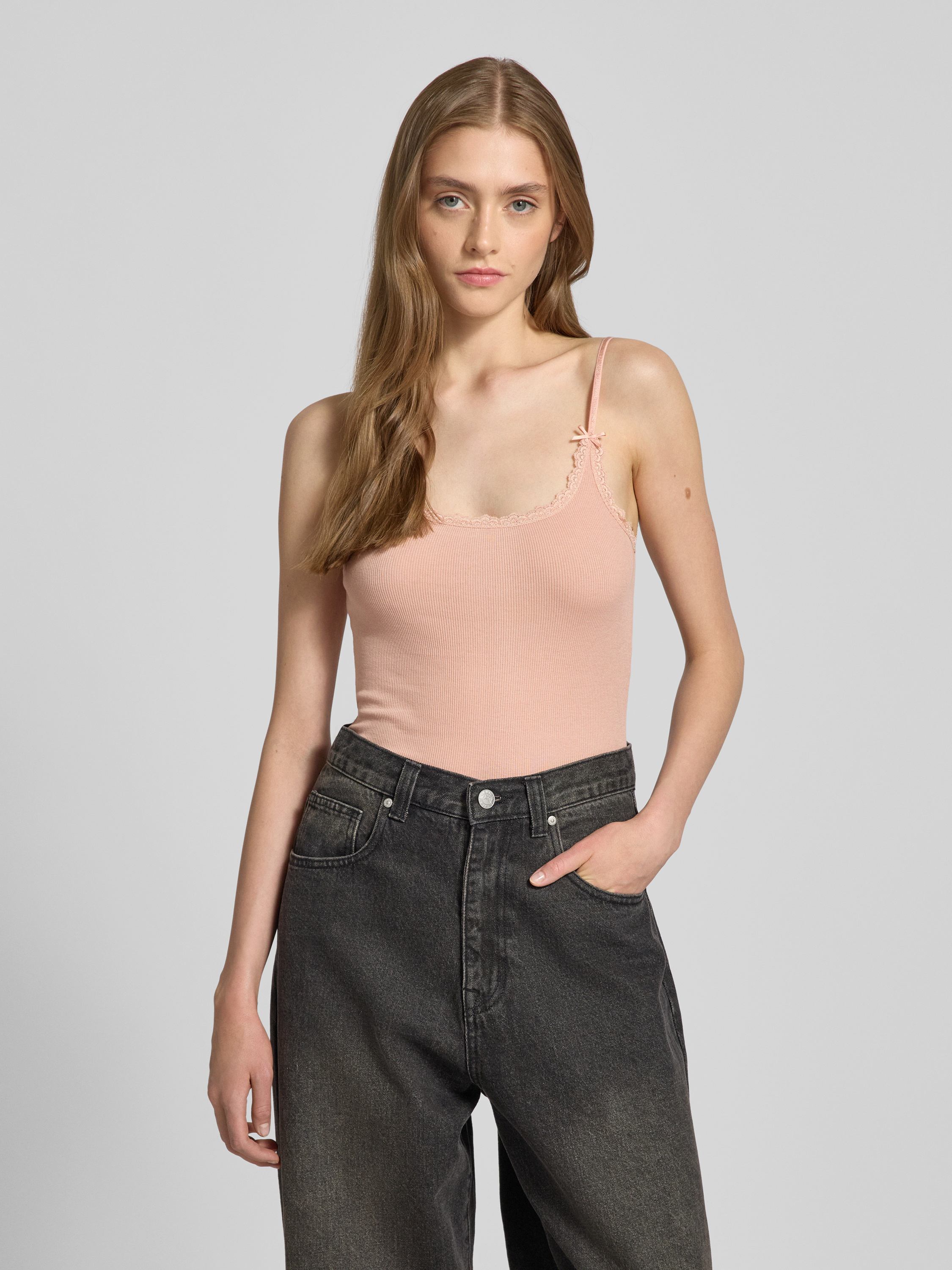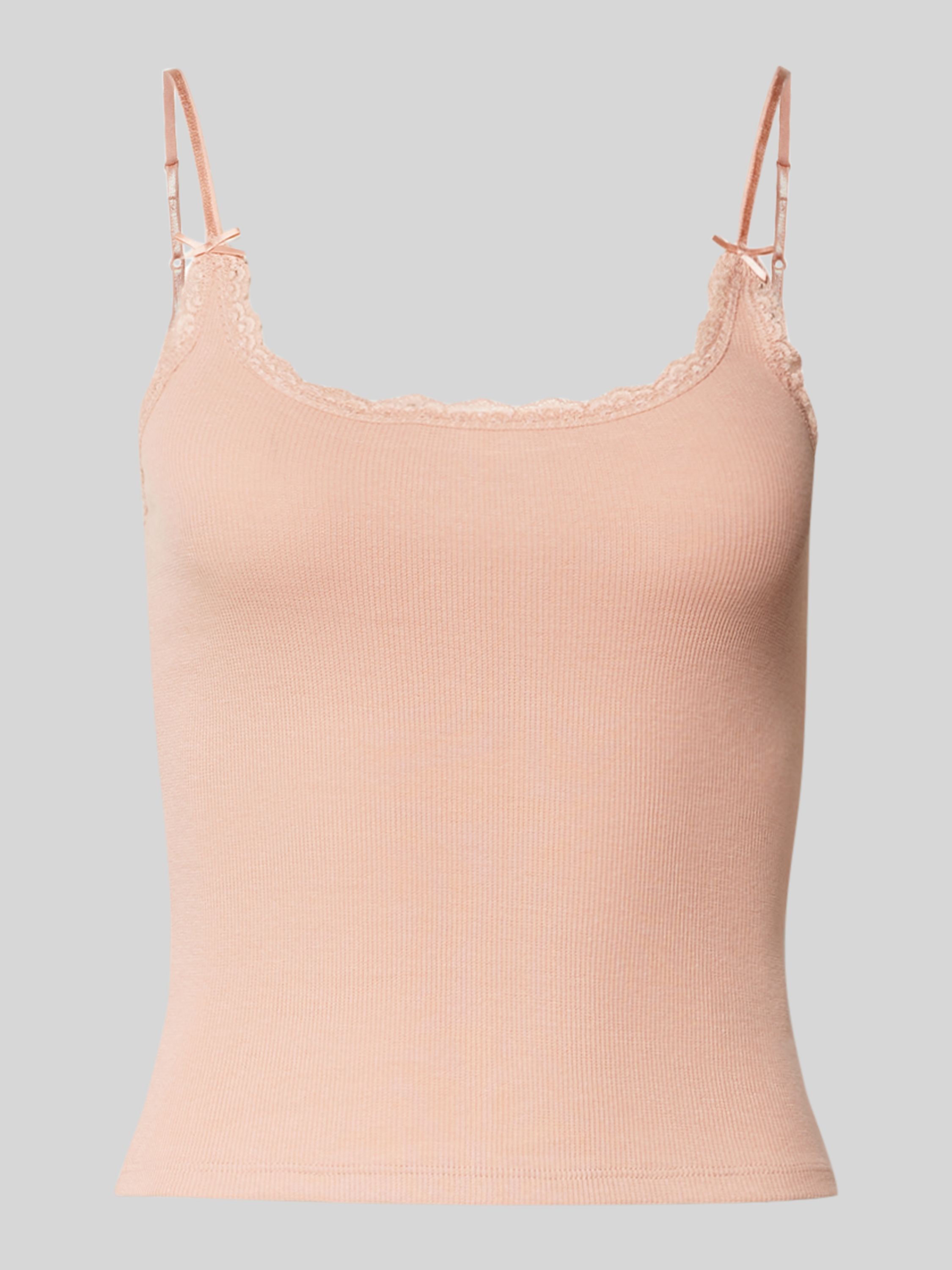Das Trägertop von Review kombiniert einen körpernahen Schnitt mit zarten Spaghettiträgern und einem stilvollen Spitzenbesatz. Der Baumwoll-Elasthan-Mix sorgt für eine angenehme Passform, während die Ripp-Optik dem Design eine interessante Struktur verleiht. Ideal für verschiedene Anlässe geeignet.