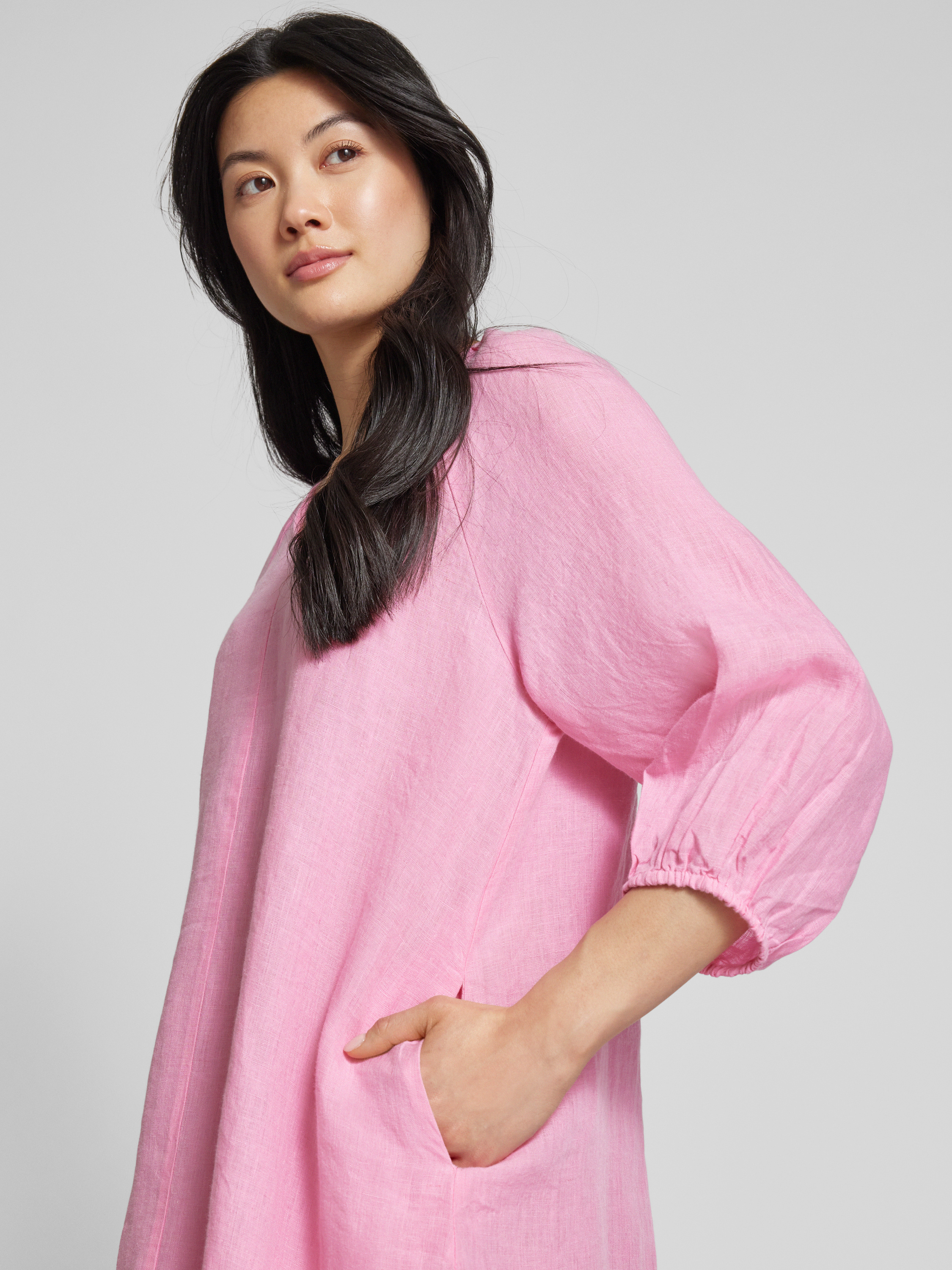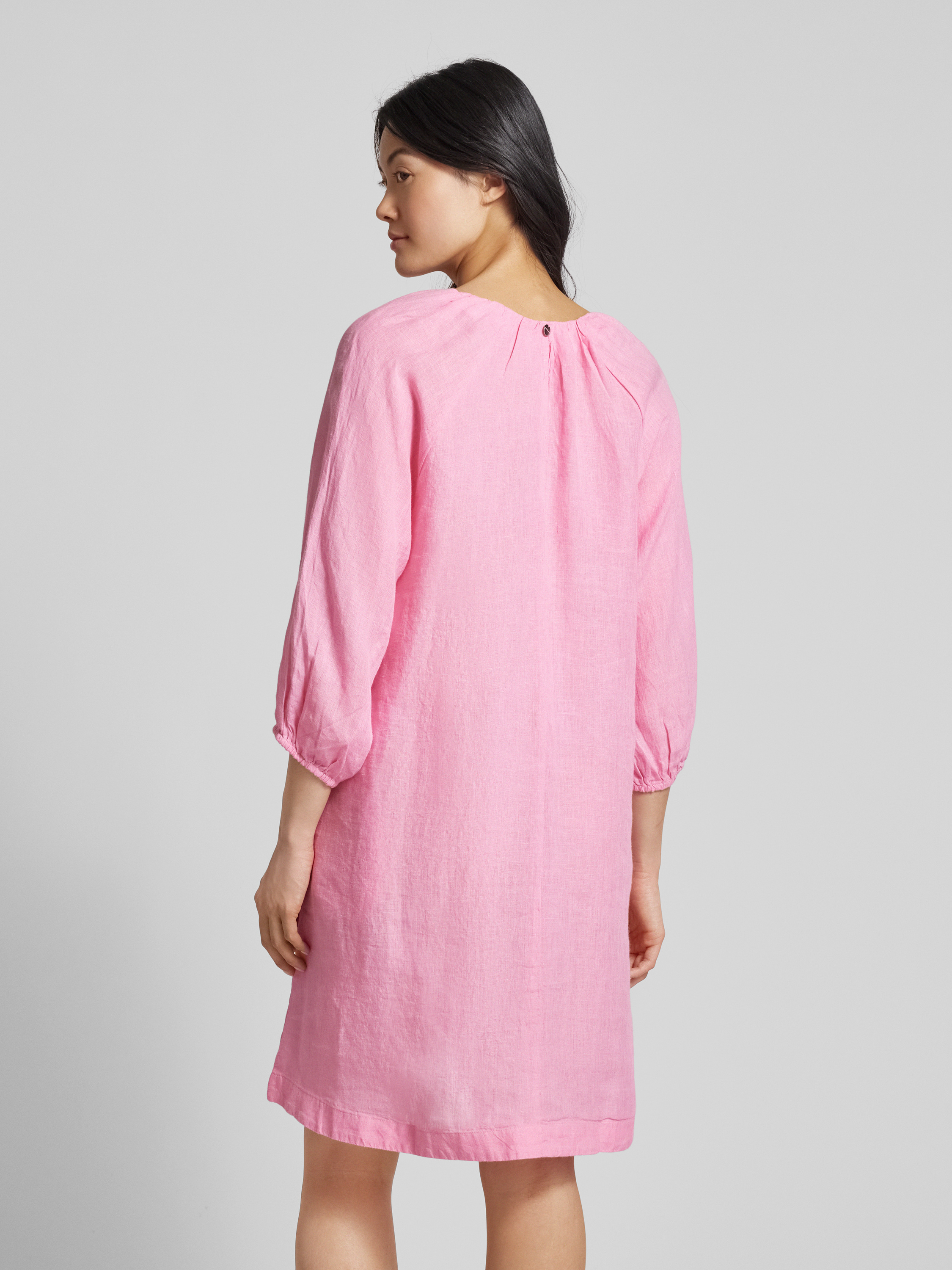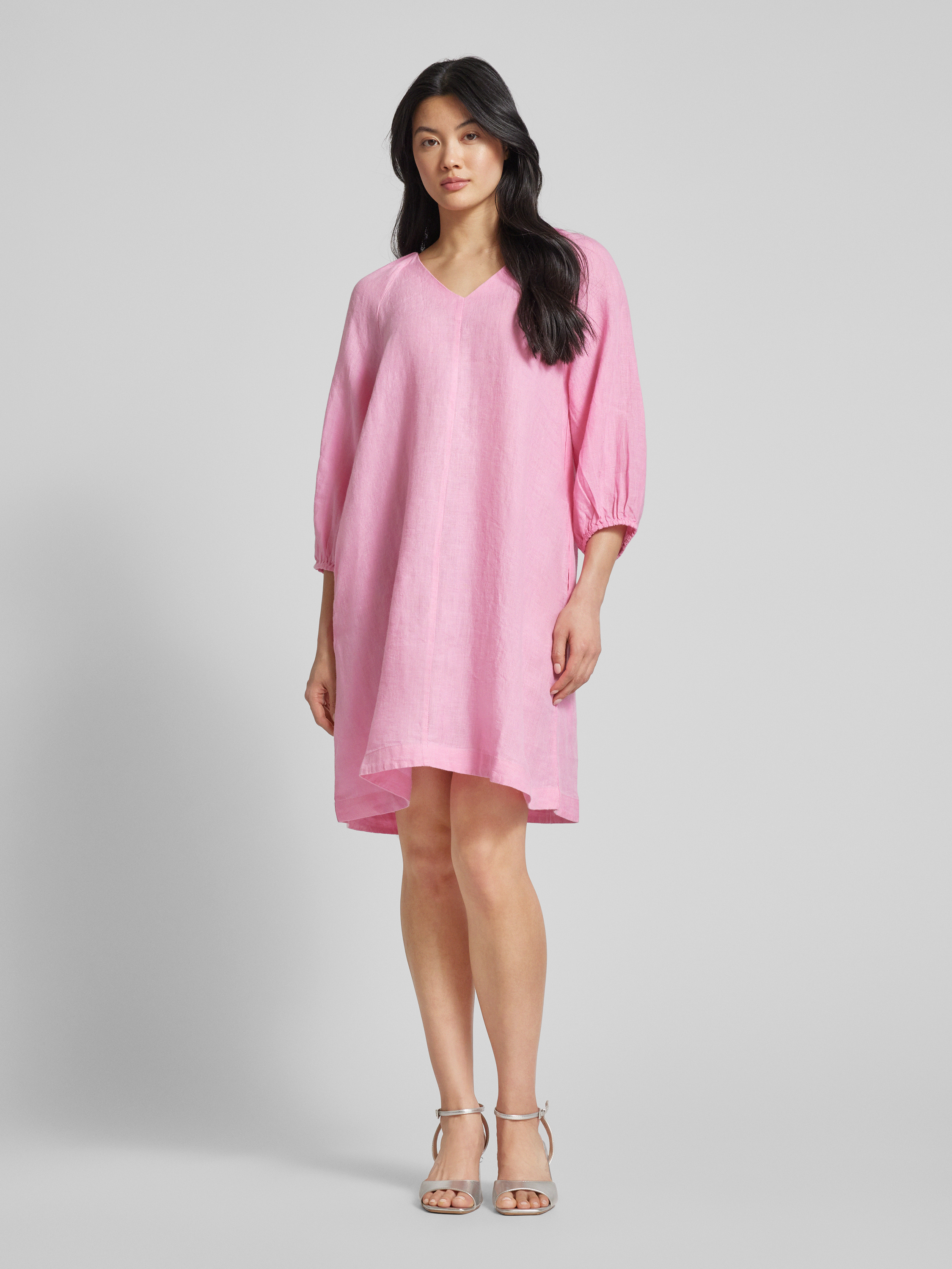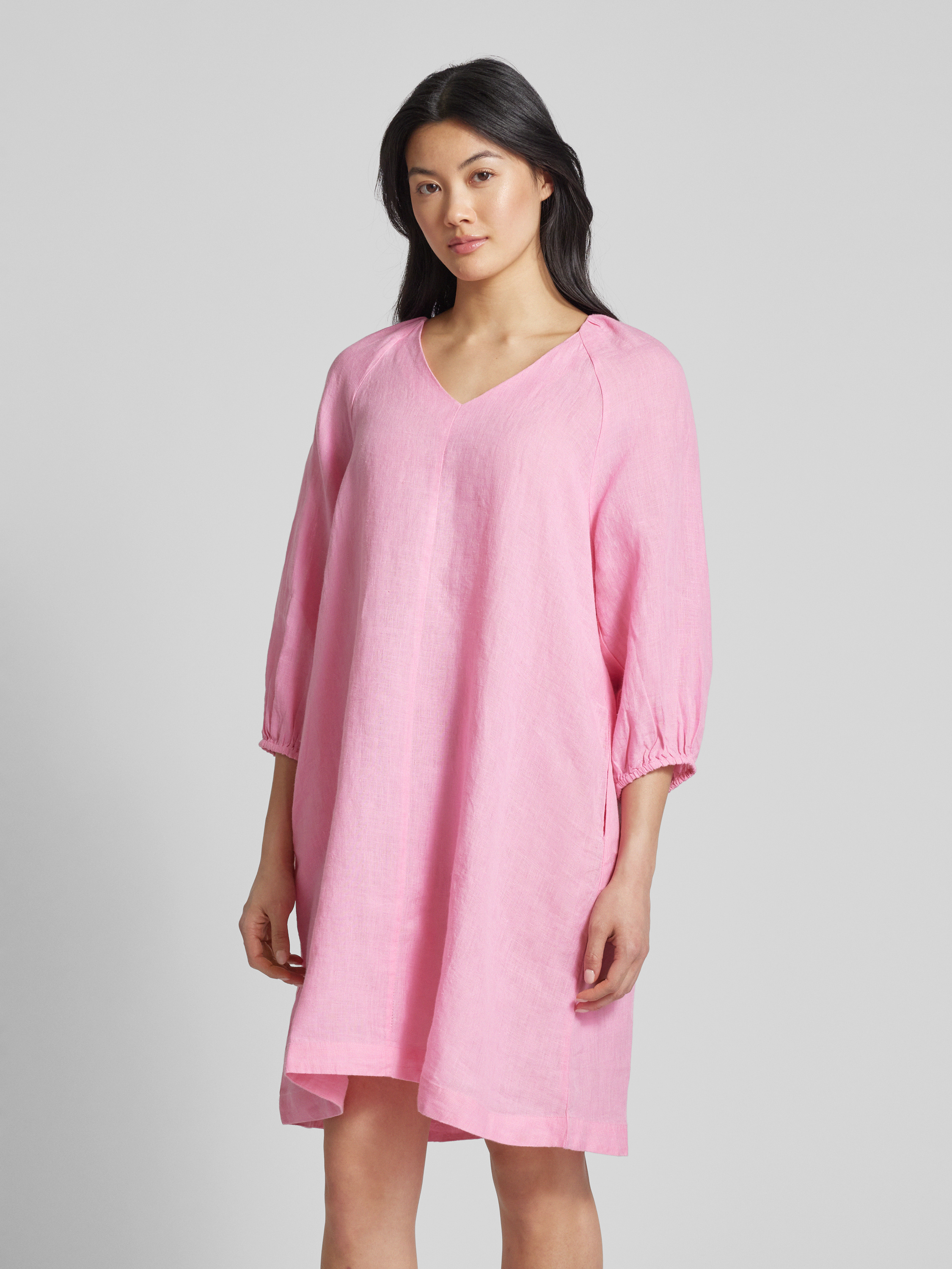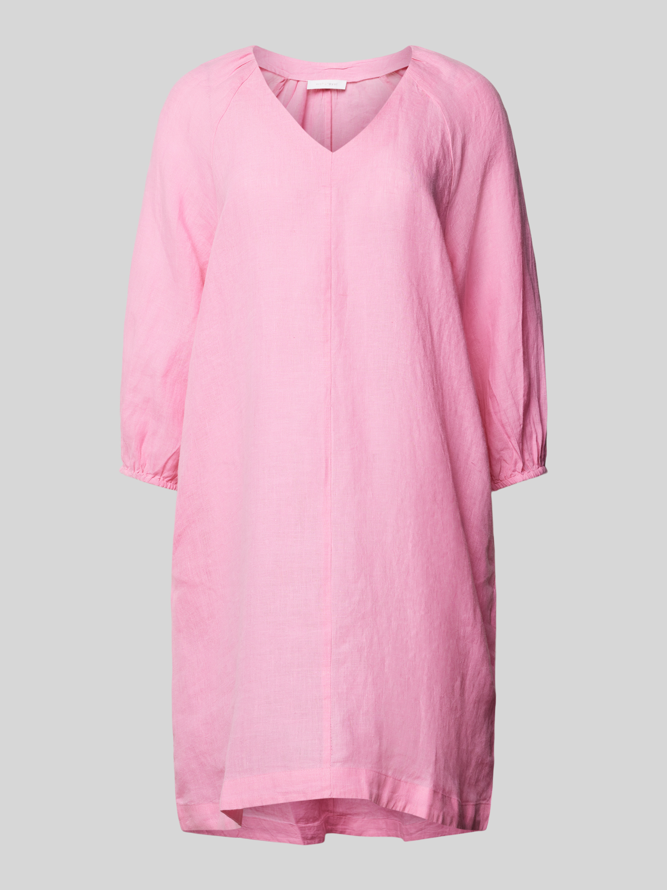 Das Leinenkleid von Rich & Royal aus reinem Leinen verbindet einen lockeren Schnitt mit knielangem Design, was eine bequeme Passform gewährleistet. Der V-Ausschnitt und die 3/4-Ärmel verleihen dem unifarbenen Kleid eine dezente Eleganz, die vielseitig einsetzbar ist. Ideal für warme Tage.