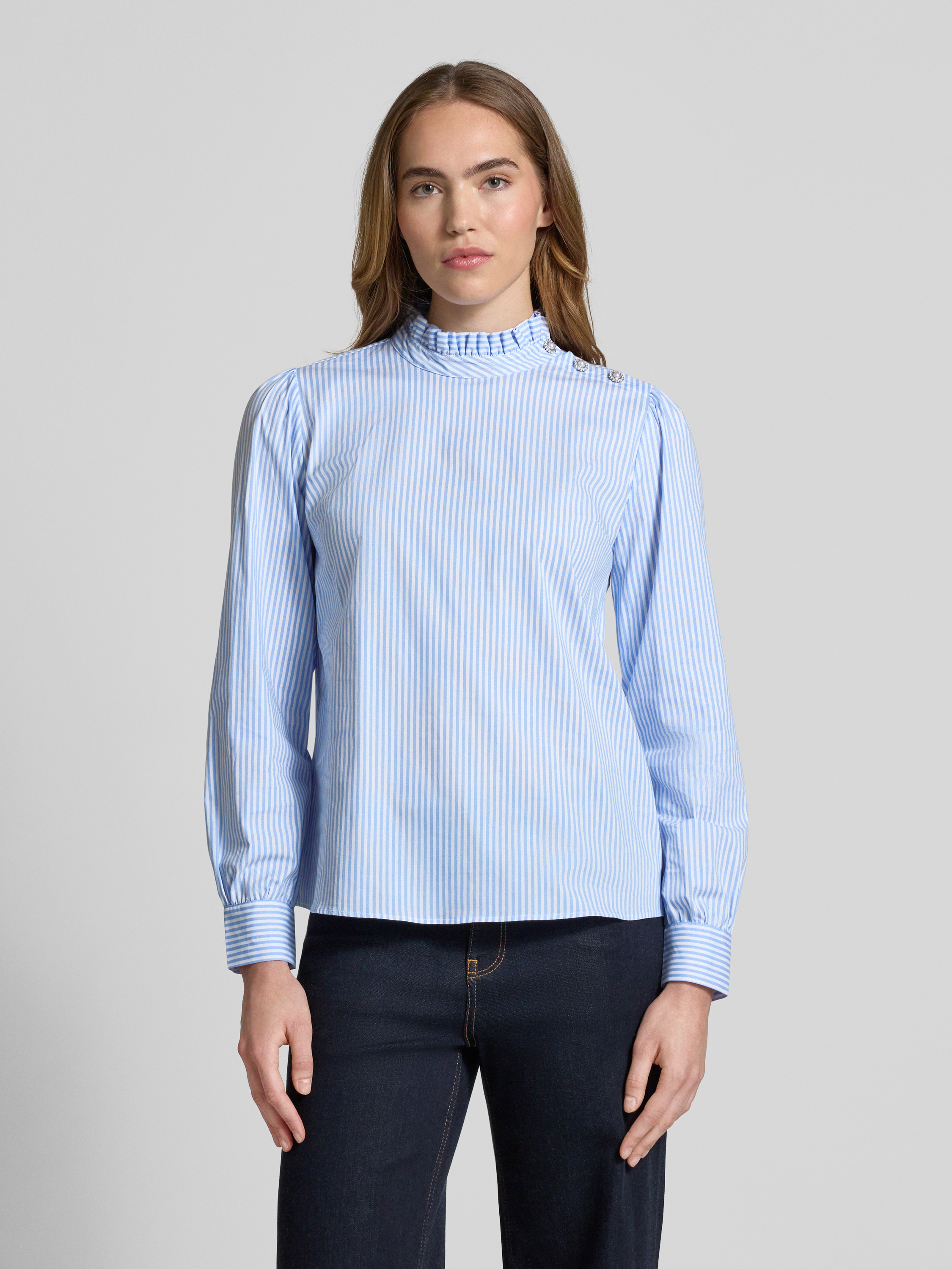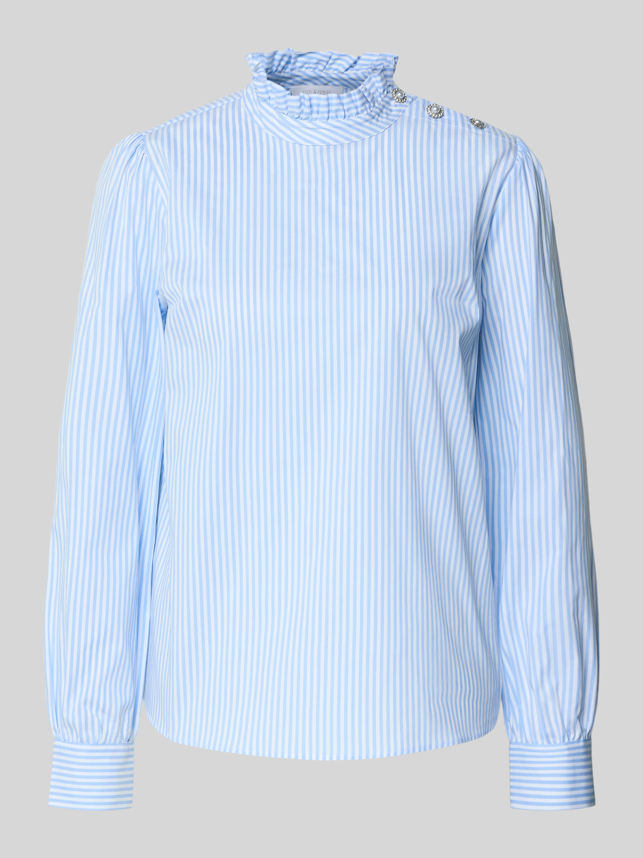 Die Regular Fit Bluse von Rich & Royal verbindet einen elastischen Baumwoll-Mix mit einem geradlinigen Schnitt, wodurch Bewegungsfreiheit im Alltag entsteht. Rüschen am Stehkragen und florale Knopf-Applikationen mit Strassteinbesatz setzen dezente Akzente. Das langärmelige Design eignet sich gleichermaßen für Büro und Freizeit.