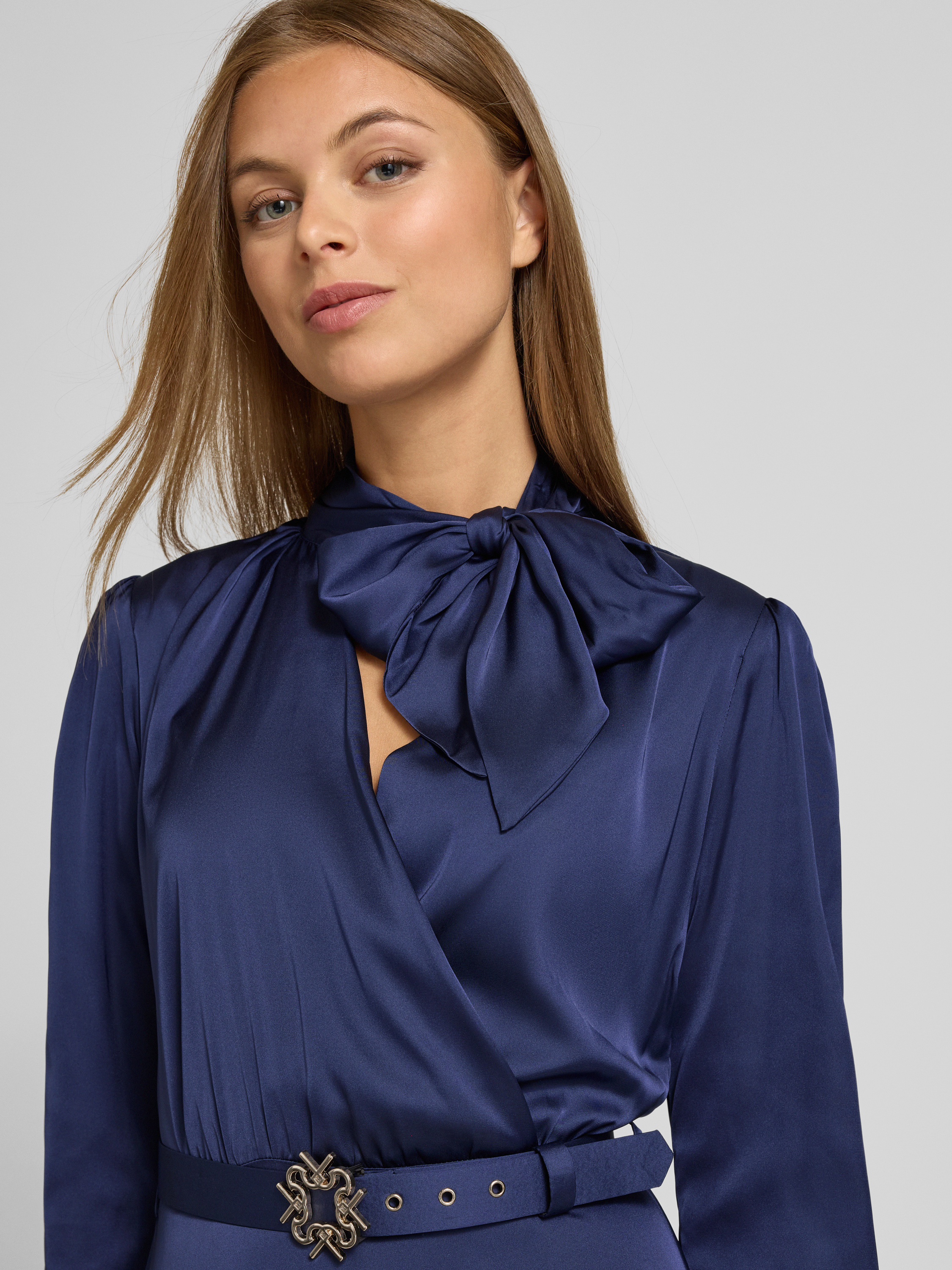 Das Damen Abendkleid von Rinascimento zeigt sich mit taillierter Passform und schmeichelnder Wickel-Optik. Der abnehmbare Ziergürtel betont die Silhouette, während der Stehkragen mit Zierschleife und die eingefassten Ärmelabschlüsse dem Modell einen eleganten Rahmen verleihen. Ein vielseitiges Design, das sich für festliche Anlässe eignet.