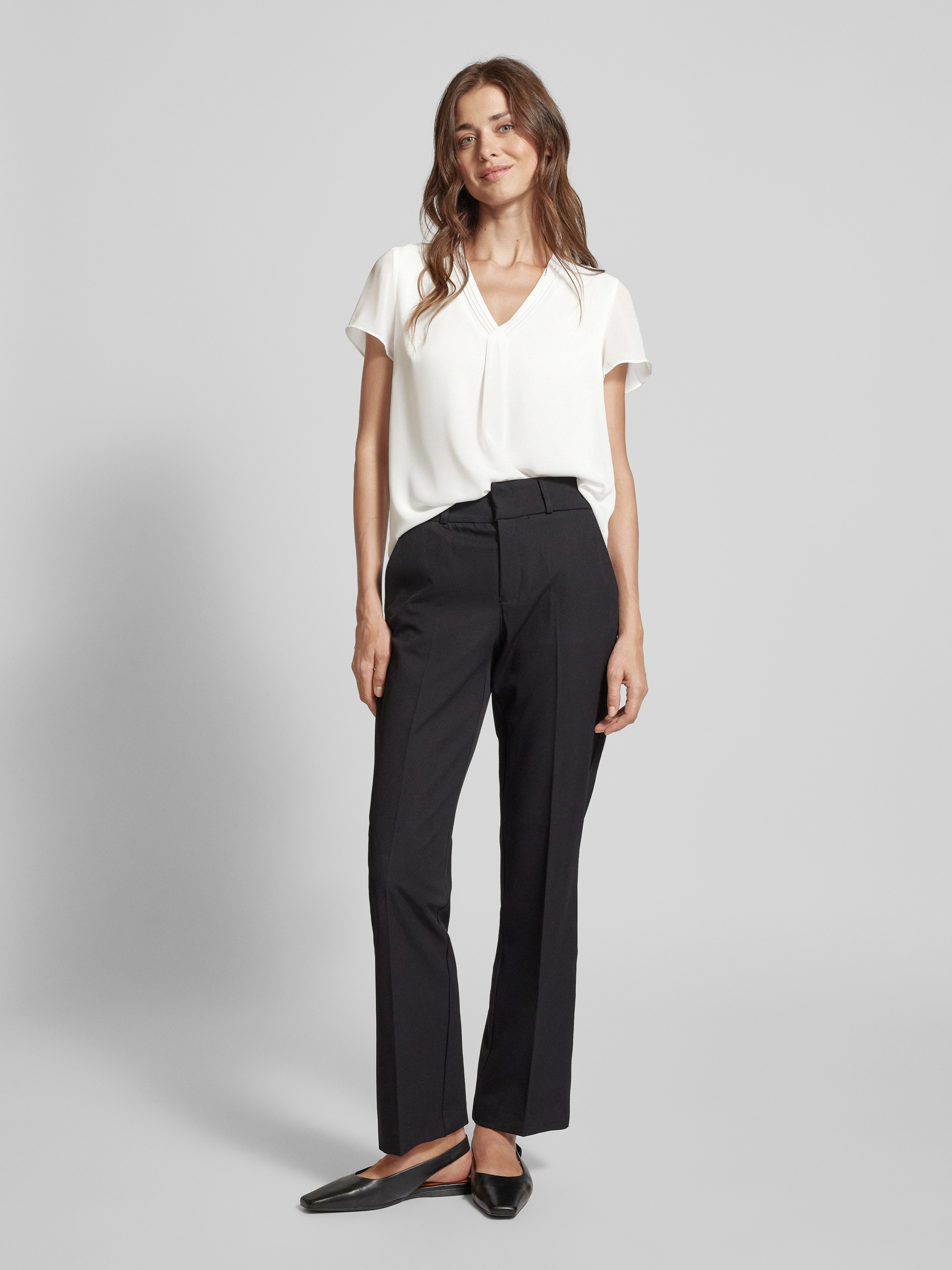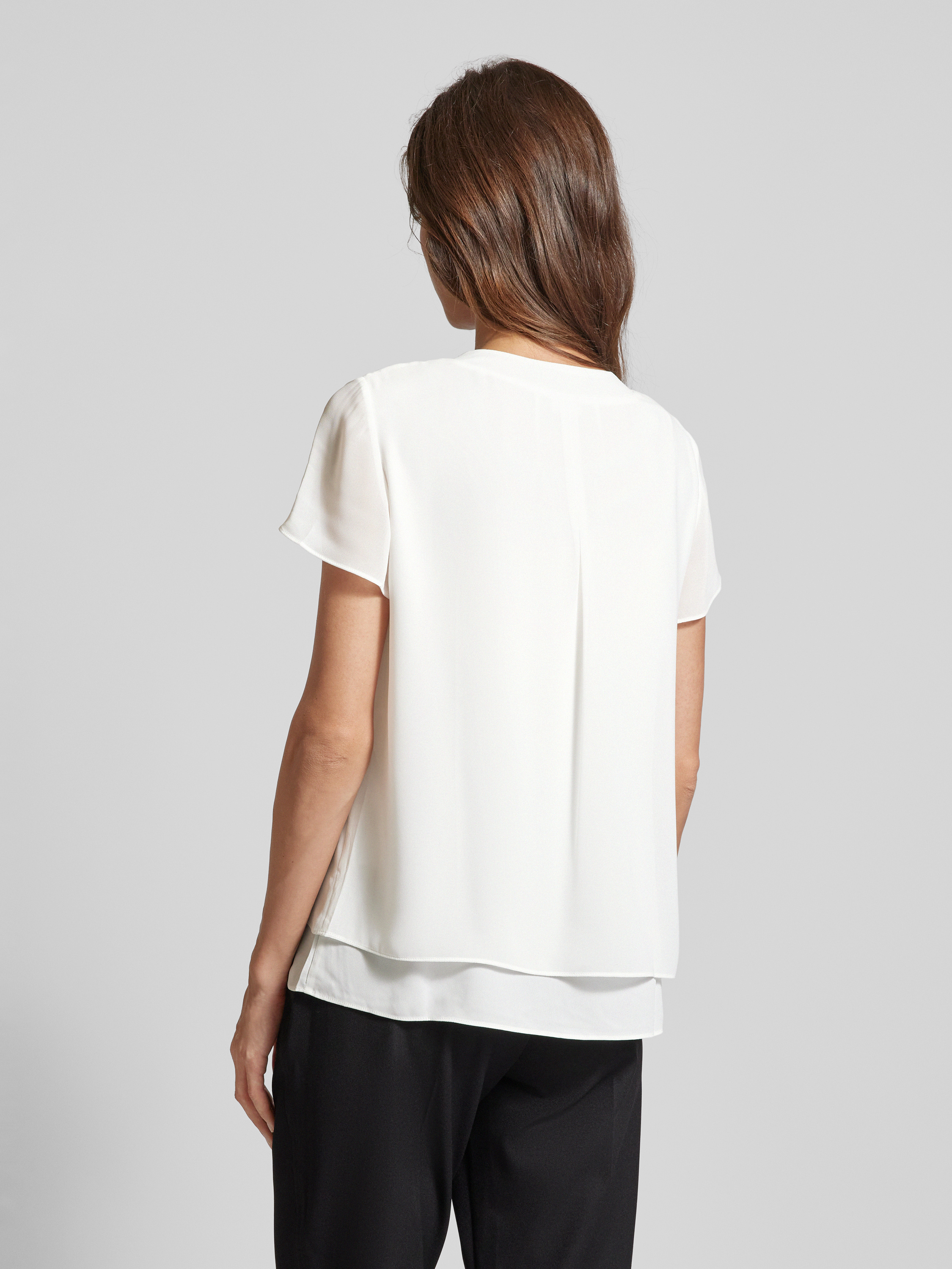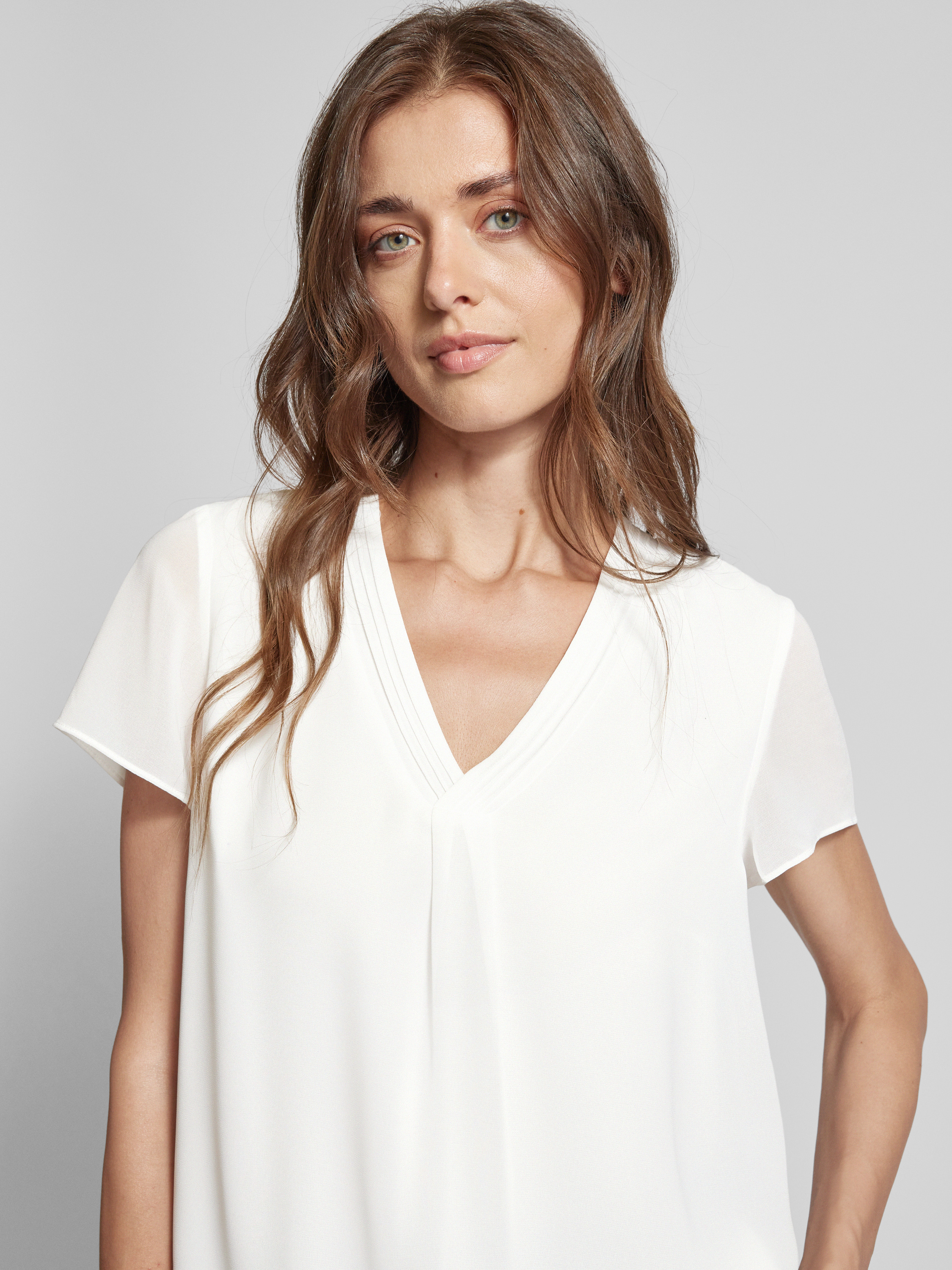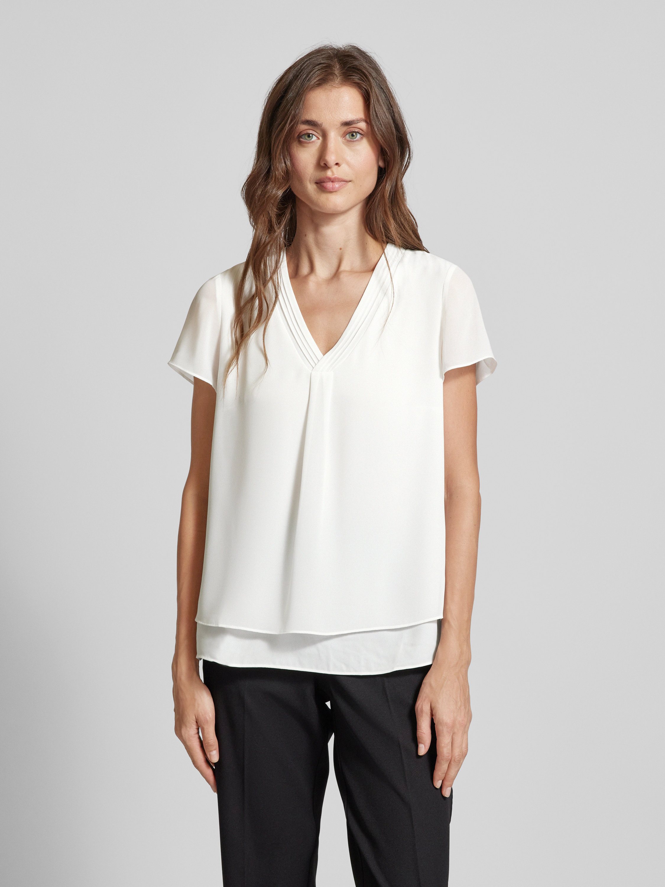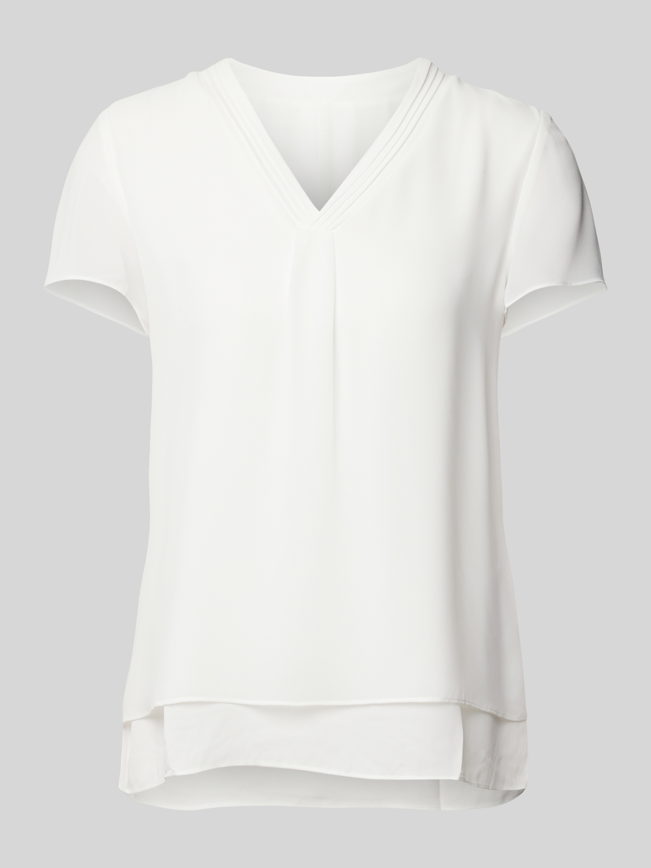 Das Blusenshirt von s.Oliver BLACK LABEL vereint eine gerade Passform mit einem eleganten V-Ausschnitt, wodurch es vielseitig kombinierbar wird. Die semitransparente Optik und gelegte Falten verleihen dem kurzärmeligen Design eine subtile Raffinesse. Ein idealer Begleiter für stilvolle Alltagsmomente.
