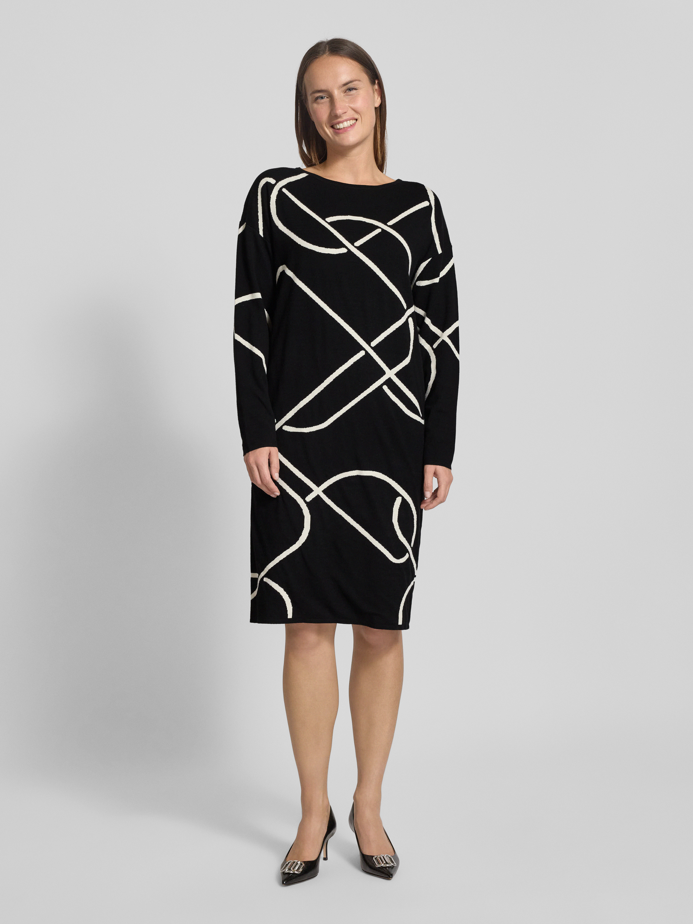 Das Damen Strickkleid von s.Oliver BLACK LABEL fällt durch sein abstraktes Allover-Muster und den knielangen Schnitt in Relaxed-Fit auf. Die weiche Strickverarbeitung mit Viskose-Mix sorgt für ein angenehmes Tragegefühl, während der Rundhals und die langen Ärmel den Alltag unkompliziert begleiten. So entsteht ein vielseitiges Kleidungsstück, das sich unkompliziert kombinieren lässt.