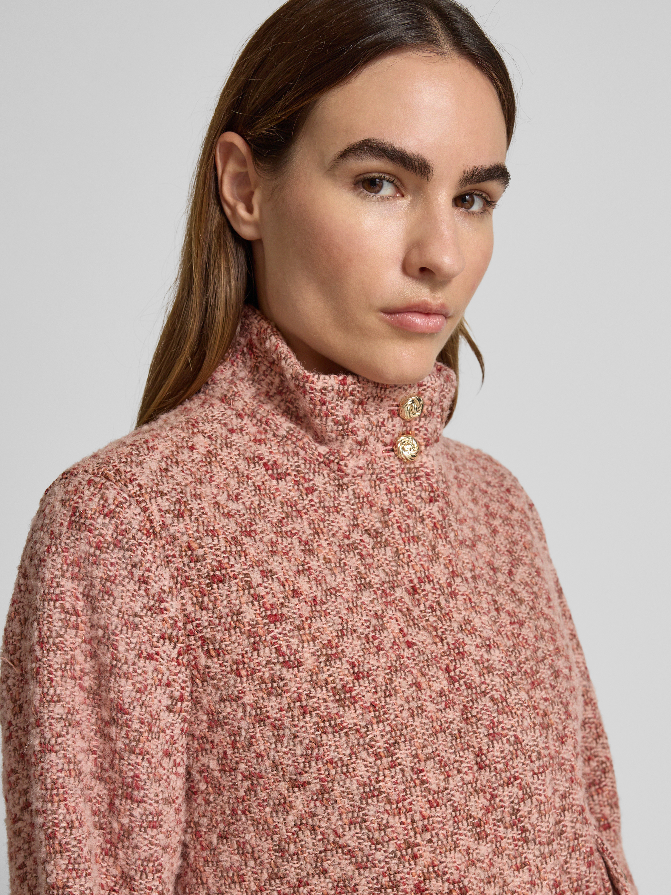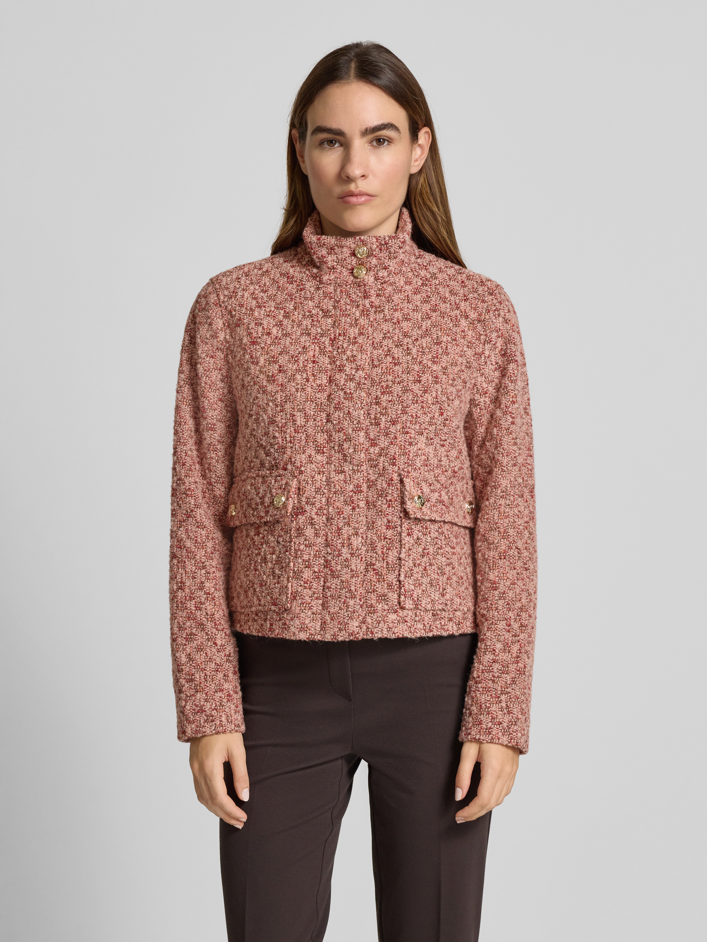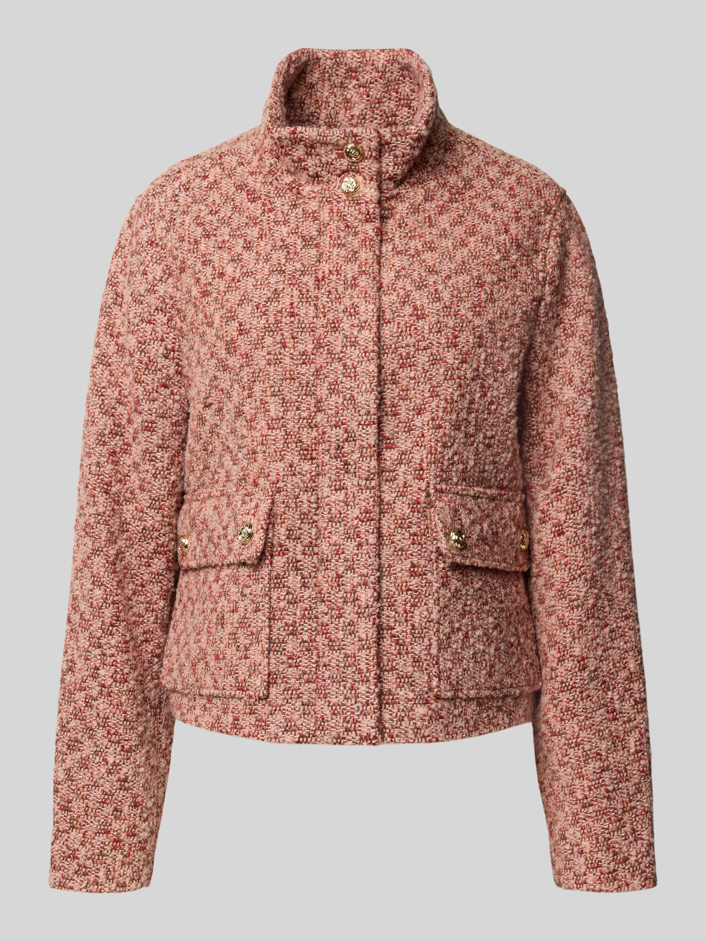 Der Damen Kurzblazer von s.Oliver BLACK LABEL verbindet einen modernen Regular Fit mit einer Melange-Optik und überzeugt durch die angenehme Haptik des Woll-Mix. Durch den Stehkragen und die Zierknöpfe entsteht ein dezenter Akzent, der vielseitige Kombinationen ermöglicht. Die Bouclé-Verarbeitung sorgt für Struktur und ein angenehmes Tragegefühl.