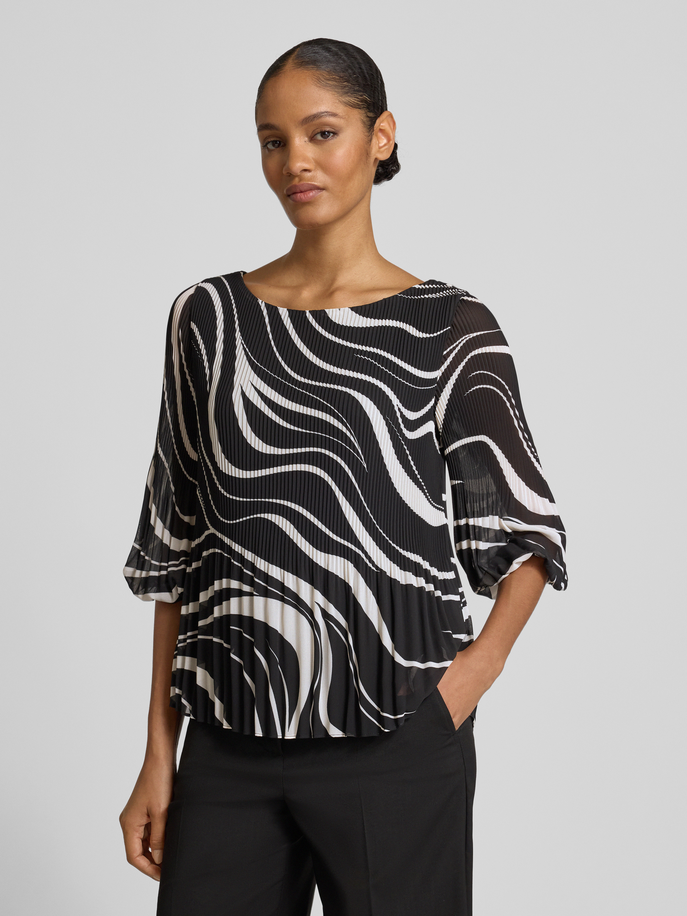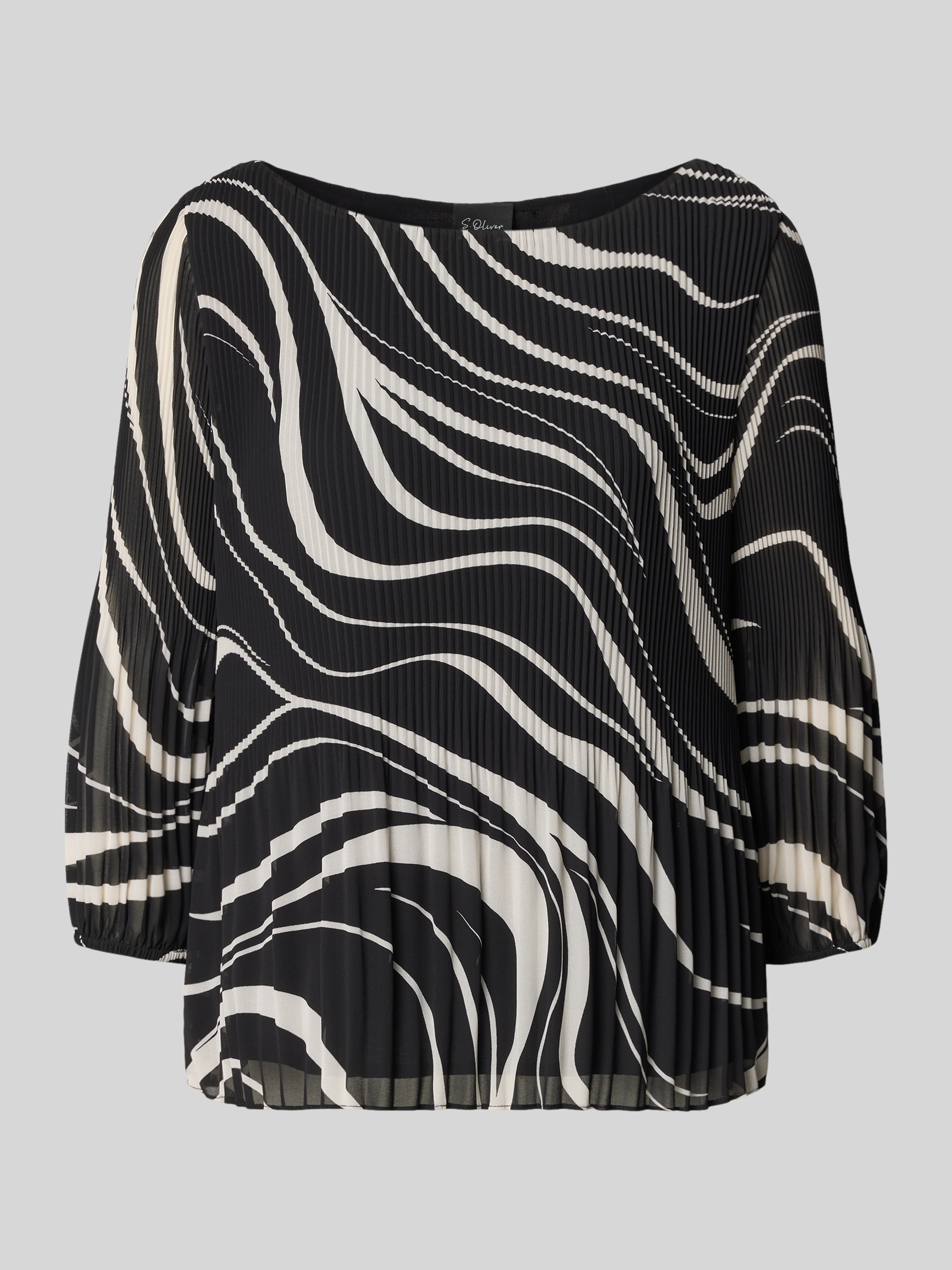Die Damen Langarmbluse von s.Oliver BLACK LABEL zeigt sich in abstraktem Allover-Muster und fällt durch ihren Regular Fit angenehm locker. Durch das fein gearbeitete Plissee erhält die Bluse eine besondere Struktur, während der U-Boot-Ausschnitt dezent das Dekolleté betont. Mit 3/4-Ärmeln und elastischem Abschluss lässt sich das Modell vielseitig kombinieren.