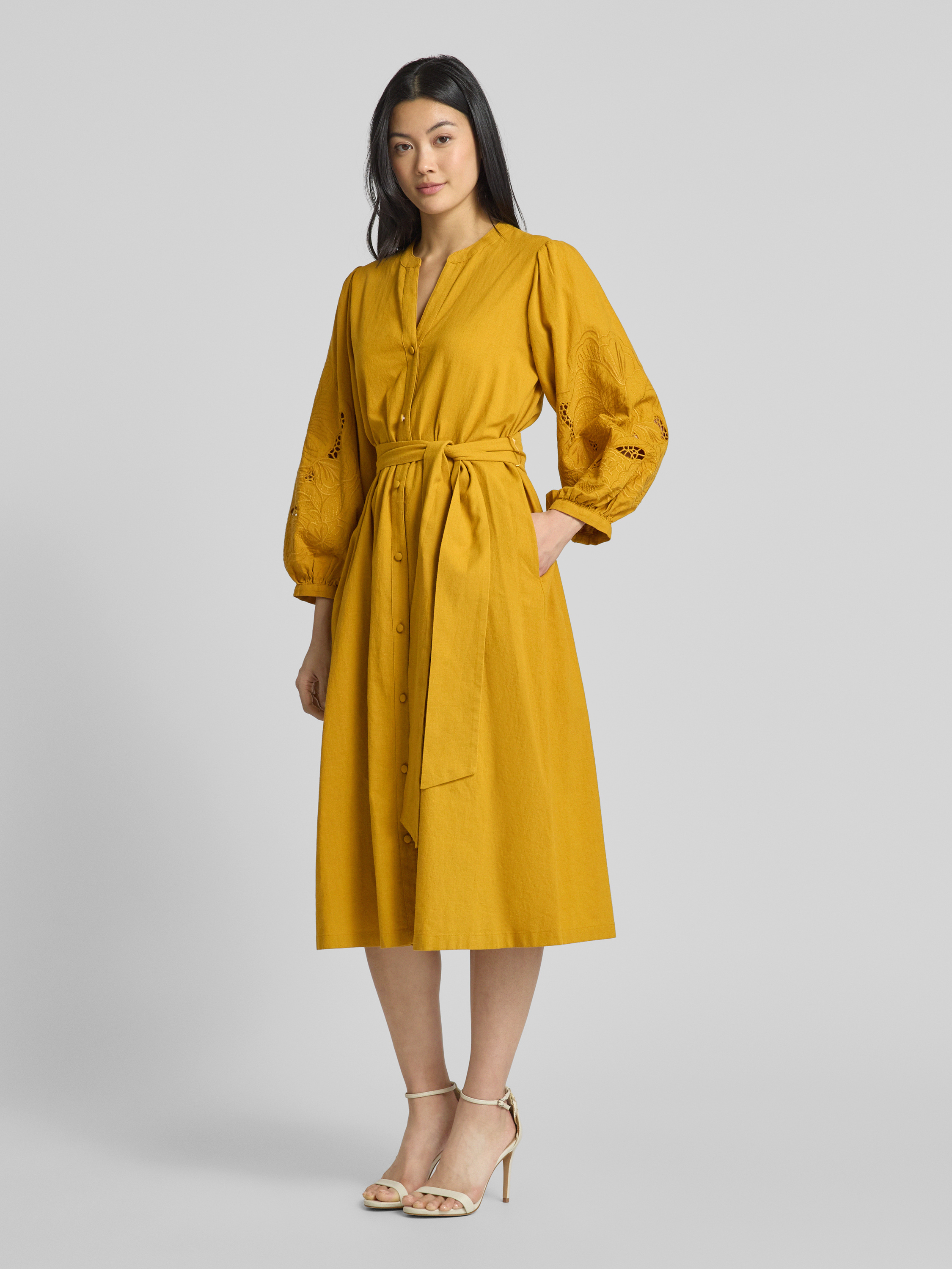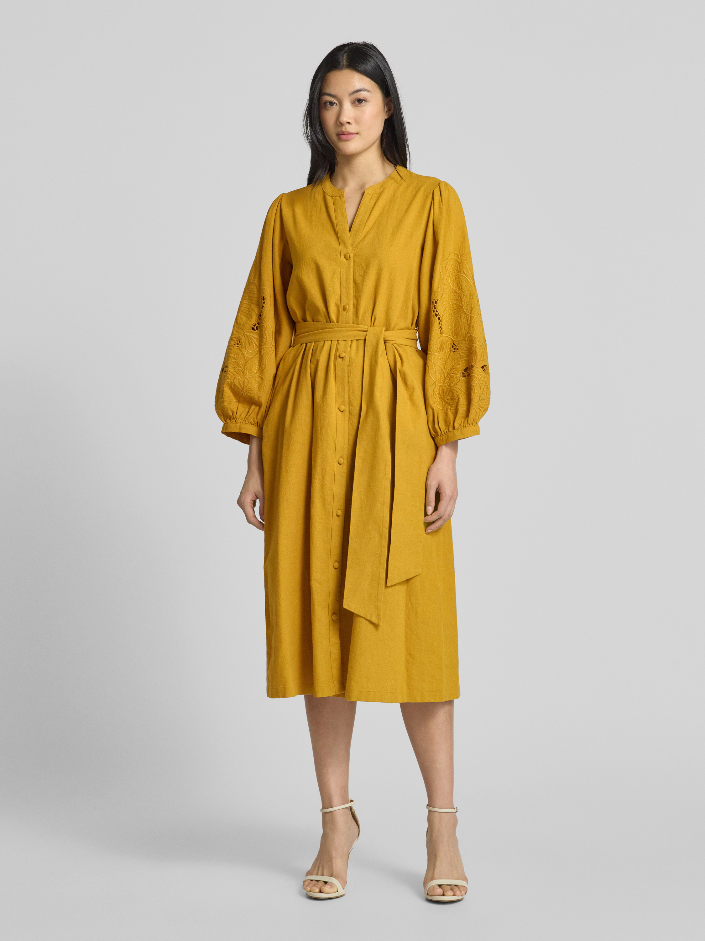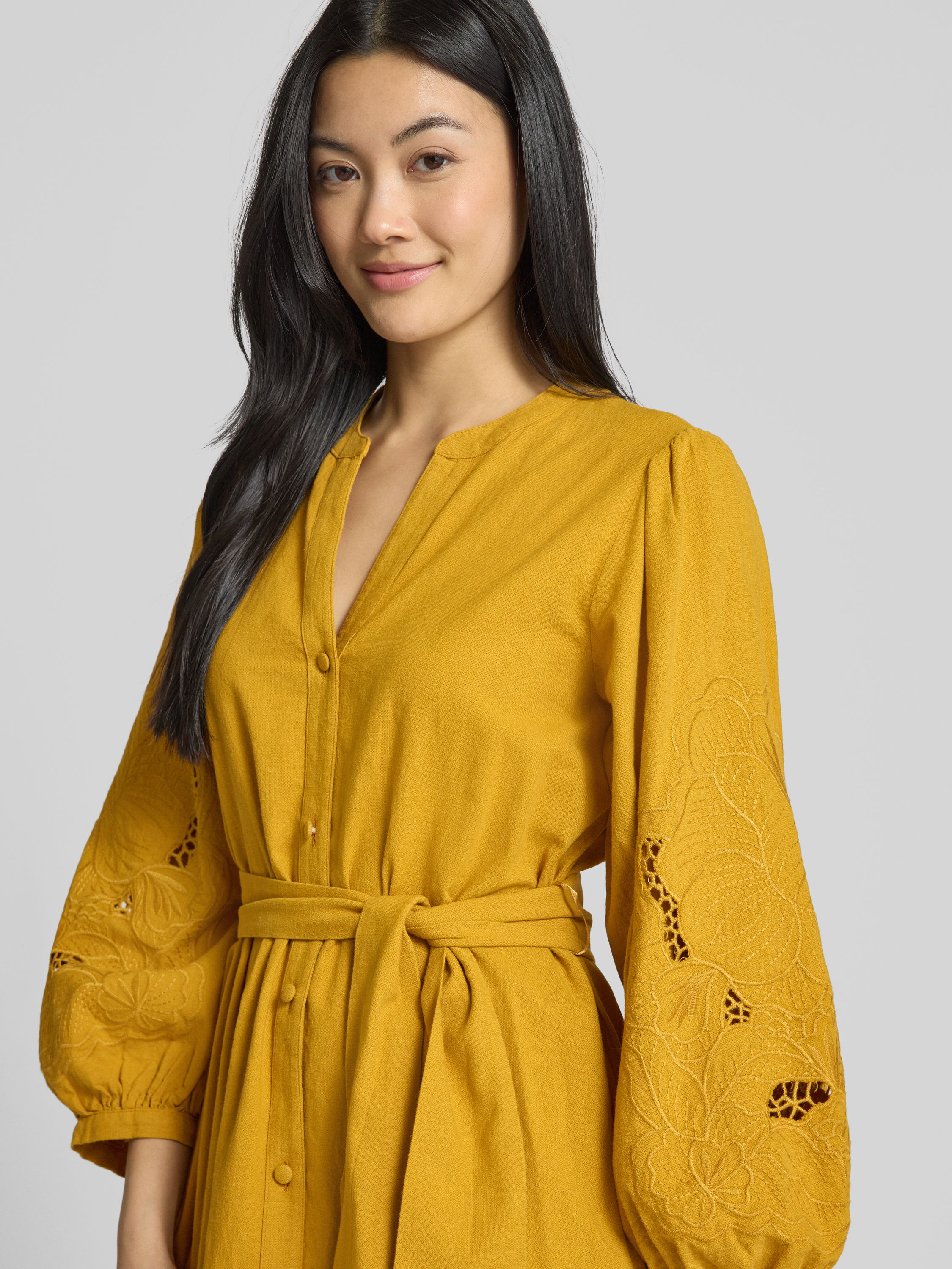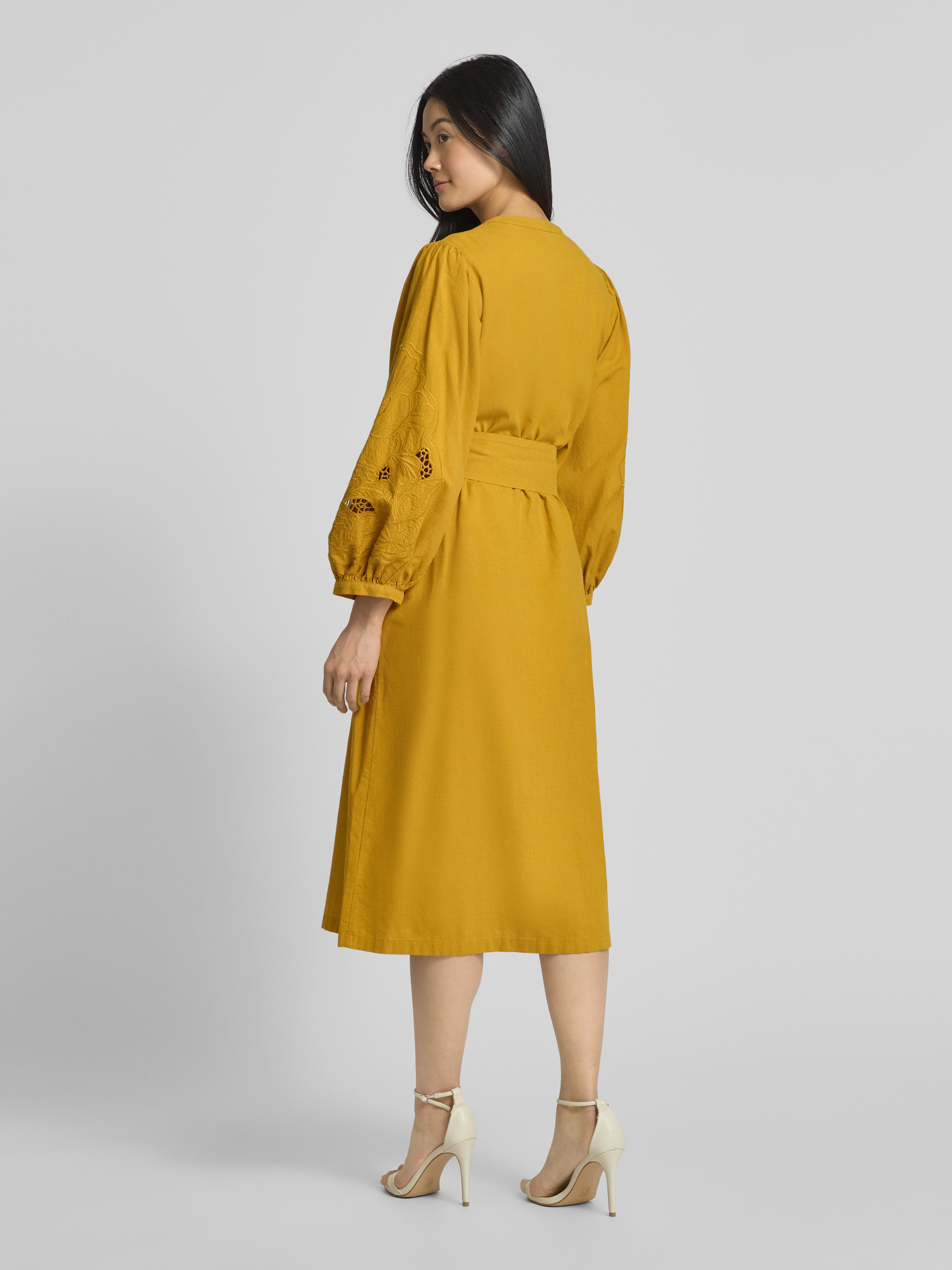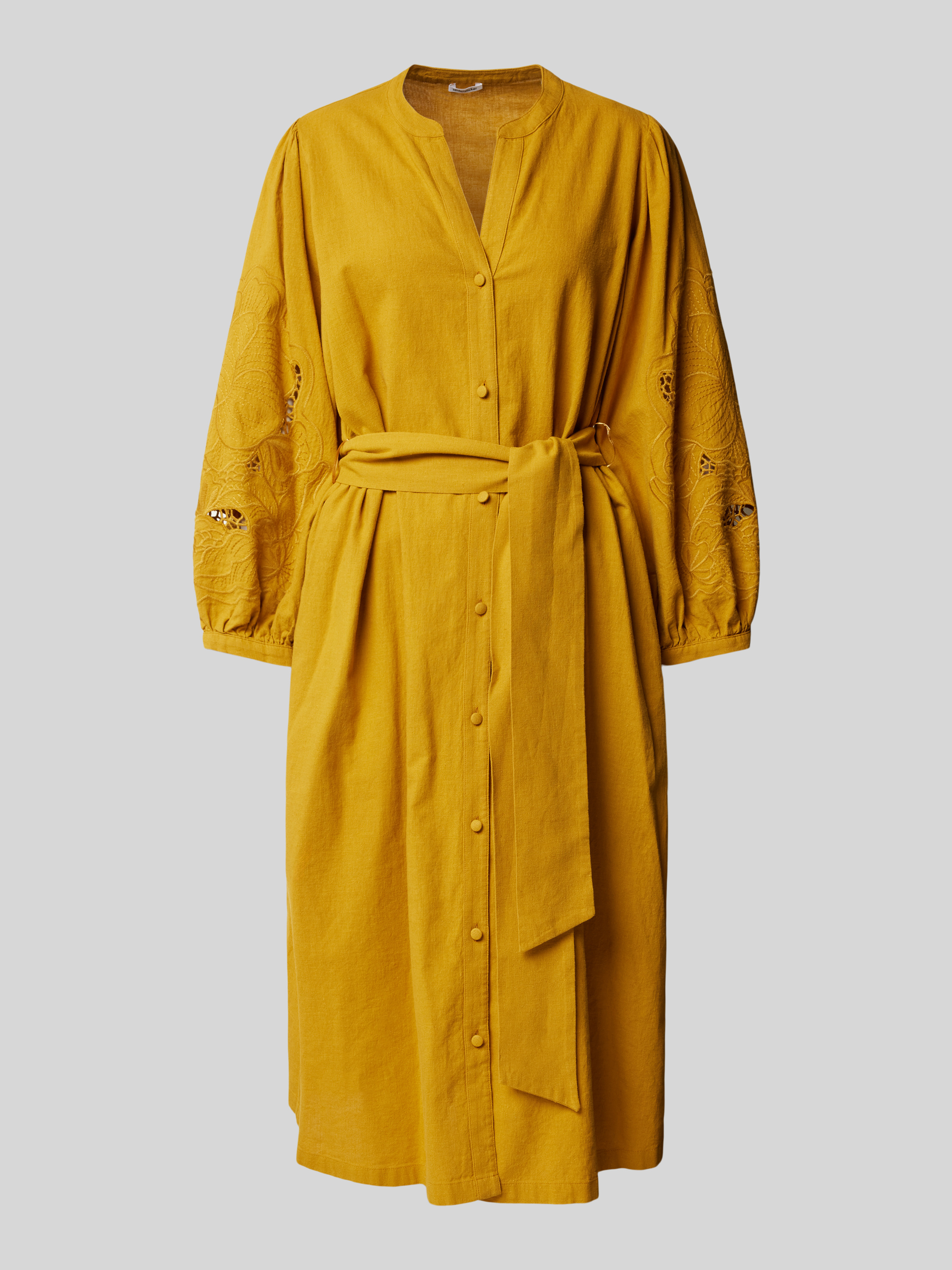 SeidenstickerMidikleid aus Baumwoll-Leinen-Mix in senf