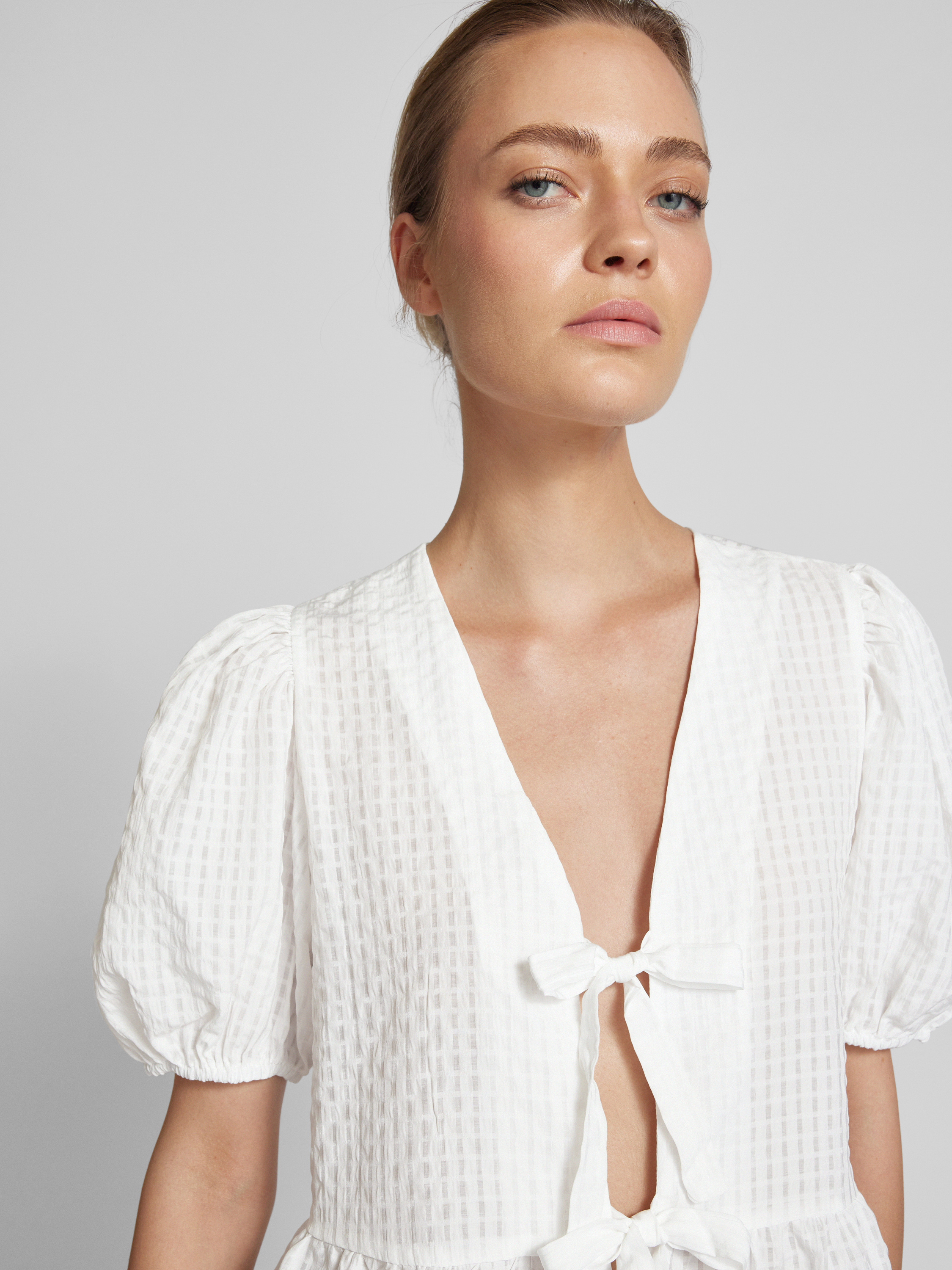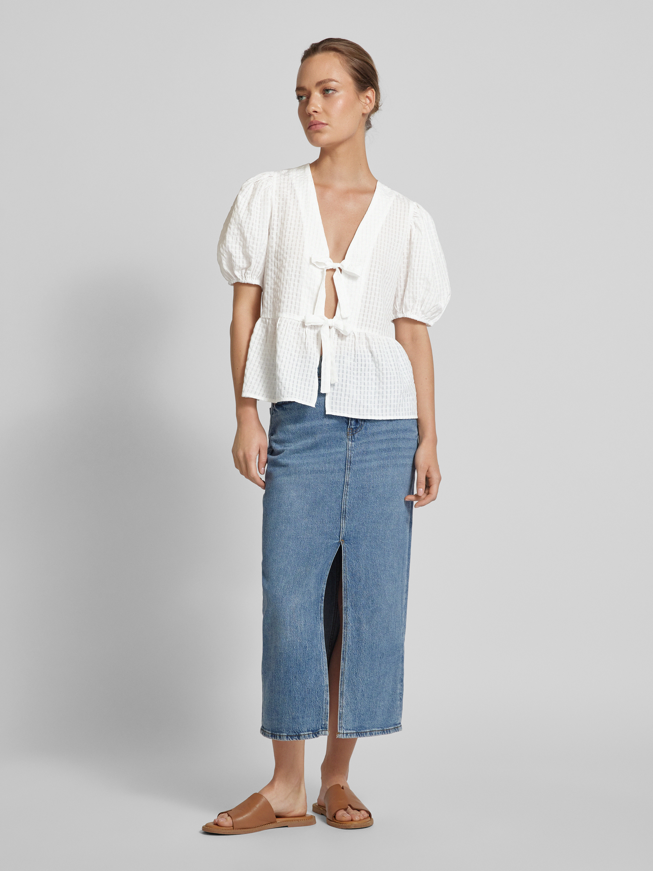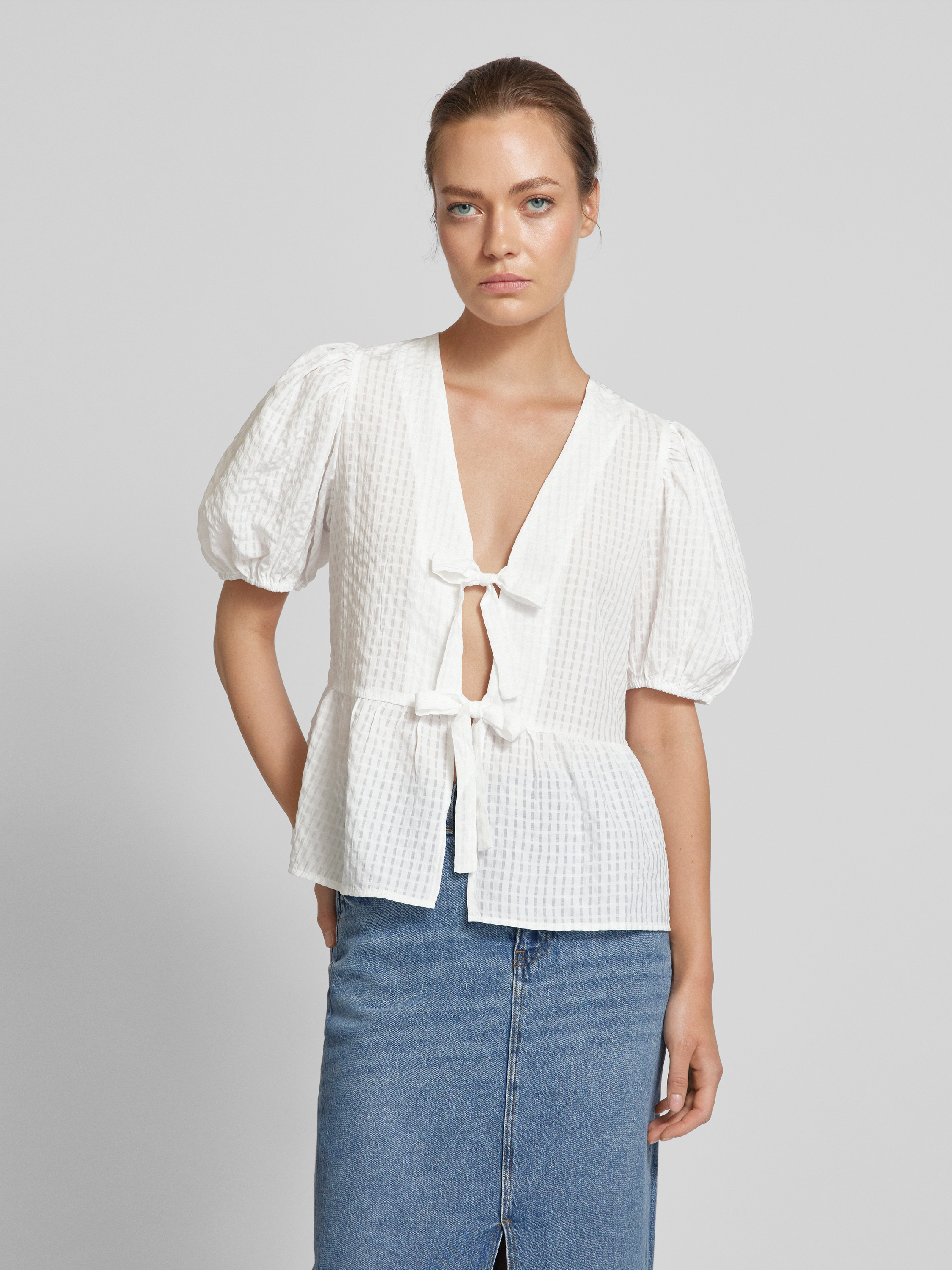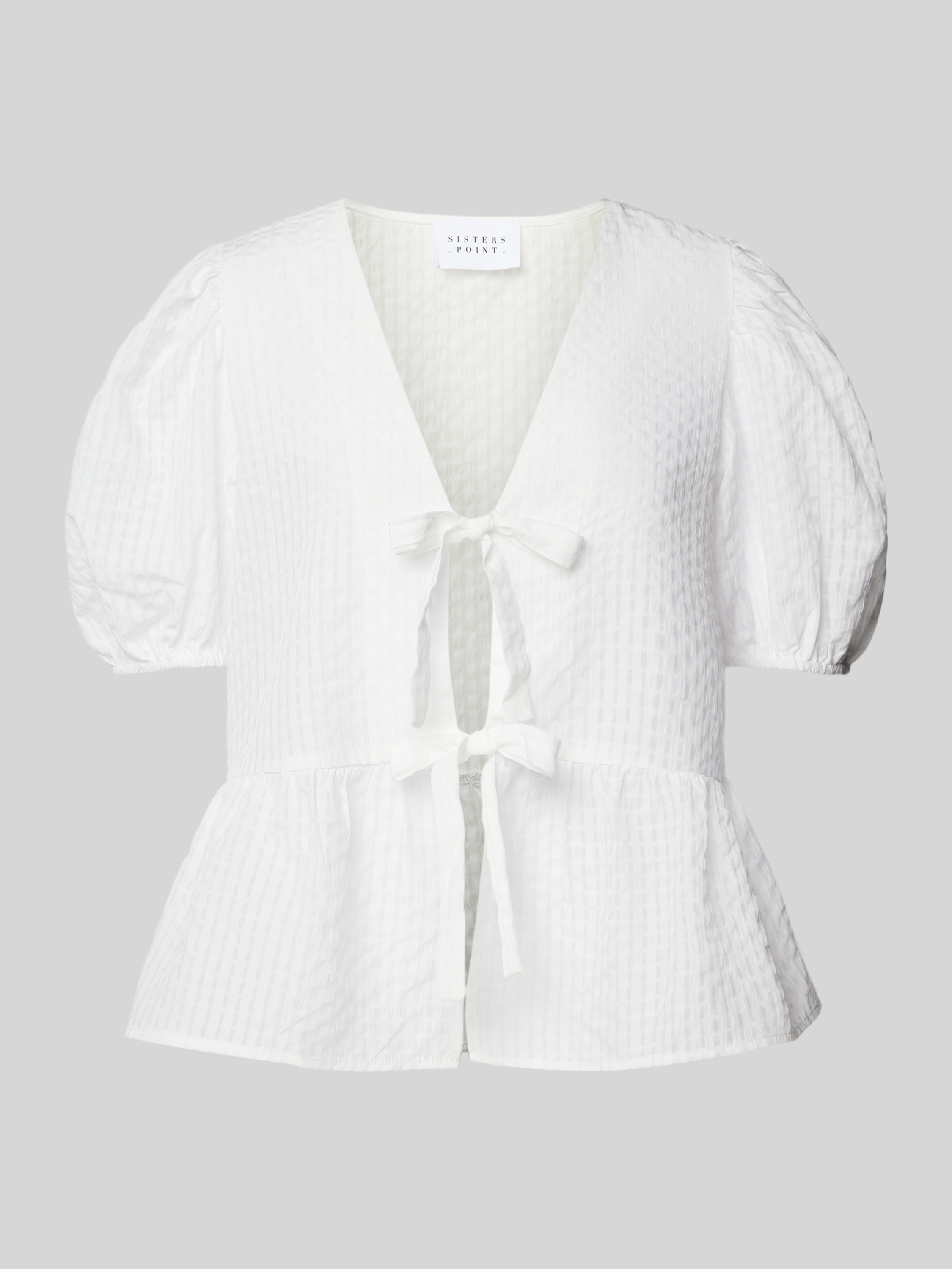 Das Blusenshirt mit Puffärmeln von Sisters Point, Modell 'ENGA', zeichnet sich durch eine körpernahe Passform und ein raffiniertes Strukturmuster aus. Die Bindung an der offenen Vorderseite ermöglicht vielseitige Tragemöglichkeiten, während die Puffärmel einen eleganten Akzent setzen, der jedem Outfit eine besondere Note verleiht.