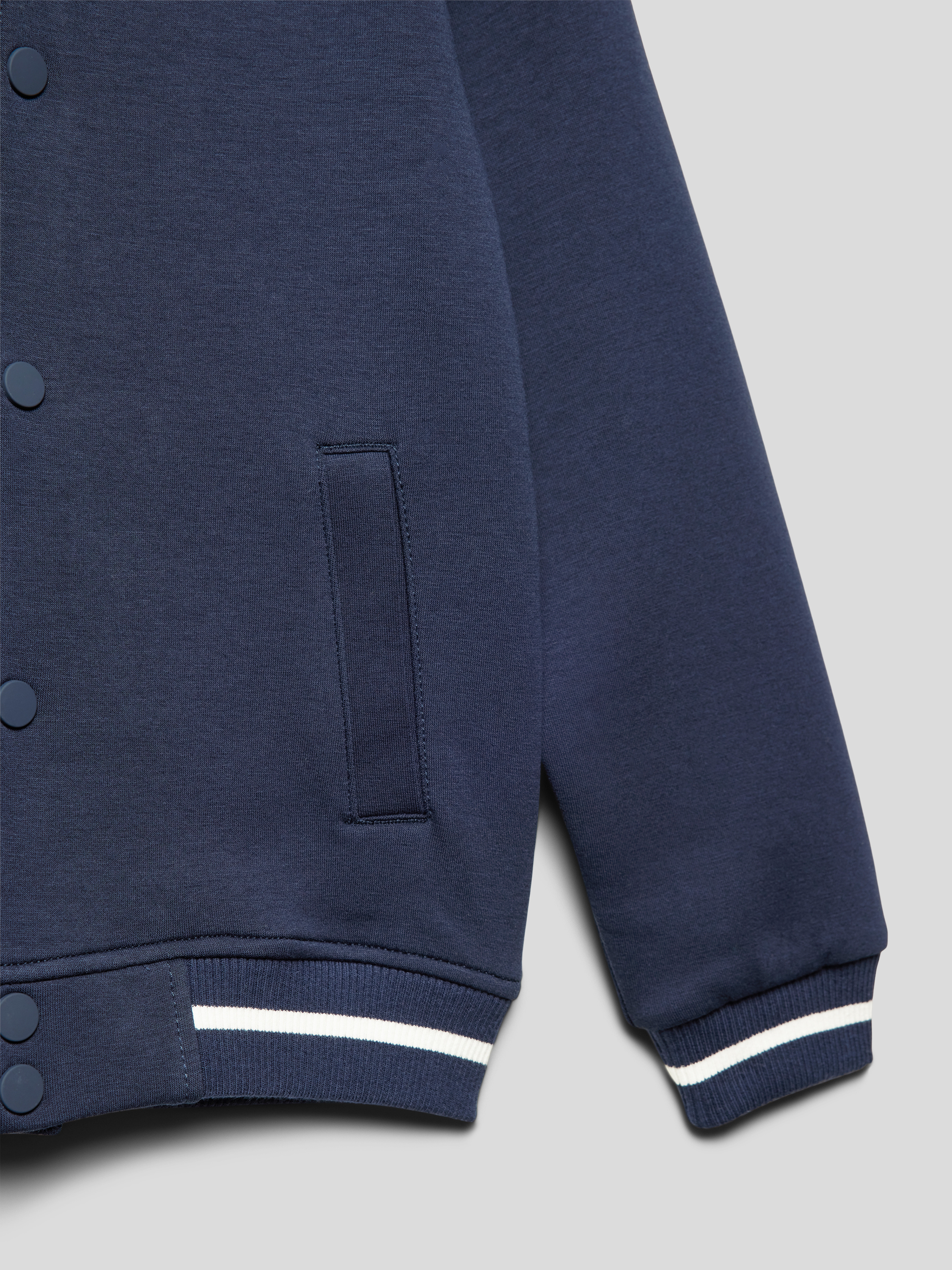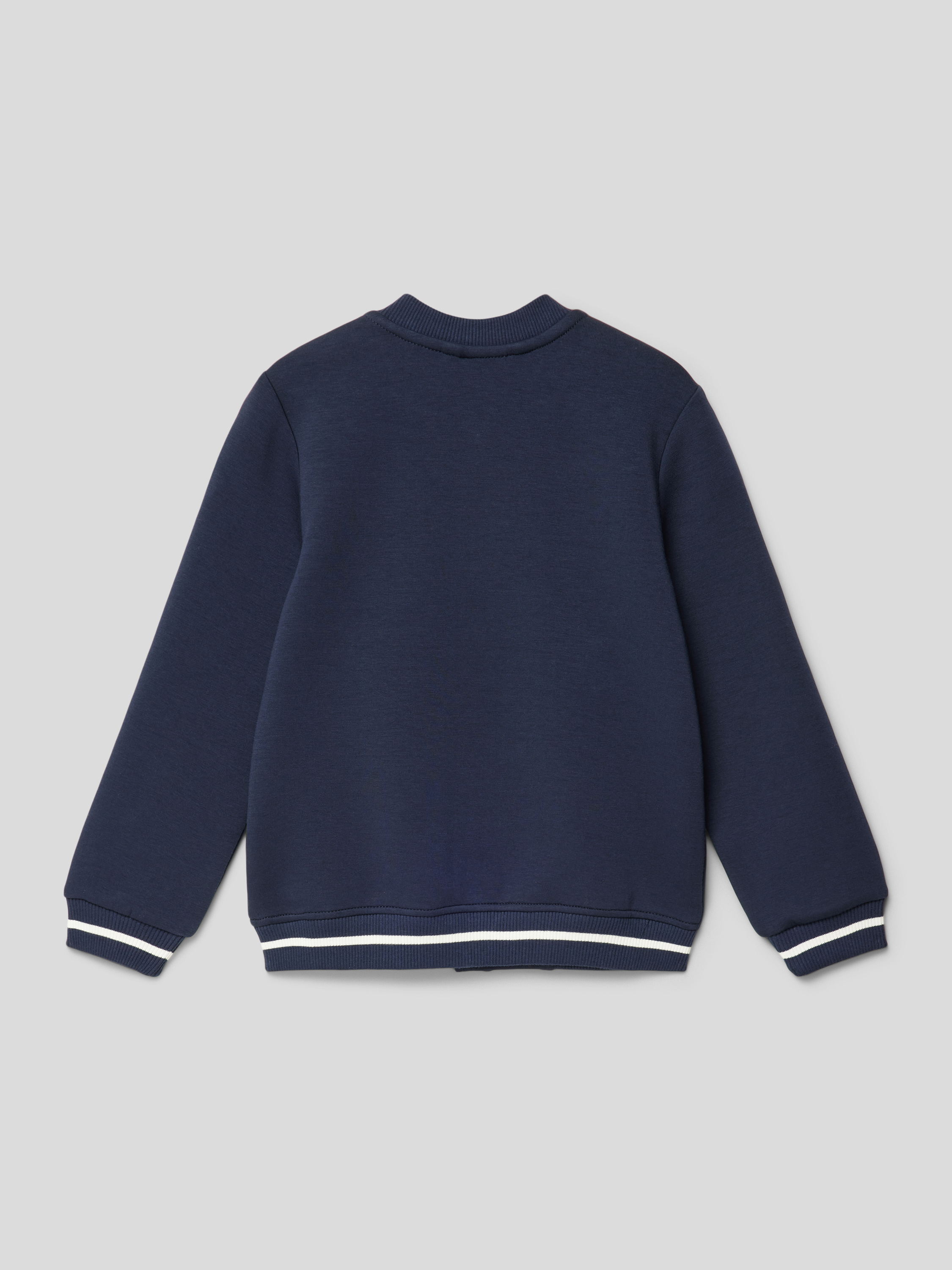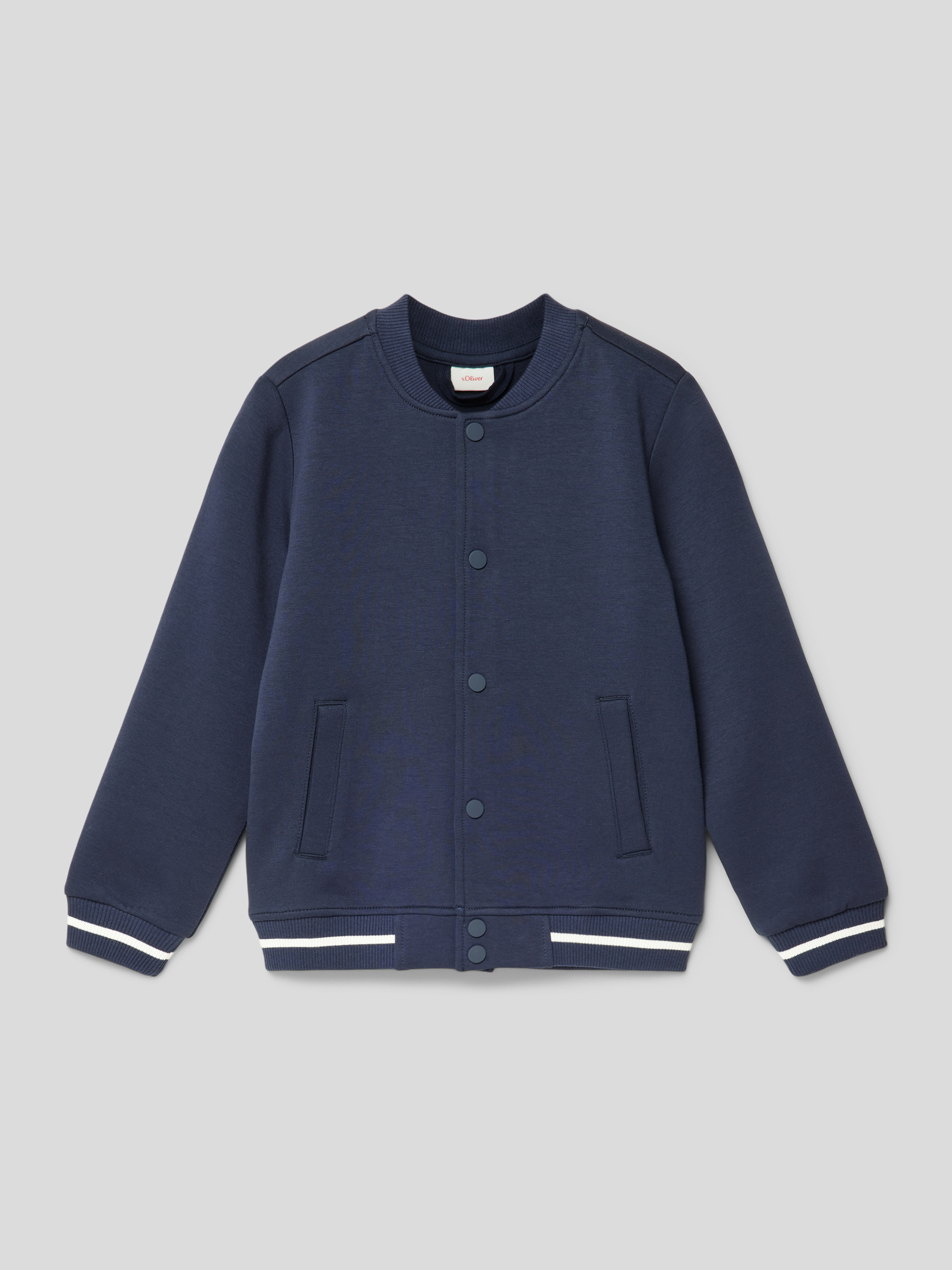 Die College-Jacke von s.Oliver RED LABEL verbindet legeren Komfort mit einem schlichten, unifarbenen Design. Ein kurzer Stehkragen und kontrastreiche Streifen setzen dezente Akzente. Dank seitlicher Eingrifftaschen und lockerer Passform eignet sie sich ideal für den entspannten Alltag.