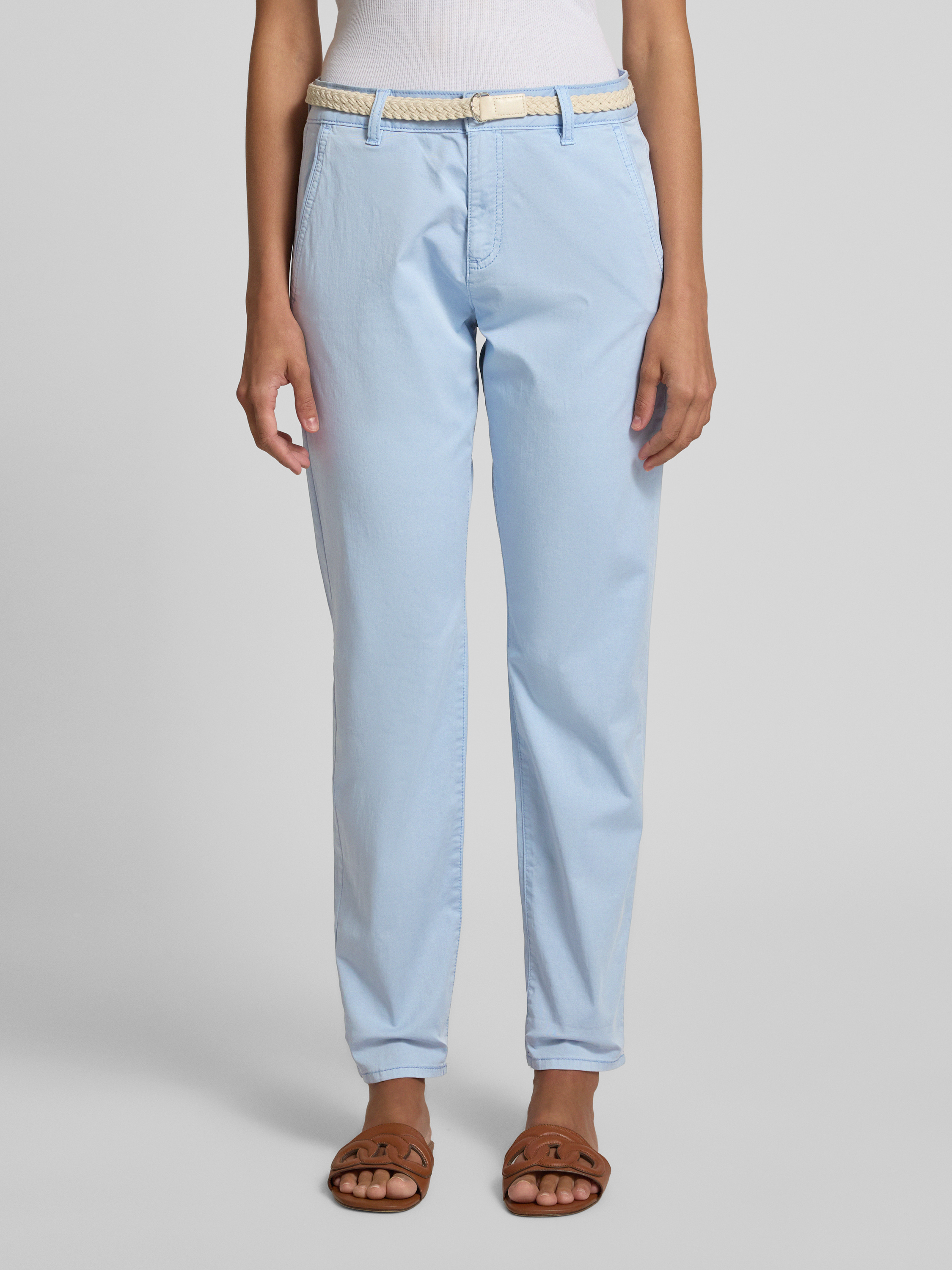 Die Damen Chino von s.Oliver RED LABEL zeichnet sich durch ihren Regular Fit und die leicht zulaufende Beinform aus, wodurch sie vielseitig kombinierbar bleibt. Ein geflochtener Gürtel ergänzt das unifarbene Design dezent. Dank mittlerer Bundhöhe sitzt die Hose angenehm und alltagstauglich.