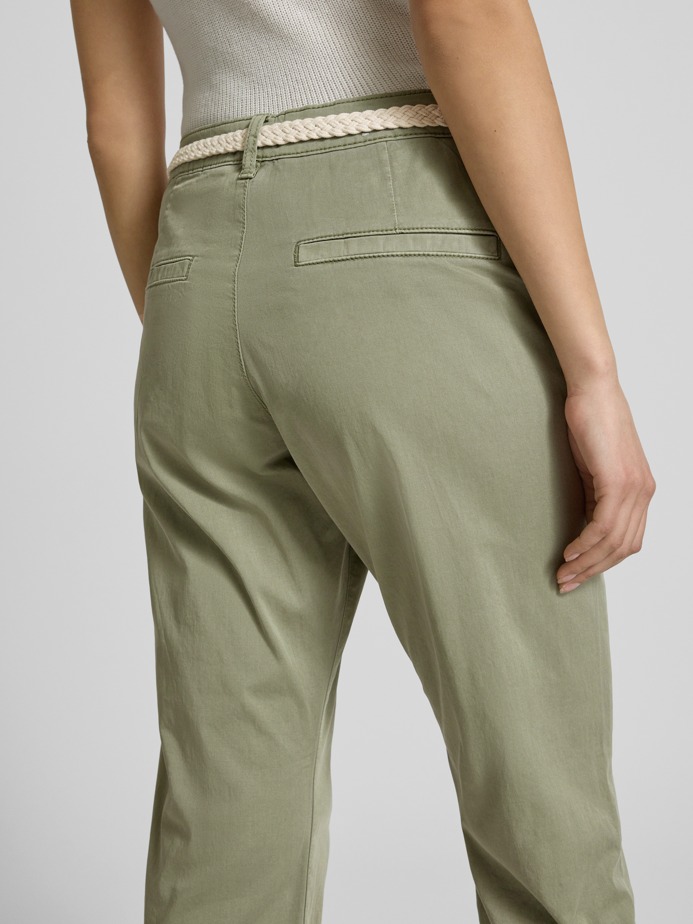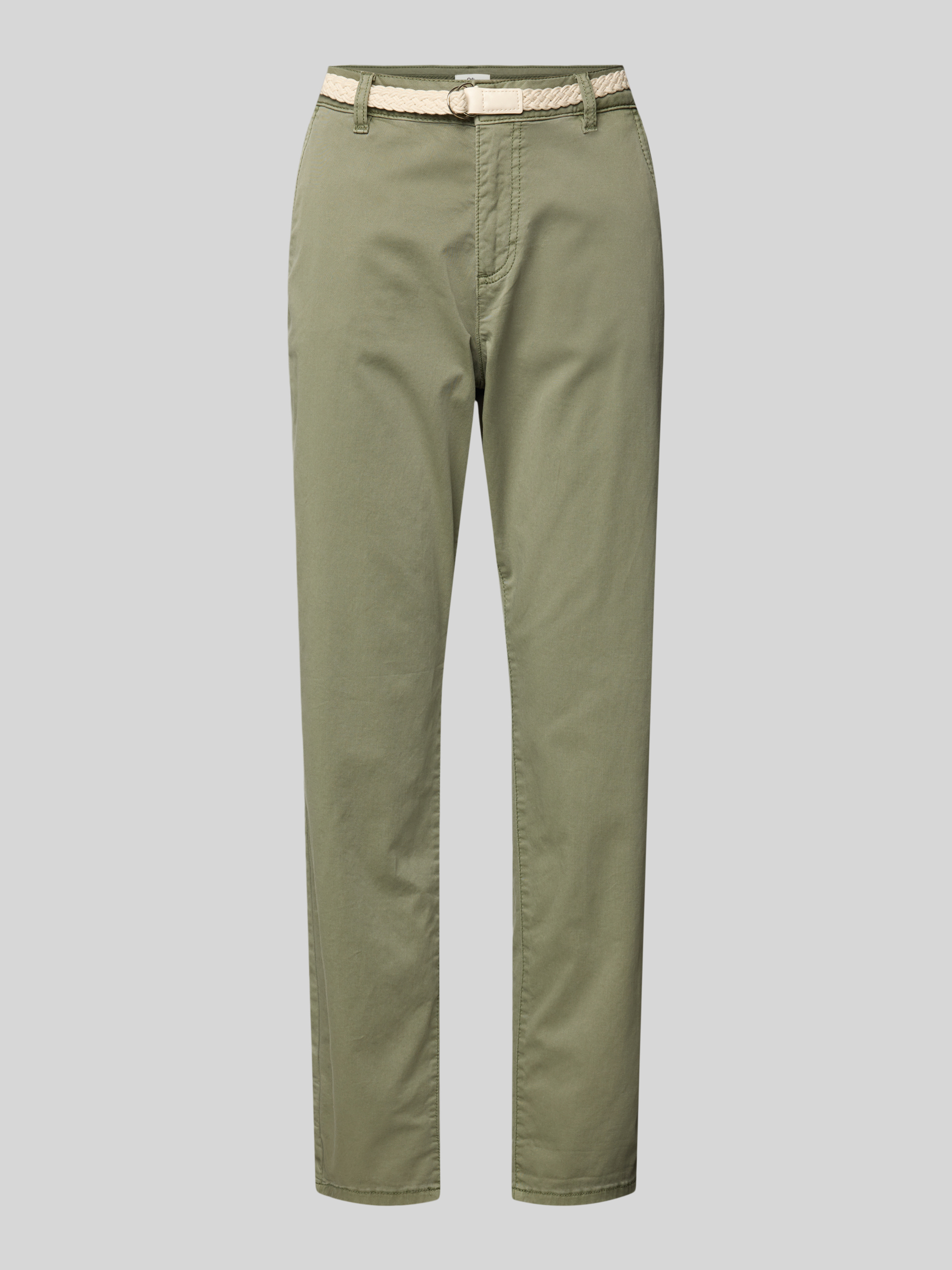 Die Damen Chino von s.Oliver RED LABEL zeichnet sich durch ihren Regular Fit und die leicht zulaufende Beinform aus, wodurch sie vielseitig kombinierbar bleibt. Ein geflochtener Gürtel ergänzt das unifarbene Design dezent. Dank mittlerer Bundhöhe sitzt die Hose angenehm und alltagstauglich.