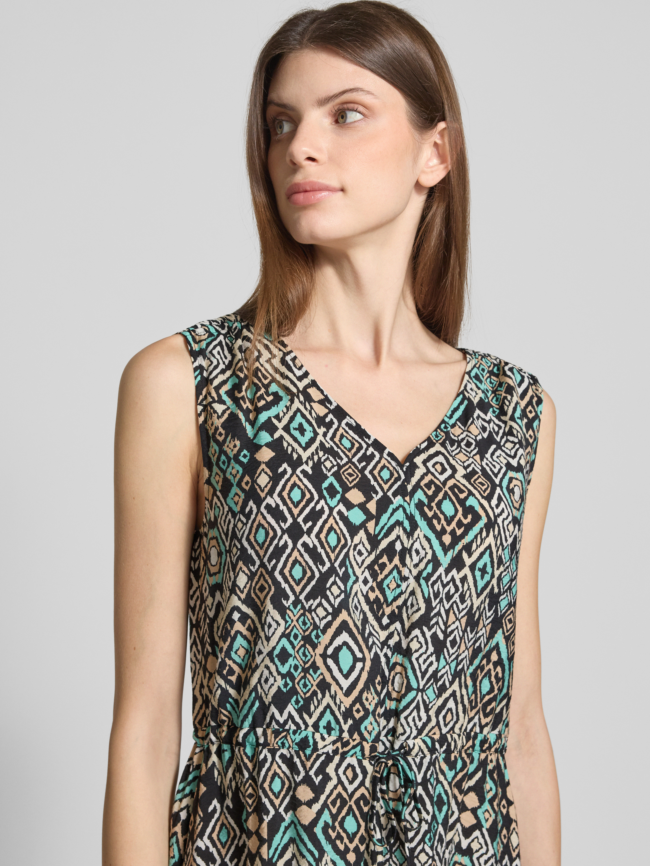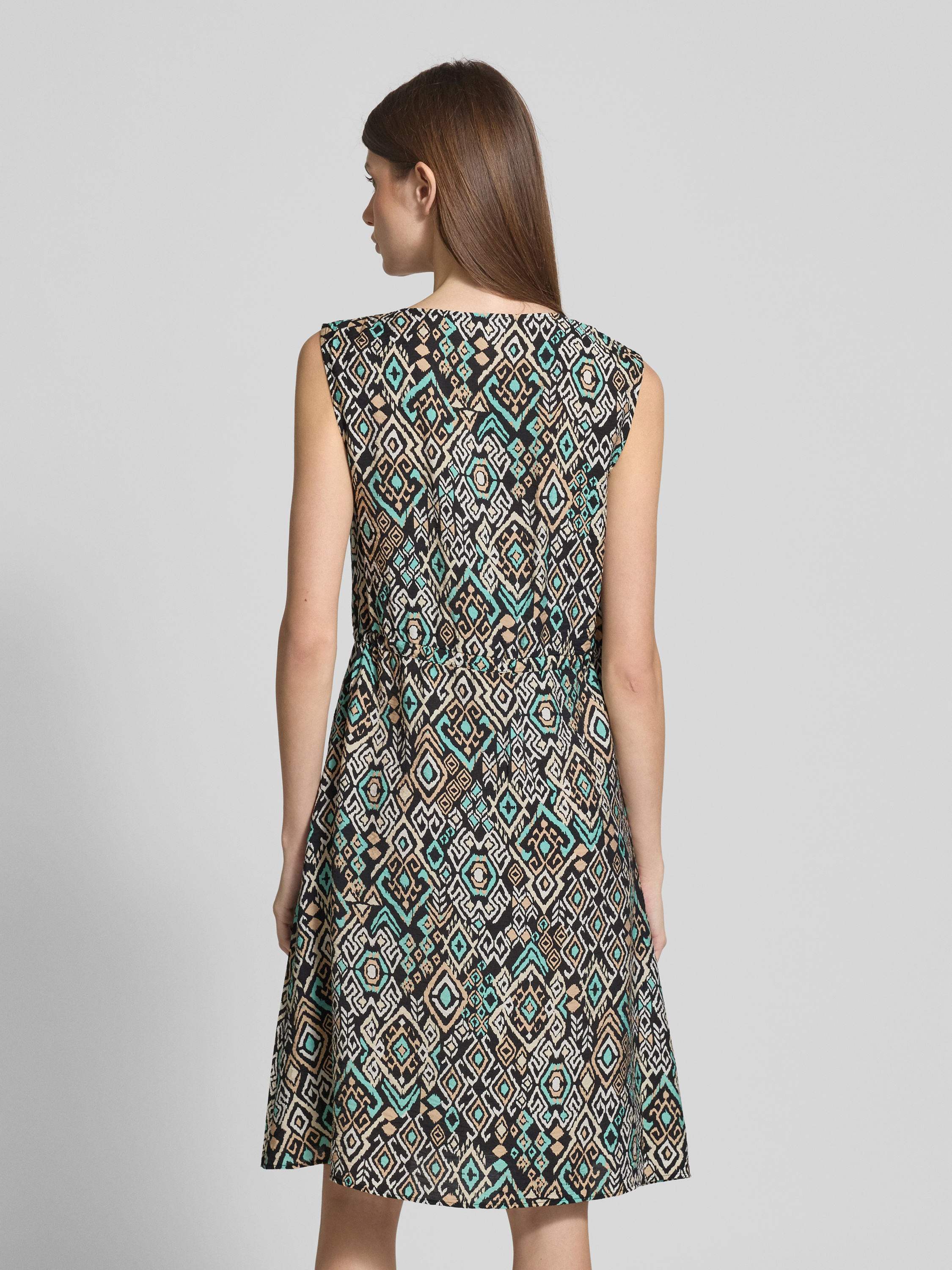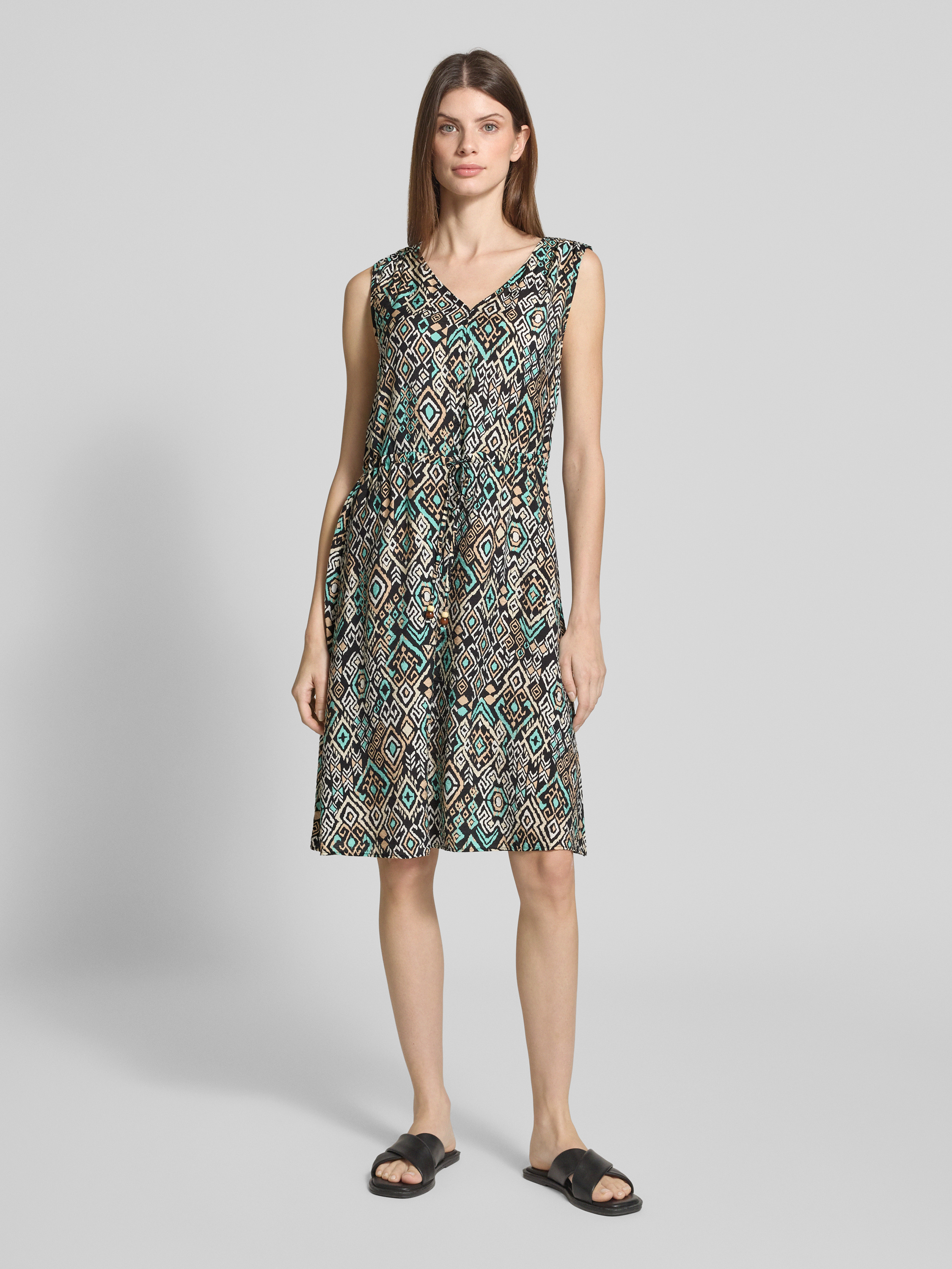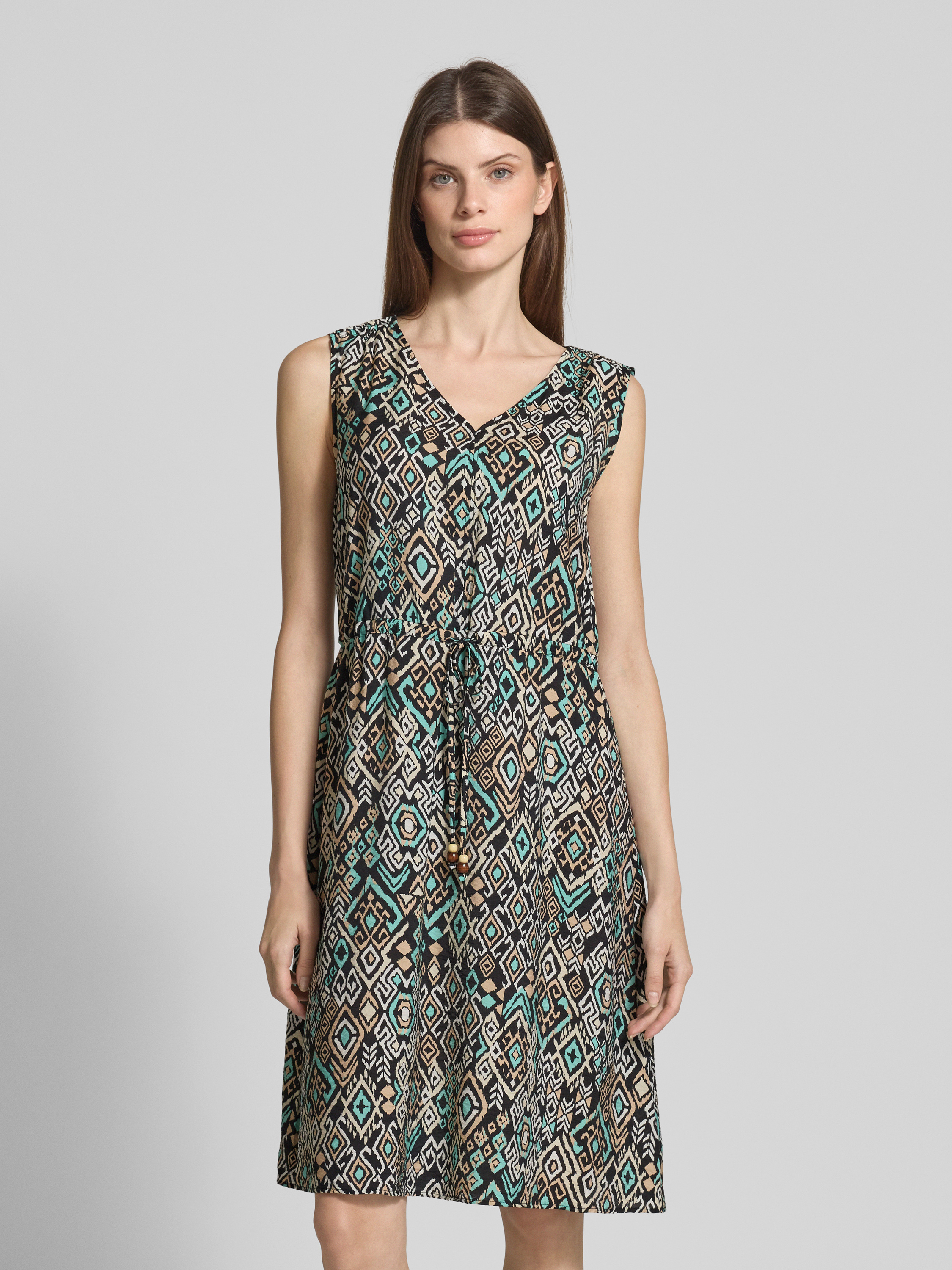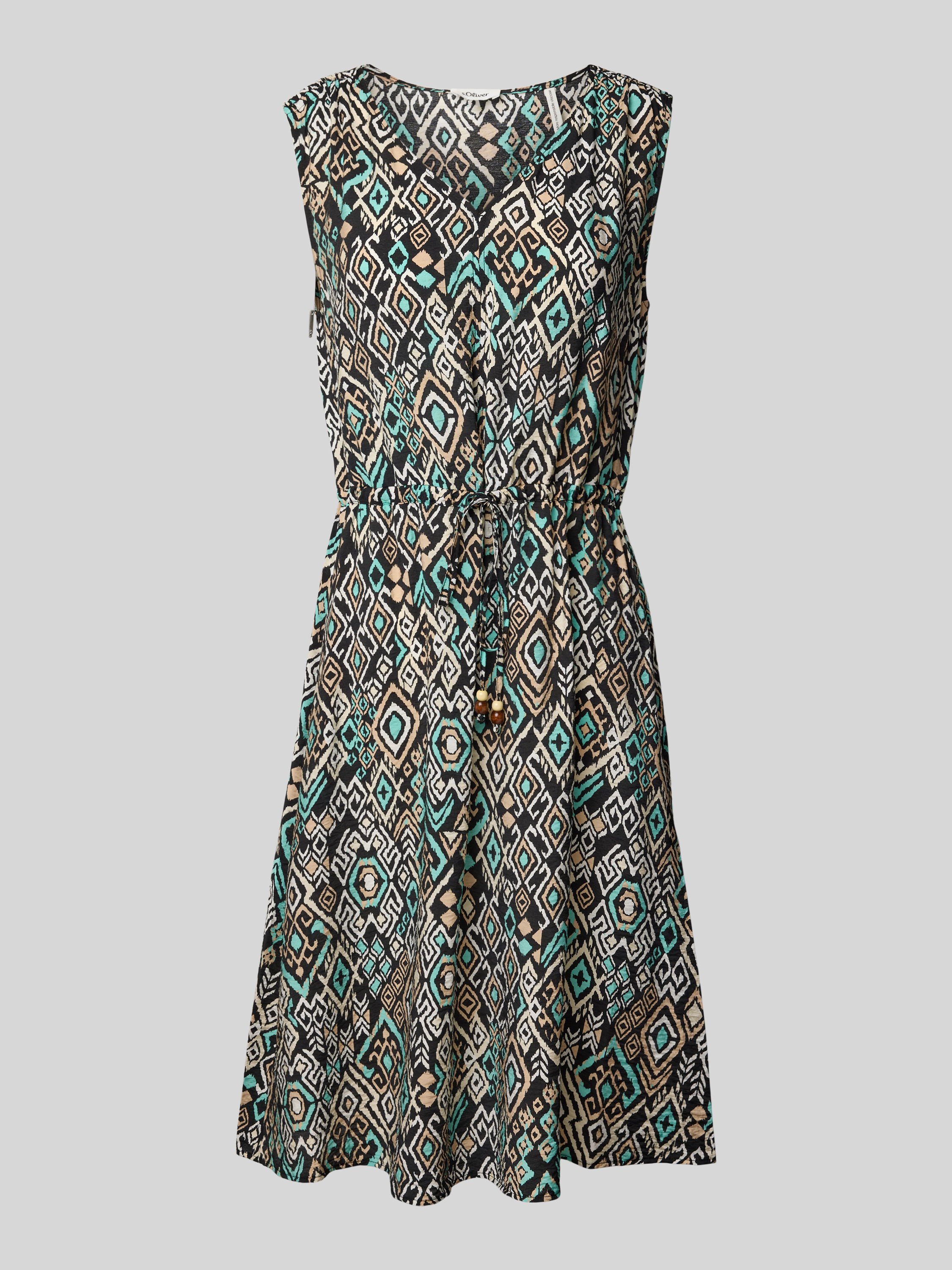 Das knielange Kleid von s.Oliver RED LABEL im Regular Fit aus einem strukturierten Viskose-Mix bietet durch das Allover-Muster eine frische Optik. Der V-Ausschnitt verleiht ihm eine elegante Note, während der Tunnelzug für eine angenehme Passform sorgt. Ideal für entspannte Freizeitaktivitäten.