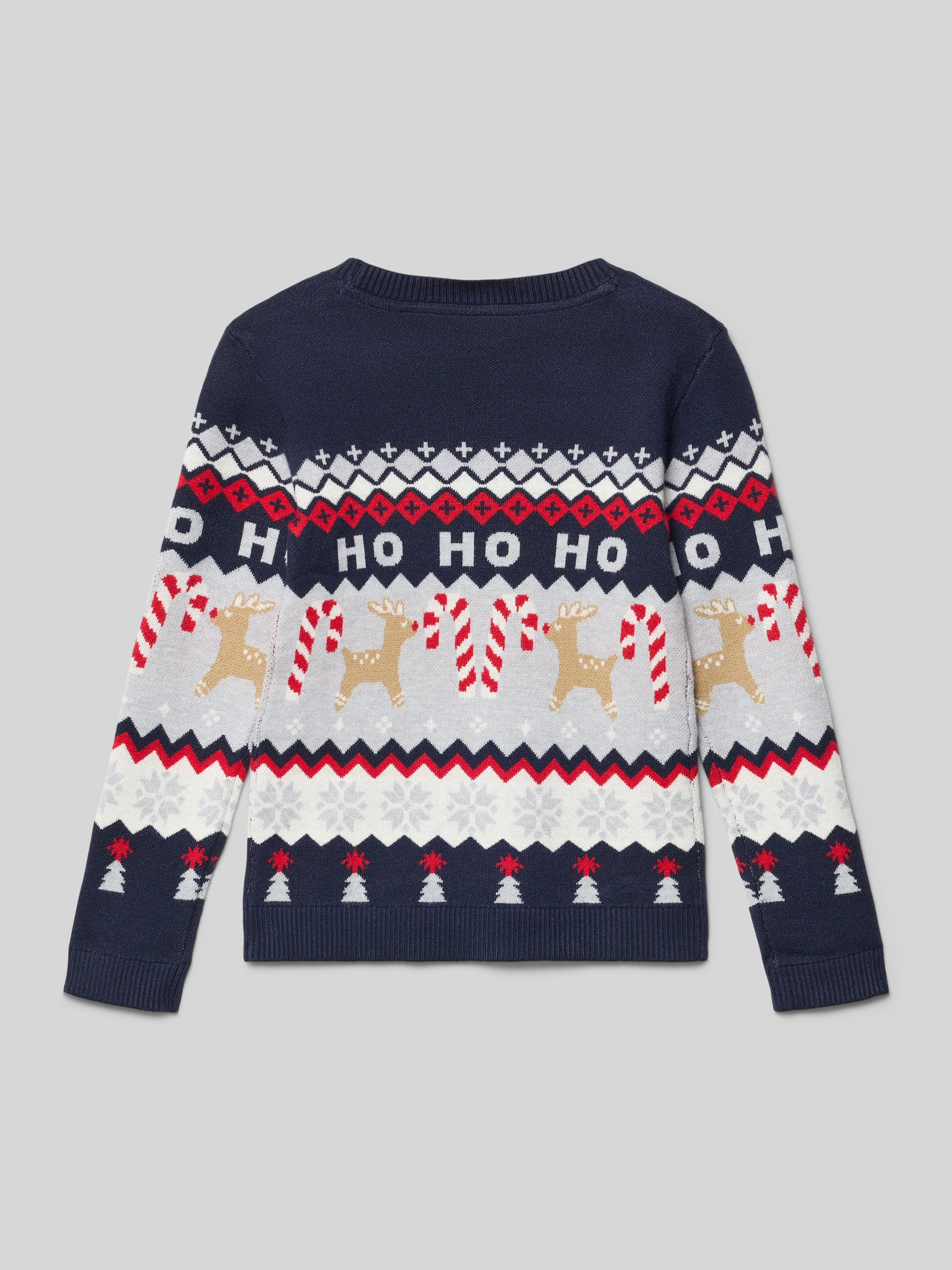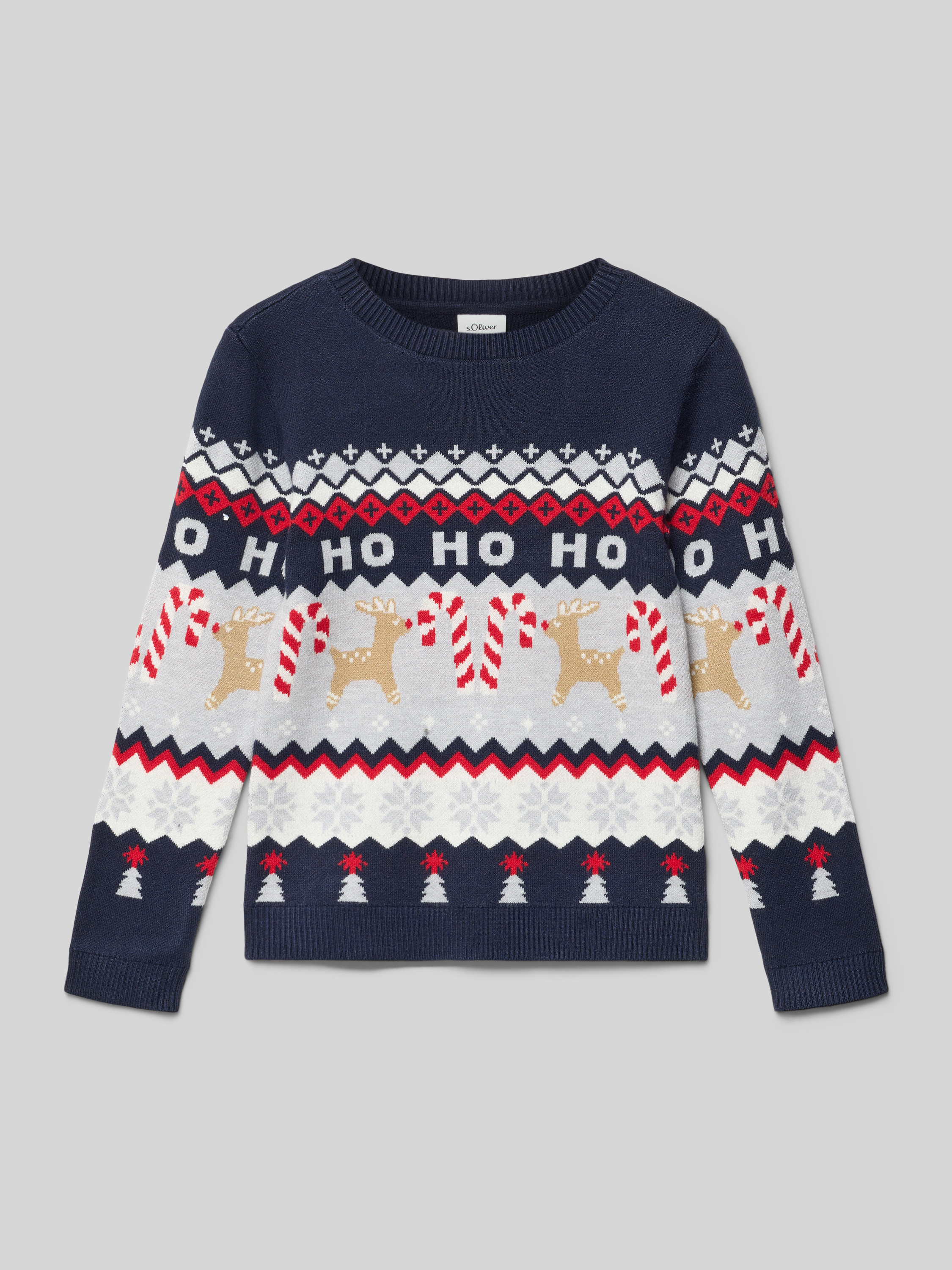 Der Kinder Weihnachtspullover von s.Oliver RED LABEL fällt durch das Allover-Muster mit fröhlichem Weihnachtsmotiv direkt ins Auge. Durch die Regular-Fit Passform und den klassischen Rundhals lässt sich der Strick angenehm tragen, wodurch ausreichend Bewegungsfreiheit entsteht. Der Viskose-Mix fühlt sich weich an und schmiegt sich sanft an die Haut.