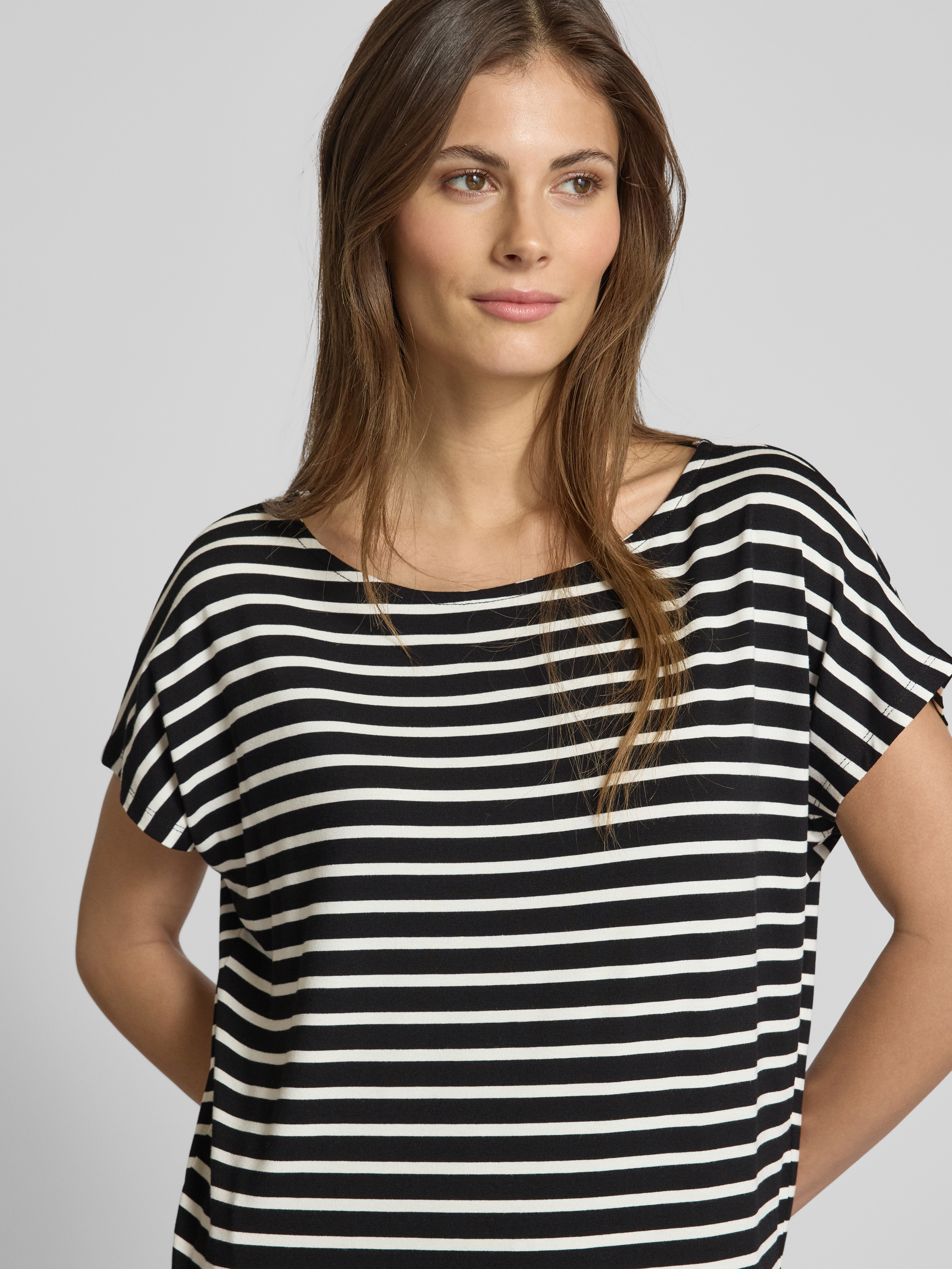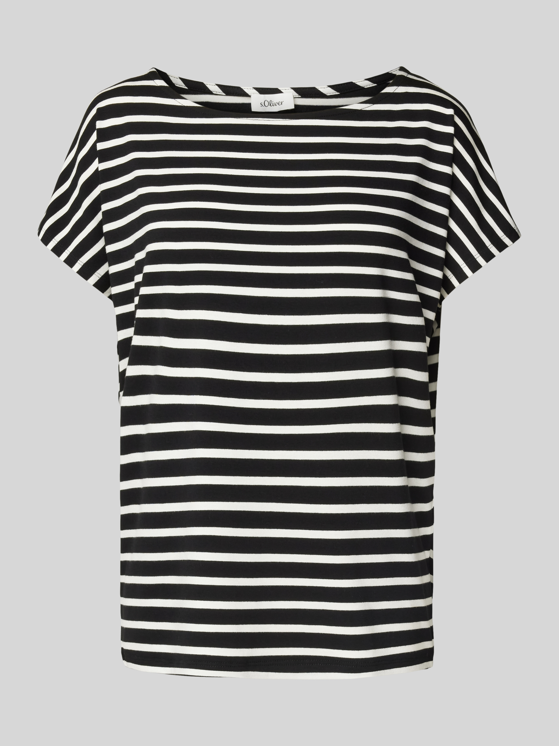 Das Damen T-Shirt von s.Oliver CASUAL präsentiert sich in einem entspannten Relaxed Fit, der durch seinen Viskose-Elasthan-Mix sanft auf der Haut liegt. Das gestreifte Allover-Muster verleiht dem Jersey-Gewebe eine lebendige Note, während der U-Boot-Ausschnitt einen modernen Akzent setzt. Ideal, um einen lässigen Look zu kreieren.