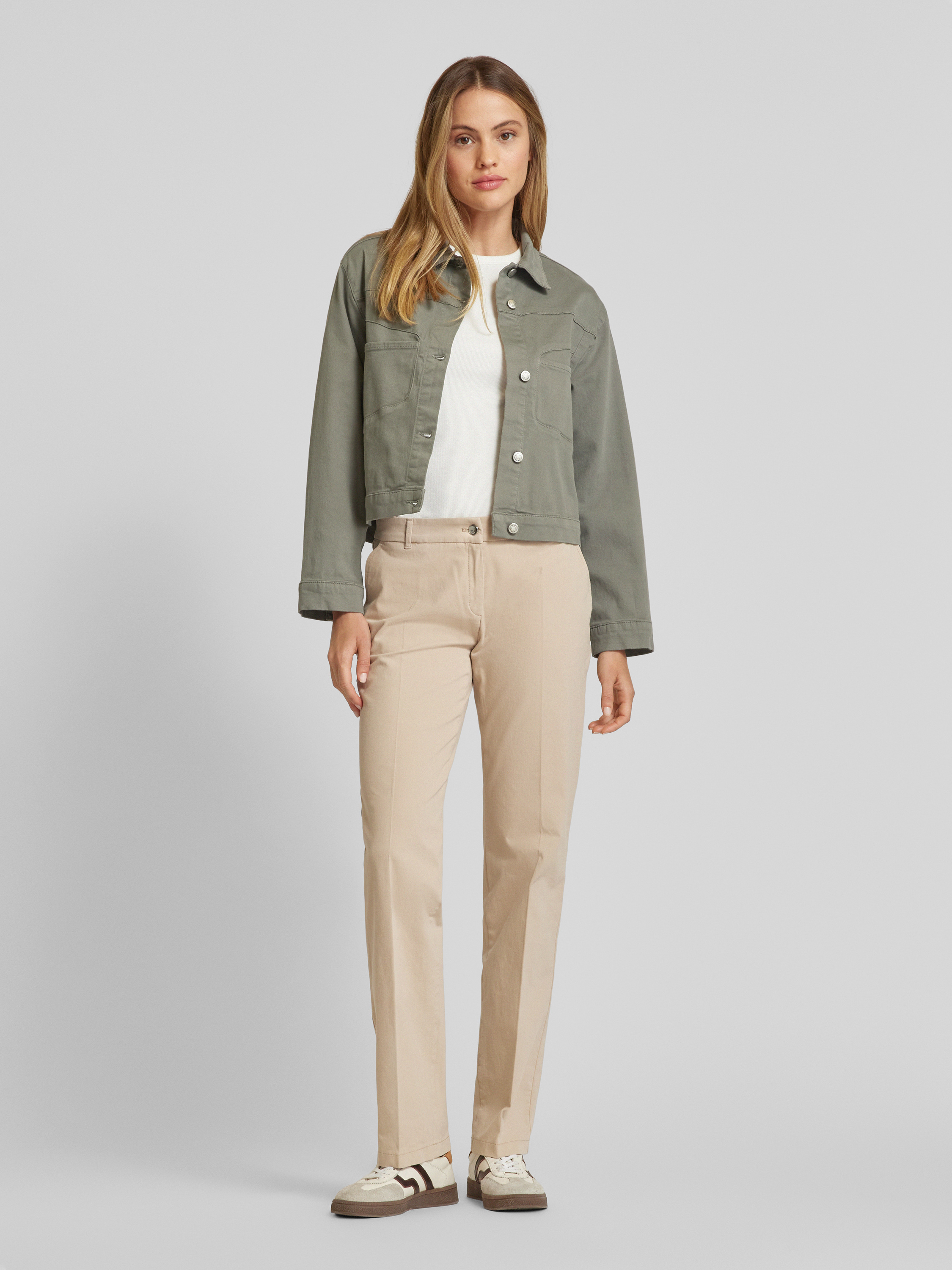 Die Jacke mit Brusttaschen Modell 'ERNA' von Soyaconcept kombiniert einen geraden Schnitt mit einem Umlegekragen und bietet dadurch eine komfortable Passform. Der Baumwoll-Elasthan-Mix sorgt für angenehmen Tragekomfort und Bewegungsfreiheit. Praktische Brusttaschen ergänzen das funktionale Design.