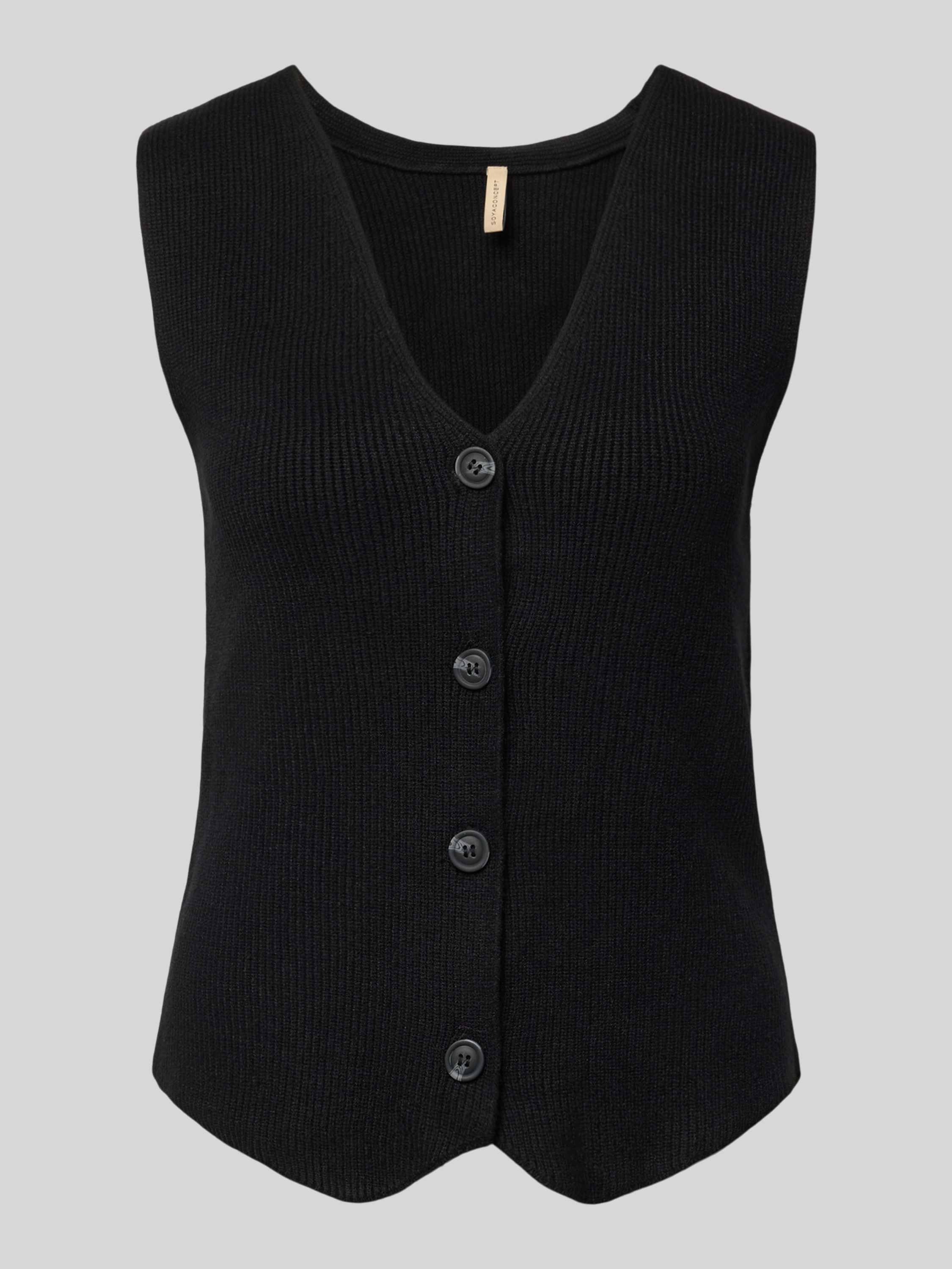 Die Damen Weste von Soyaconcept, Modell KANITA, fällt durch ihre körpernahe Passform auf und liegt angenehm am Körper an. Der V-Ausschnitt verleiht dem Look eine klassische Note, während der Viskose-Mix für ein weiches Tragegefühl sorgt. Kombiniert wird vielseitige Alltagstauglichkeit mit unkomplizierter Eleganz.