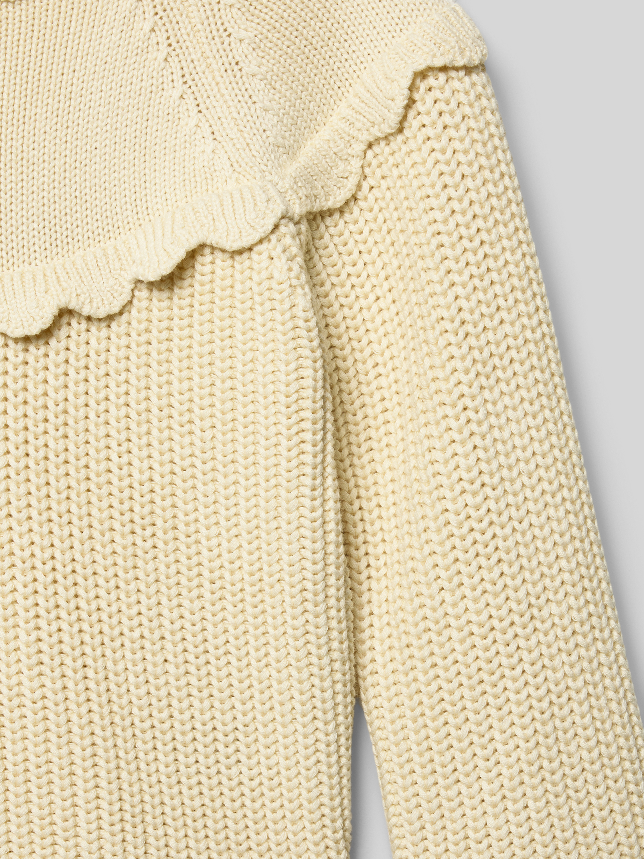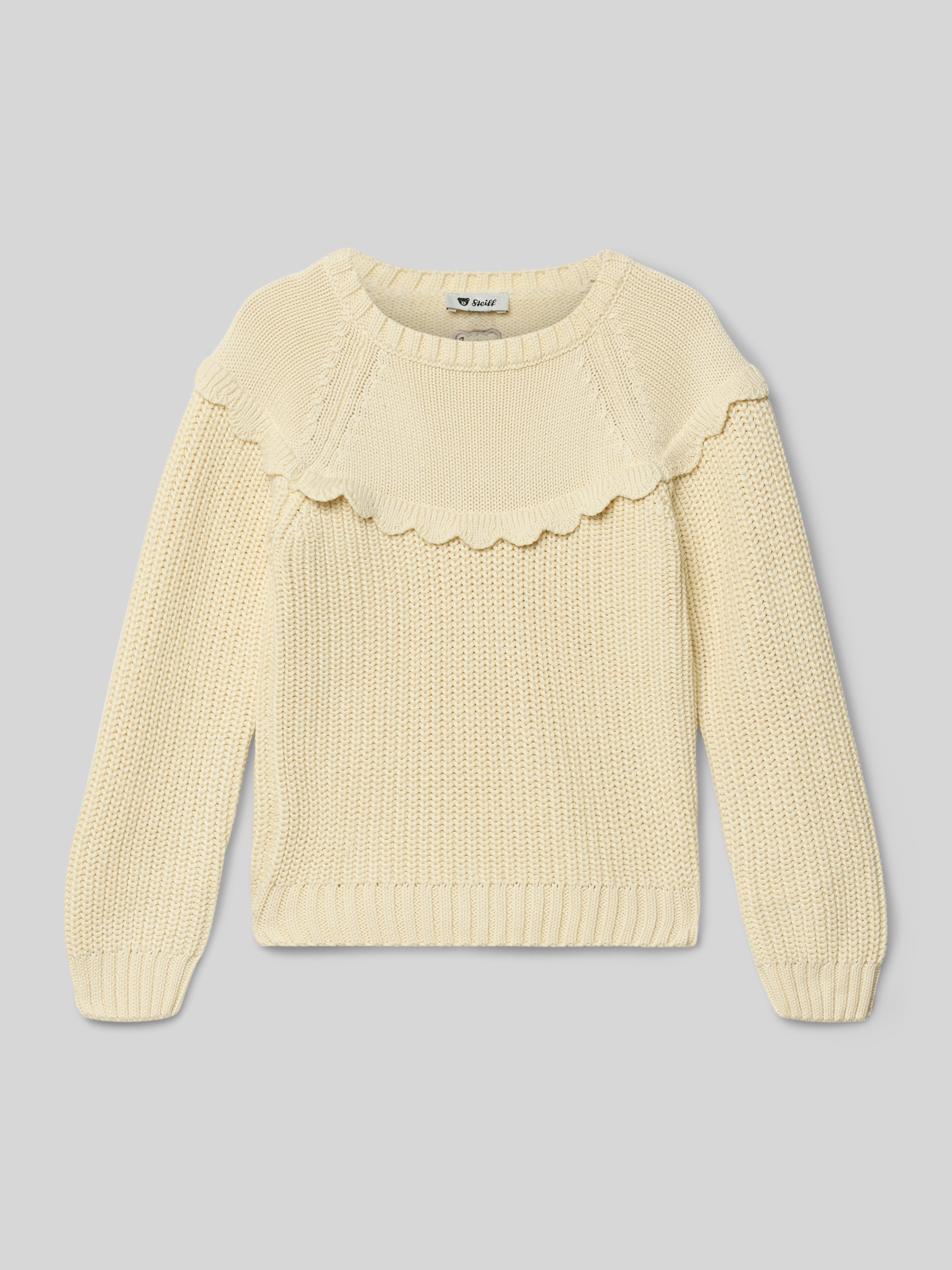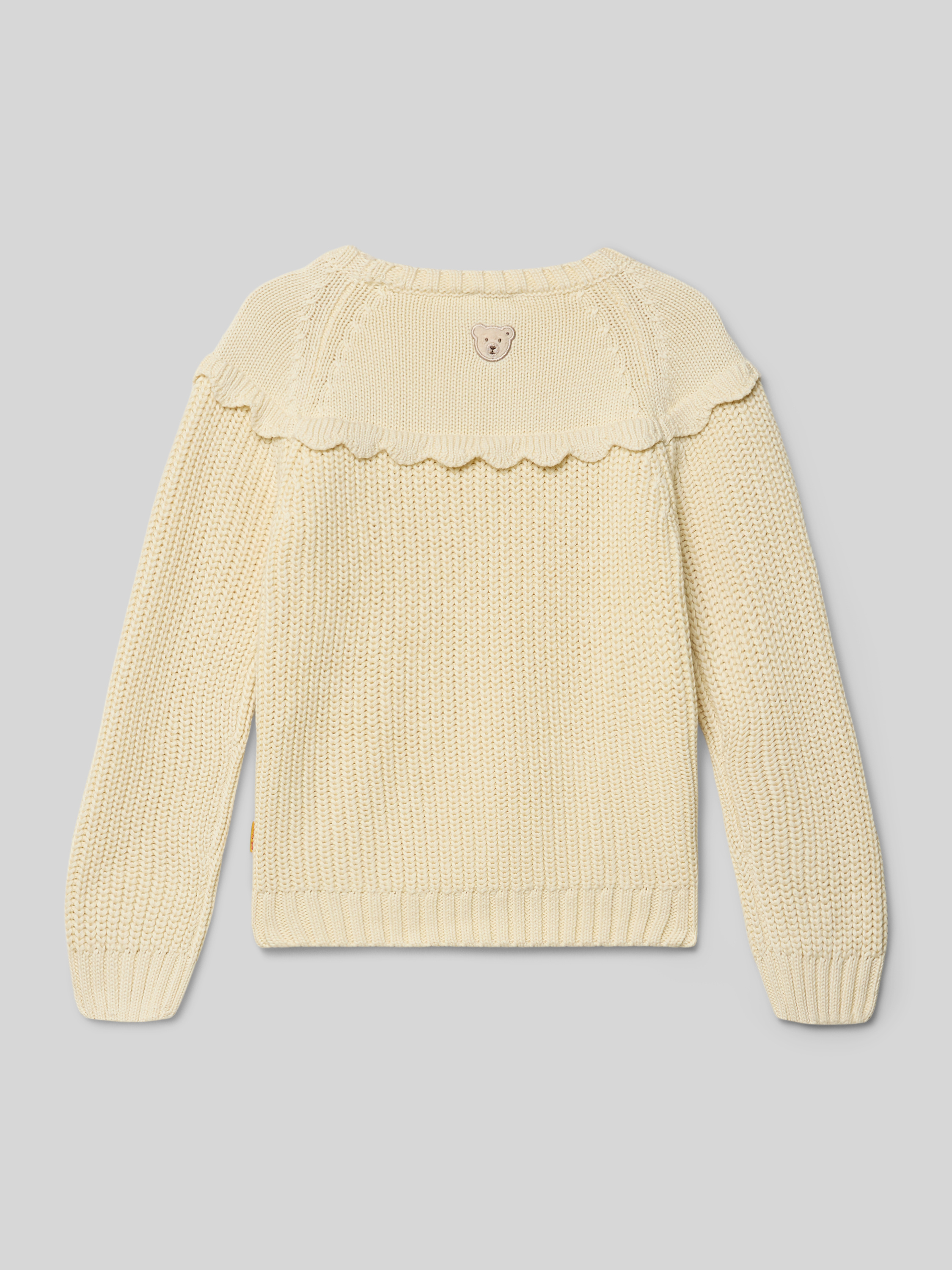 Der Kinderpullover von Steiff überzeugt im Regular Fit durch seine angenehm weiche Baumwolle und die markante Strick-Optik. Ein feiner Rüschenbesatz am Rundhalsausschnitt sorgt für einen verspielten Akzent, während elastische Abschlüsse den Sitz angenehm anliegen lassen. So entsteht Bewegungsfreiheit im Alltag.