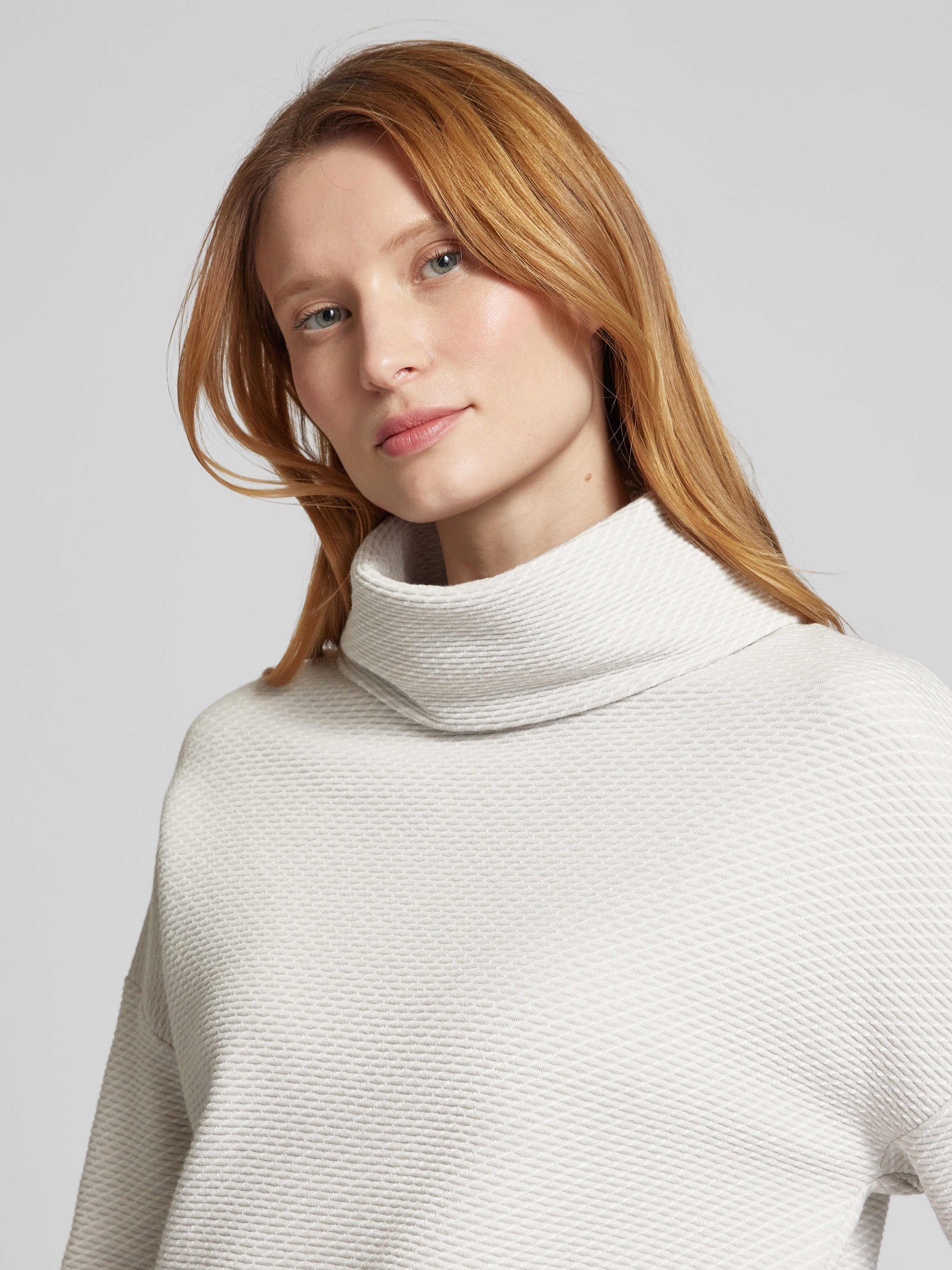 Das Damen Sweatshirt mit Rollkragen von Street One kombiniert einen angenehmen Baumwoll-Mix mit Stretch-Anteil und sorgt so für spürbare Bewegungsfreiheit im Alltag. Durch den Regular Fit sitzt es locker und wirkt dennoch gepflegt. 3/4-Ärmel und ein Taillenbund runden das Gesamtbild ab.