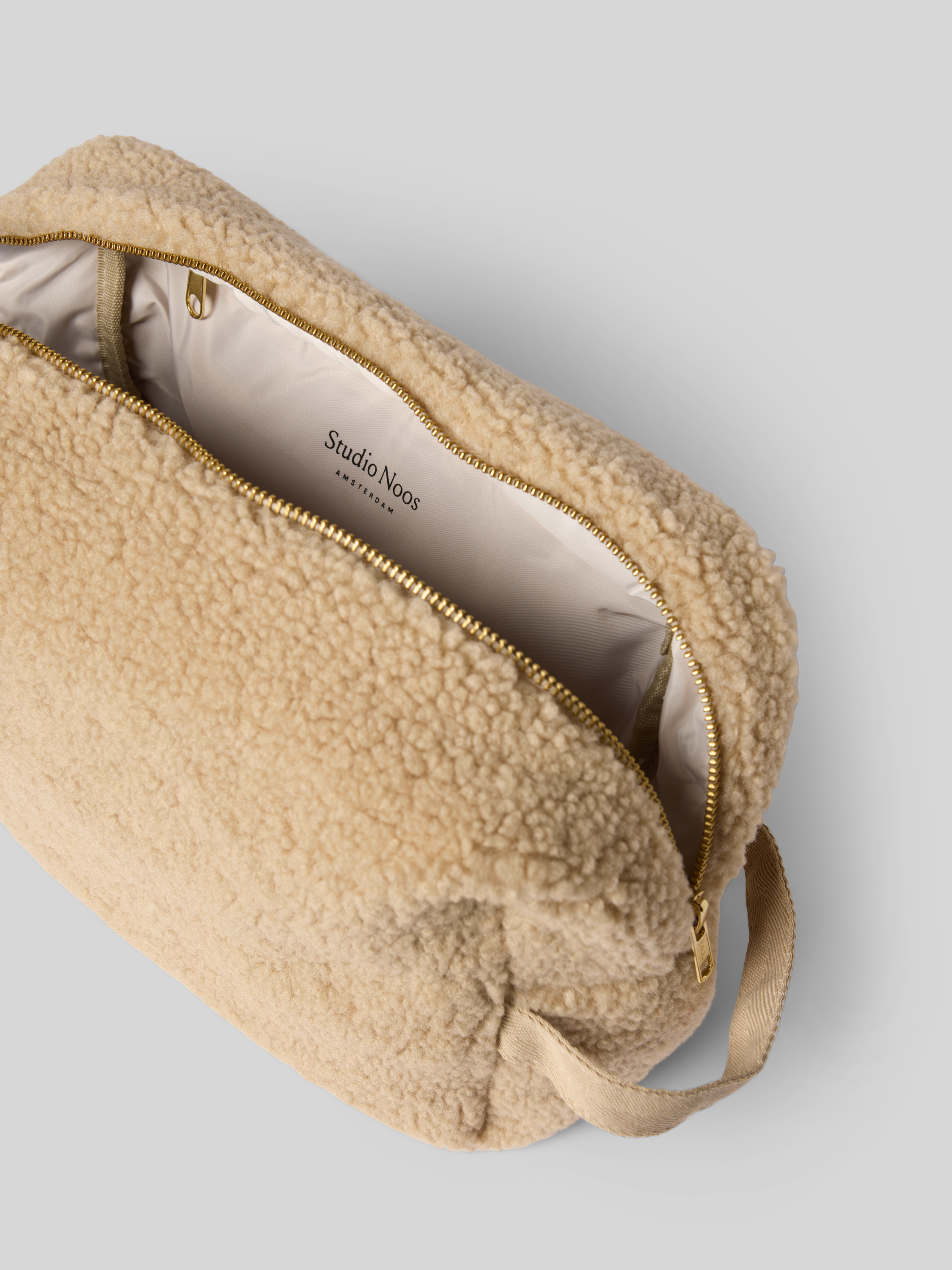 Die Kosmetiktasche von STUDIO NOOS fällt durch ihr weiches Teddyfell angenehm auf und liegt geschmeidig in der Hand. Im geräumigen Inneren lassen sich Pflegeprodukte übersichtlich verstauen, während eine praktische Zugschlaufe den Alltag erleichtert. Dezente Label-Details runden das Design stimmig ab.