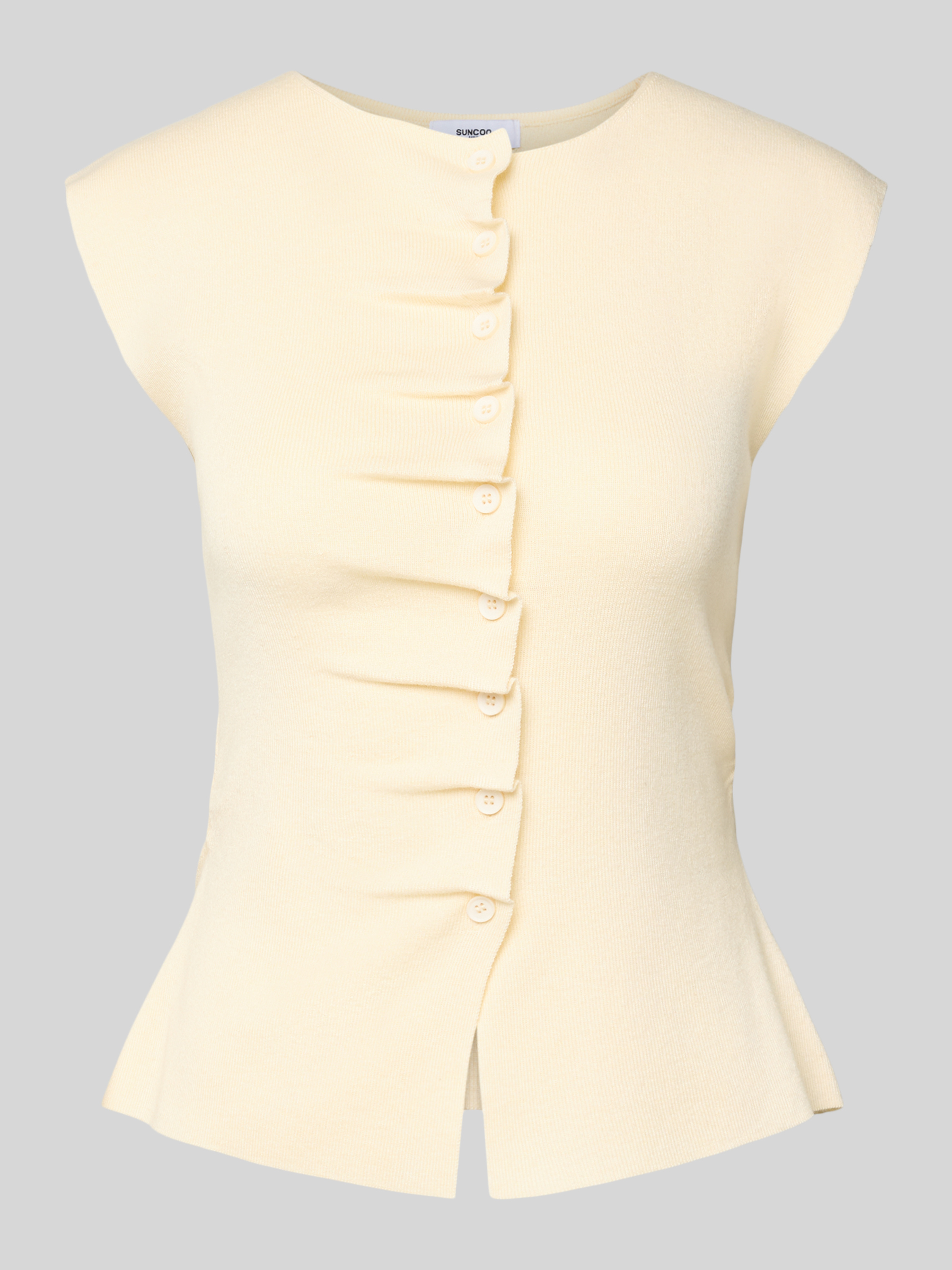 Das Damen Strickshirt PAGNI von SUNCOO PARIS schmiegt sich angenehm an den Körper und betont die Silhouette auf dezente Weise. Ein Rundhalsausschnitt und feine Rüschen verleihen dem Oberteil eine verspielte Note. Der Material-Mix mit Baumwoll-Anteil sorgt für ein angenehmes Tragegefühl im Alltag.