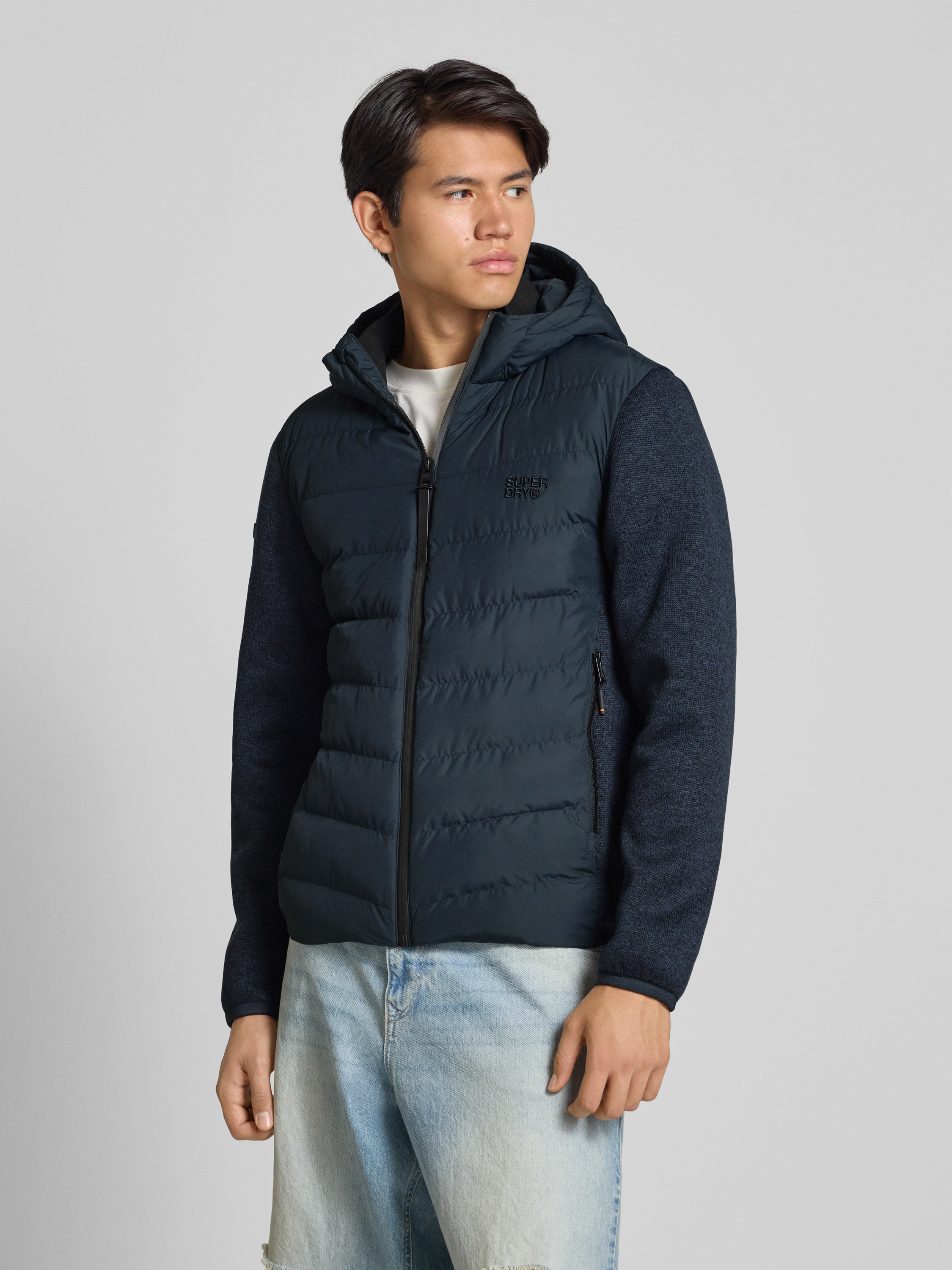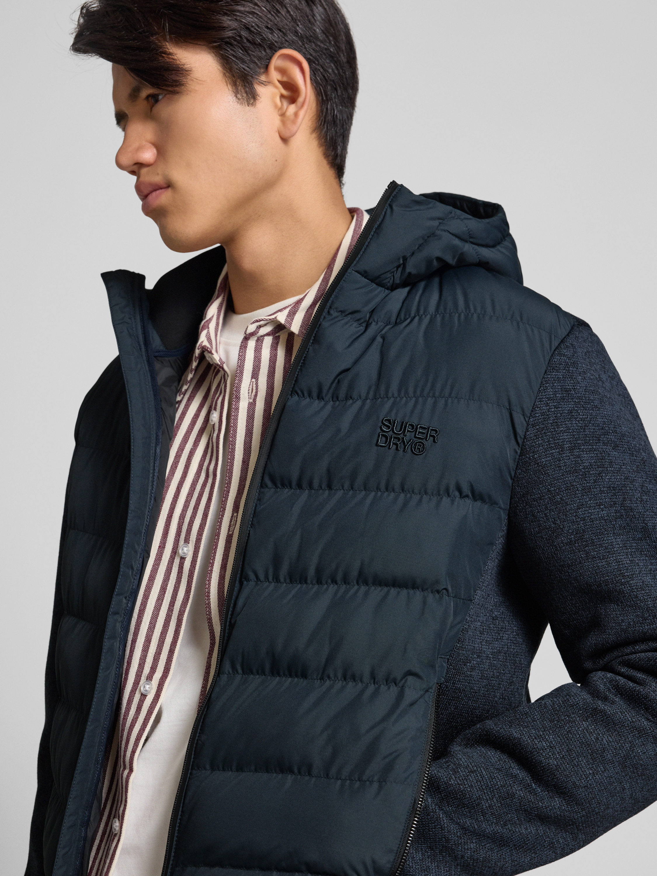Die Herren Steppjacke von Superdry, Modell 'Hooded Storm Knit Hybrid', kombiniert Stil und Funktionalität mit einem Regular Fit und einer praktischen Kapuze. Das Material bietet zuverlässigen Schutz an kühlen Tagen, während die Reißverschlusstaschen eine sichere Aufbewahrung ermöglichen. Ideal für vielseitige Einsatzmöglichkeiten im Alltag.