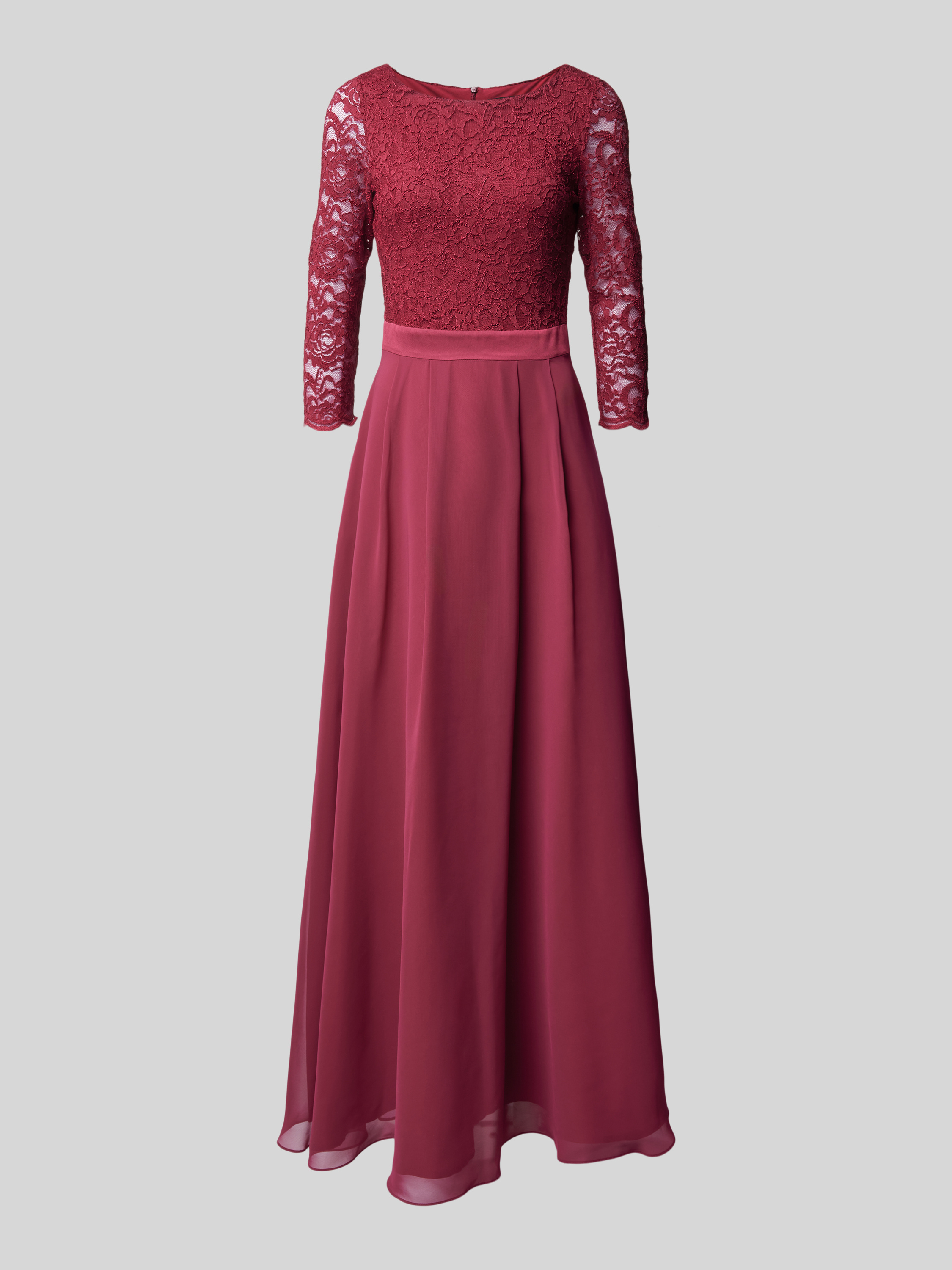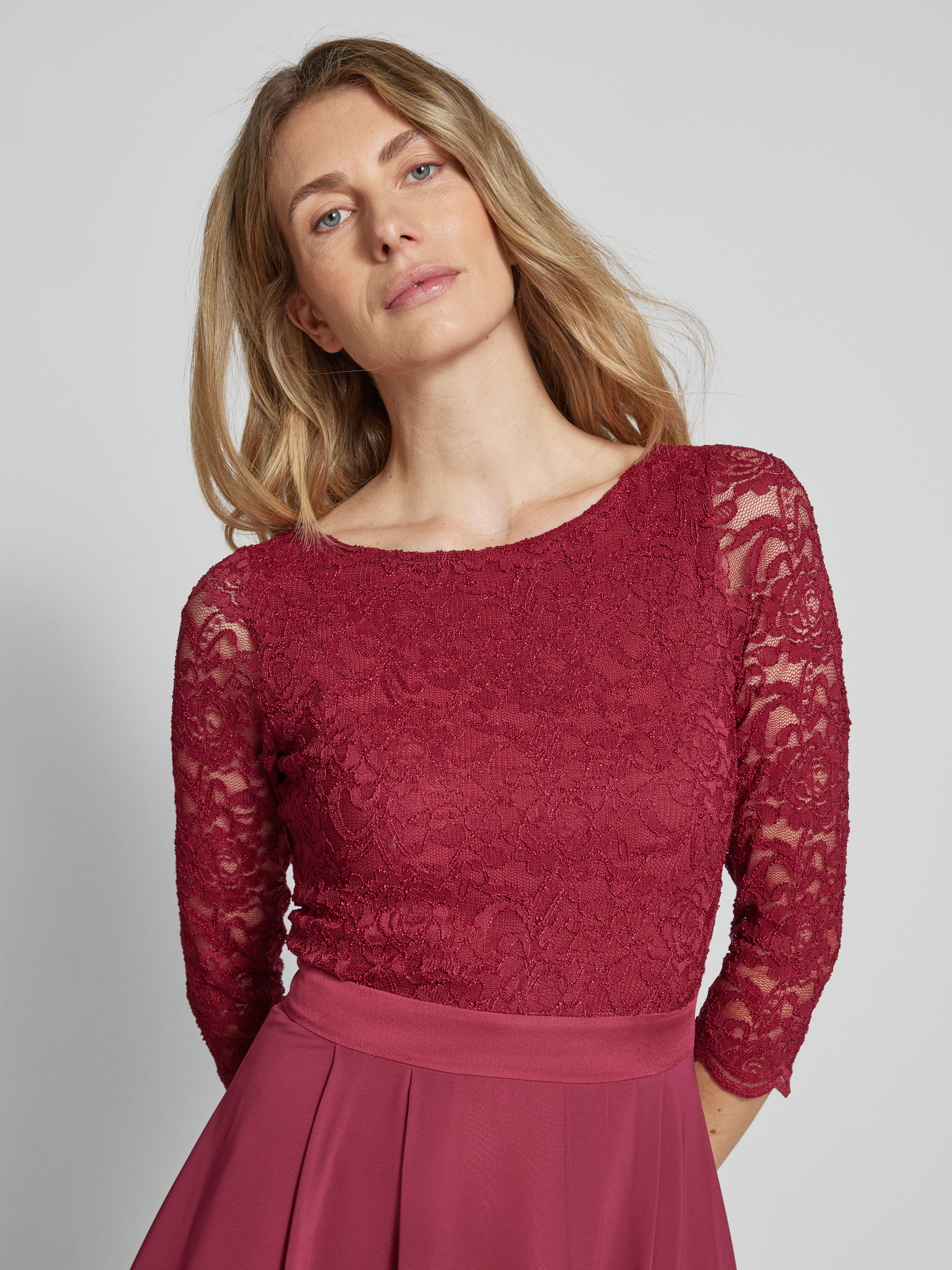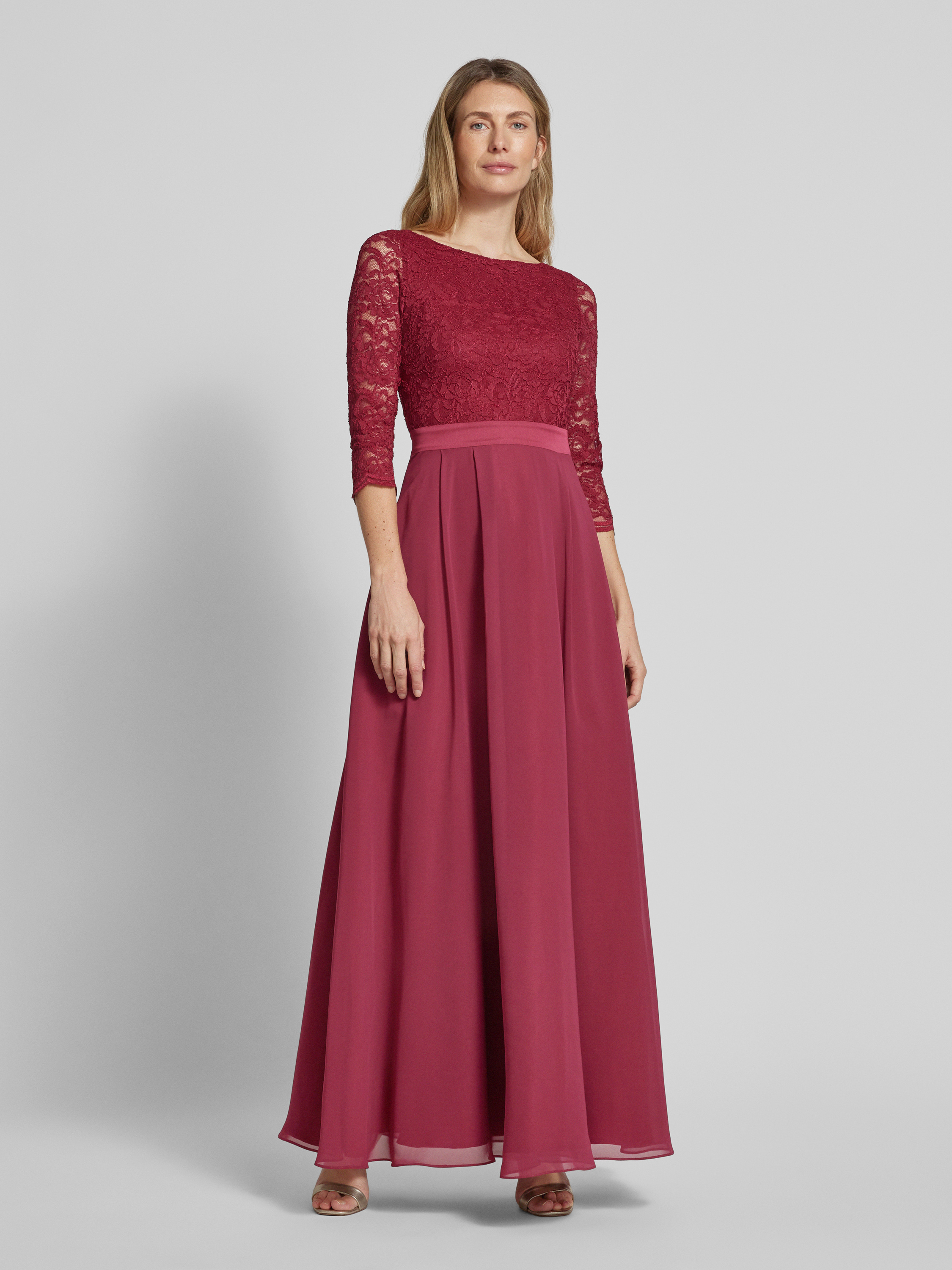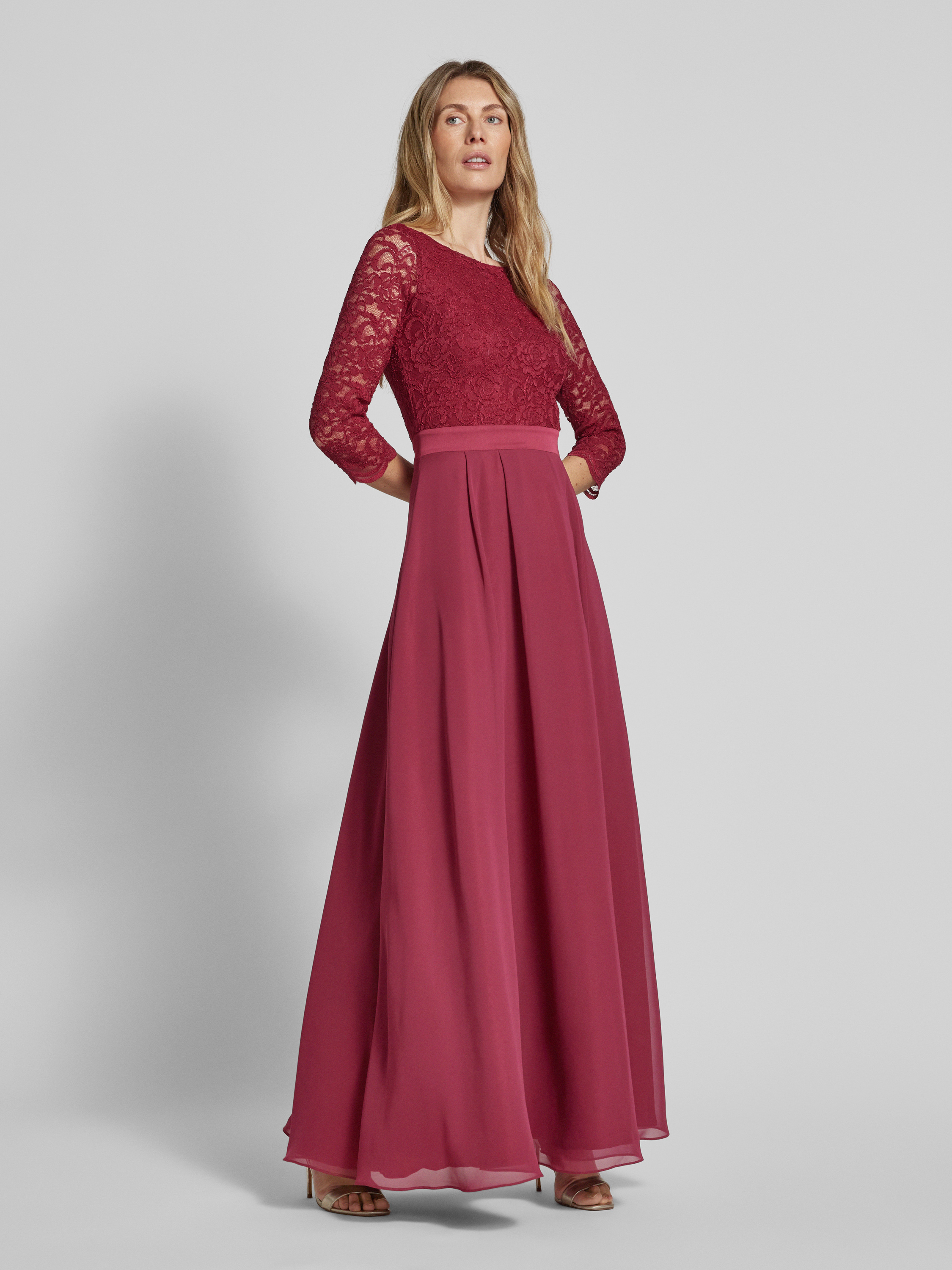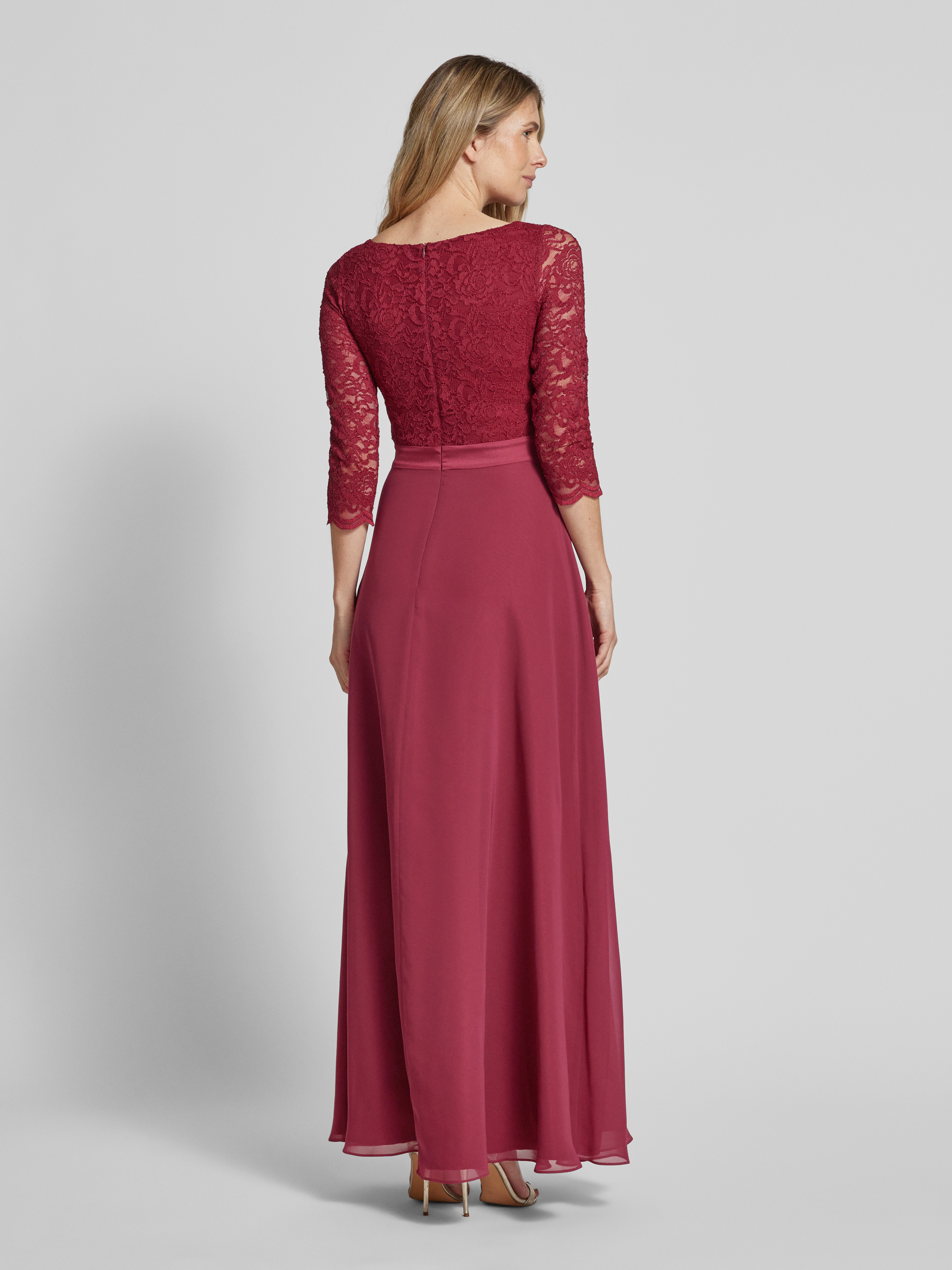 Das Abendkleid mit Ausbrenner-Effekt von SWING fällt durch seinen fließenden Chiffon und die leichte A-Linie angenehm ins Auge. Durch den Stufen-Look entsteht ein lockerer Fall, der Bewegungsfreiheit lässt. Der Ausbrenner-Effekt sorgt für eine dezente, strukturierte Optik.