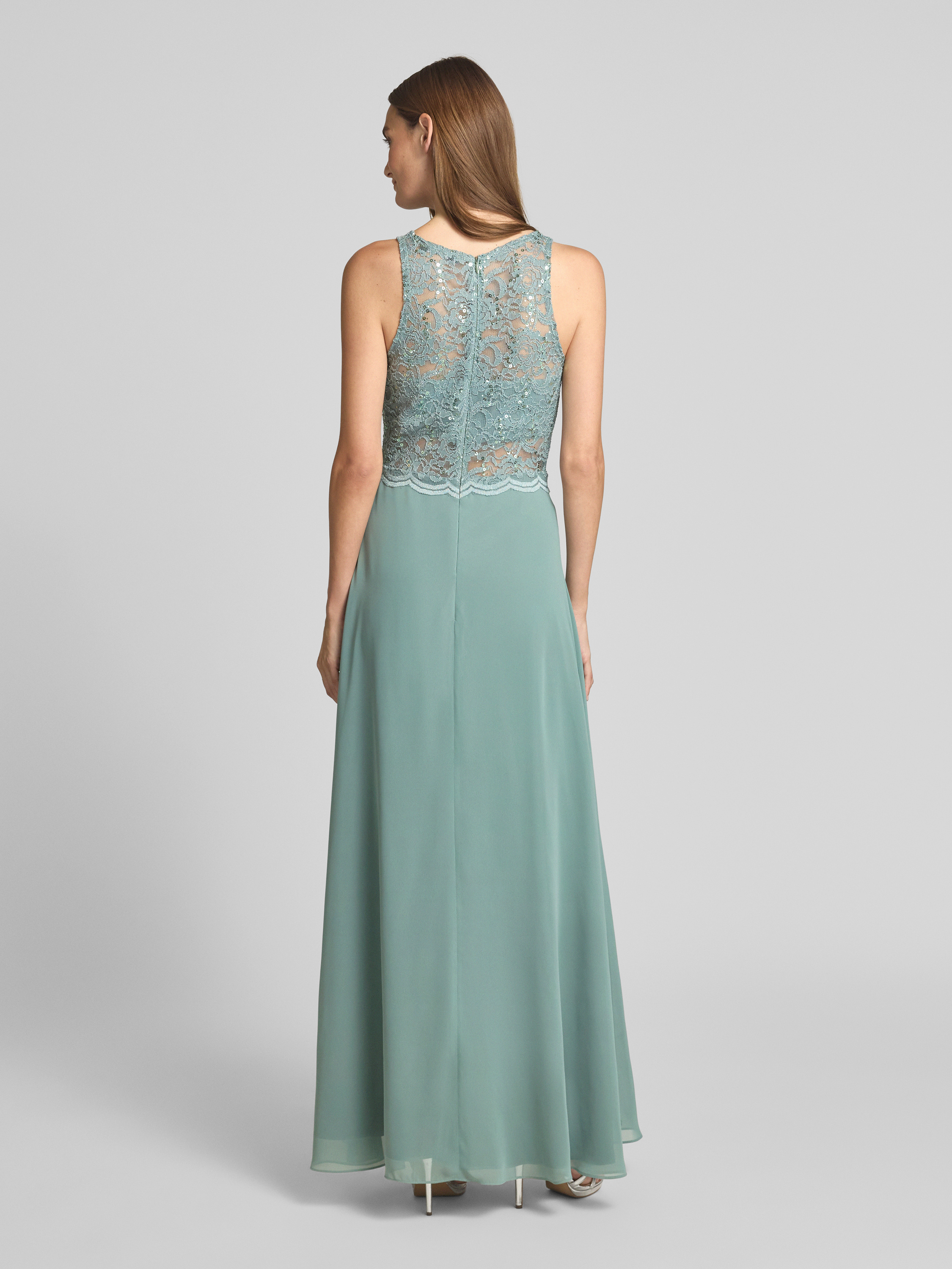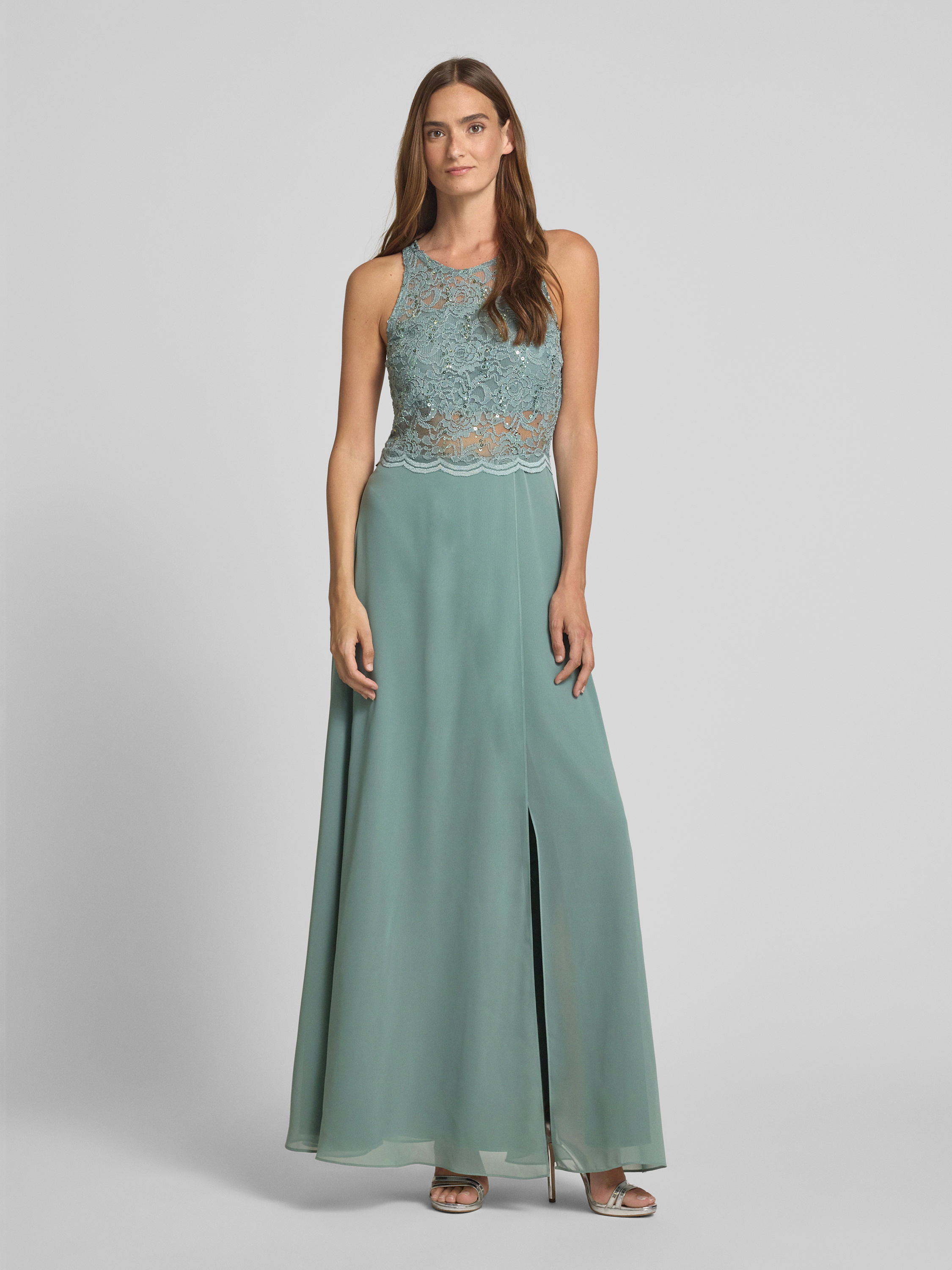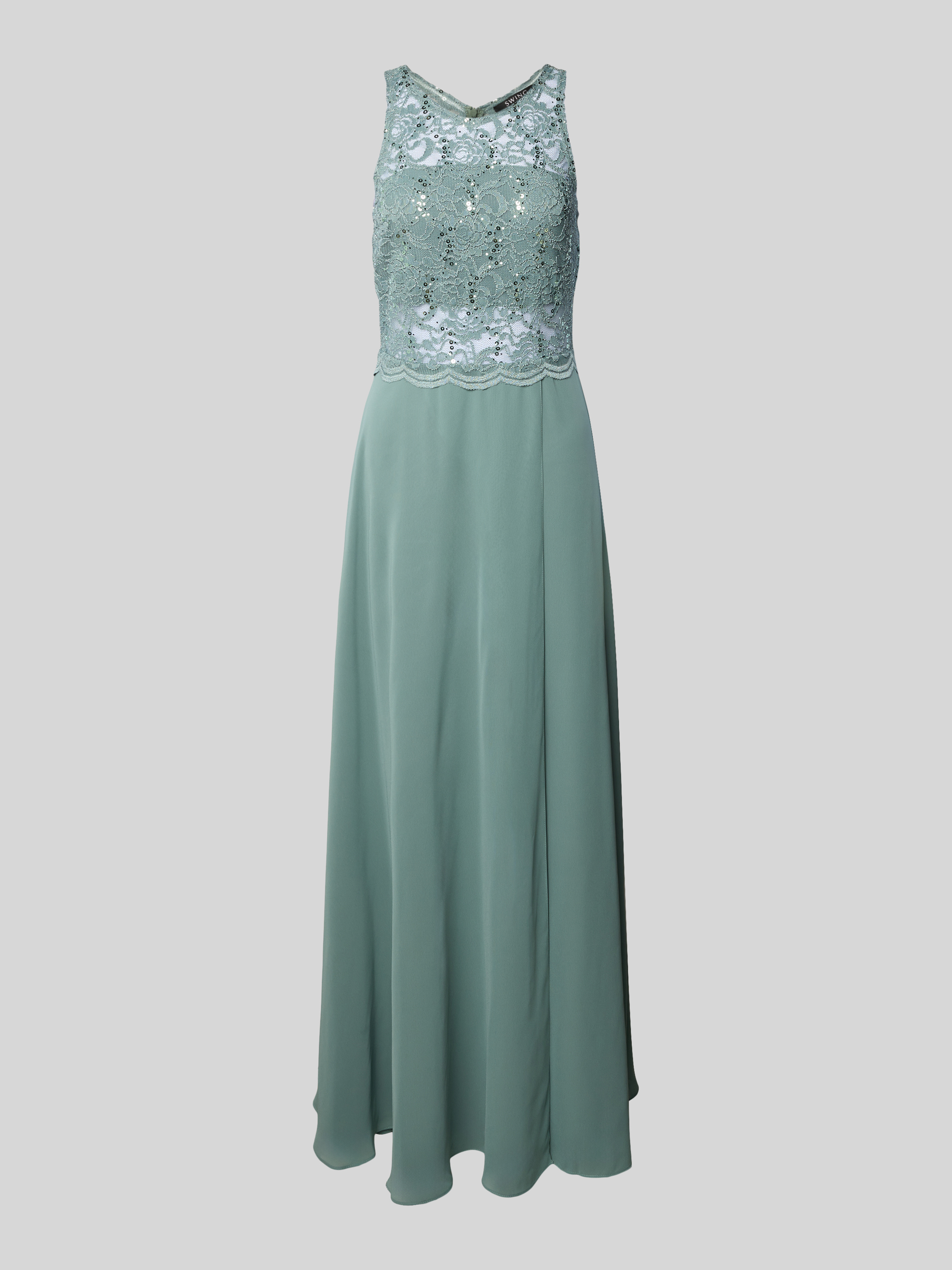 Das Swing Abendkleid beeindruckt durch seinen taillierten Schnitt und den eleganten Rundhalsausschnitt. Der Paillettenbesatz verleiht dem semitransparenten Design einen besonderen Glanz. Der ausgestellte Rock und der blickdichte Unterrock sorgen für eine anmutige Silhouette.
