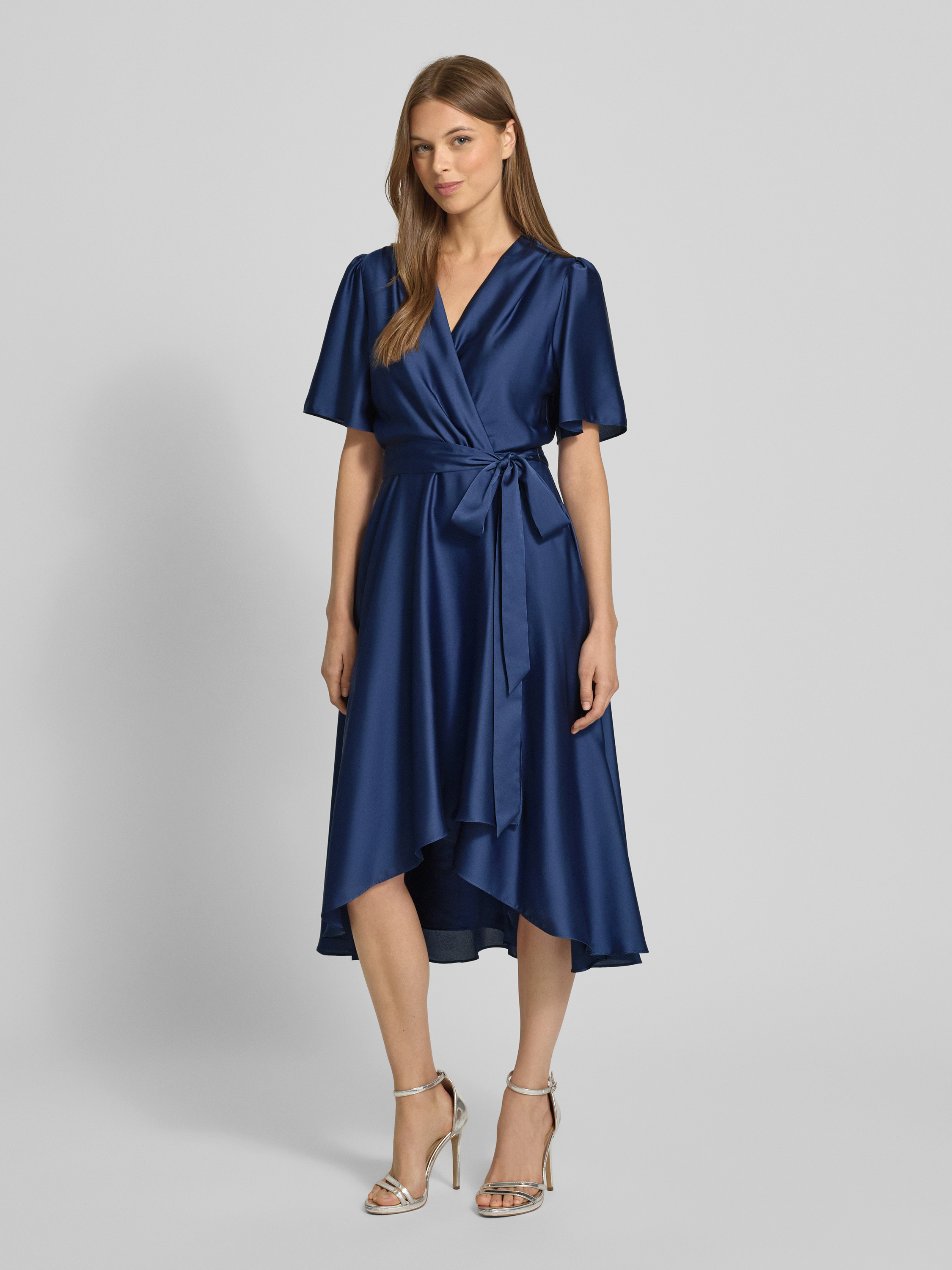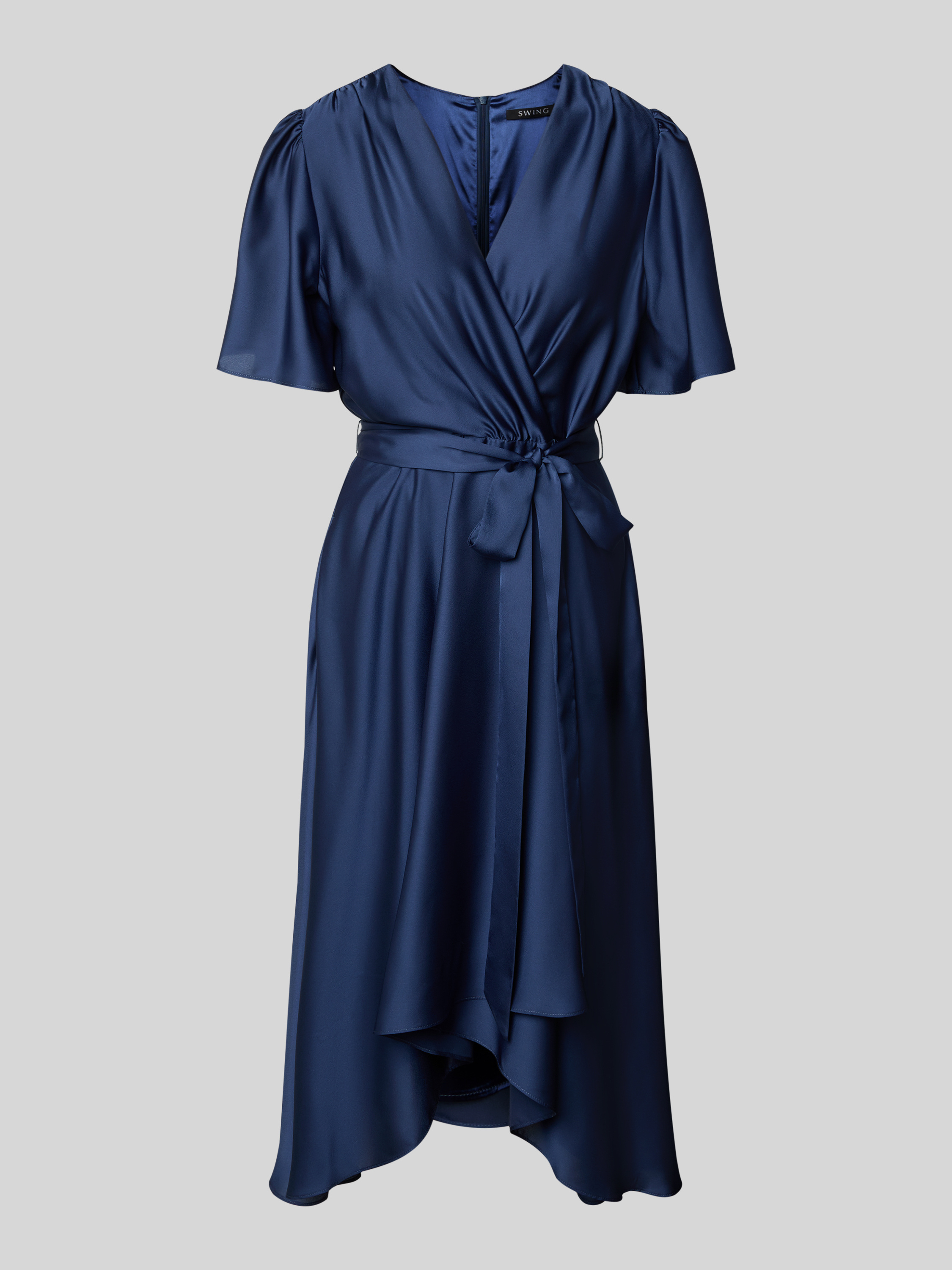 Das Swing Cocktailkleid mit Bindegürtel überzeugt durch seinen taillierten Schnitt und die elegante Wickel-Optik, die die Silhouette vorteilhaft betont. Der V-Ausschnitt verleiht dem Midikleid eine ansprechende Note, während der Bindegürtel individuell angepasst werden kann und für zusätzlichen Tragekomfort sorgt.