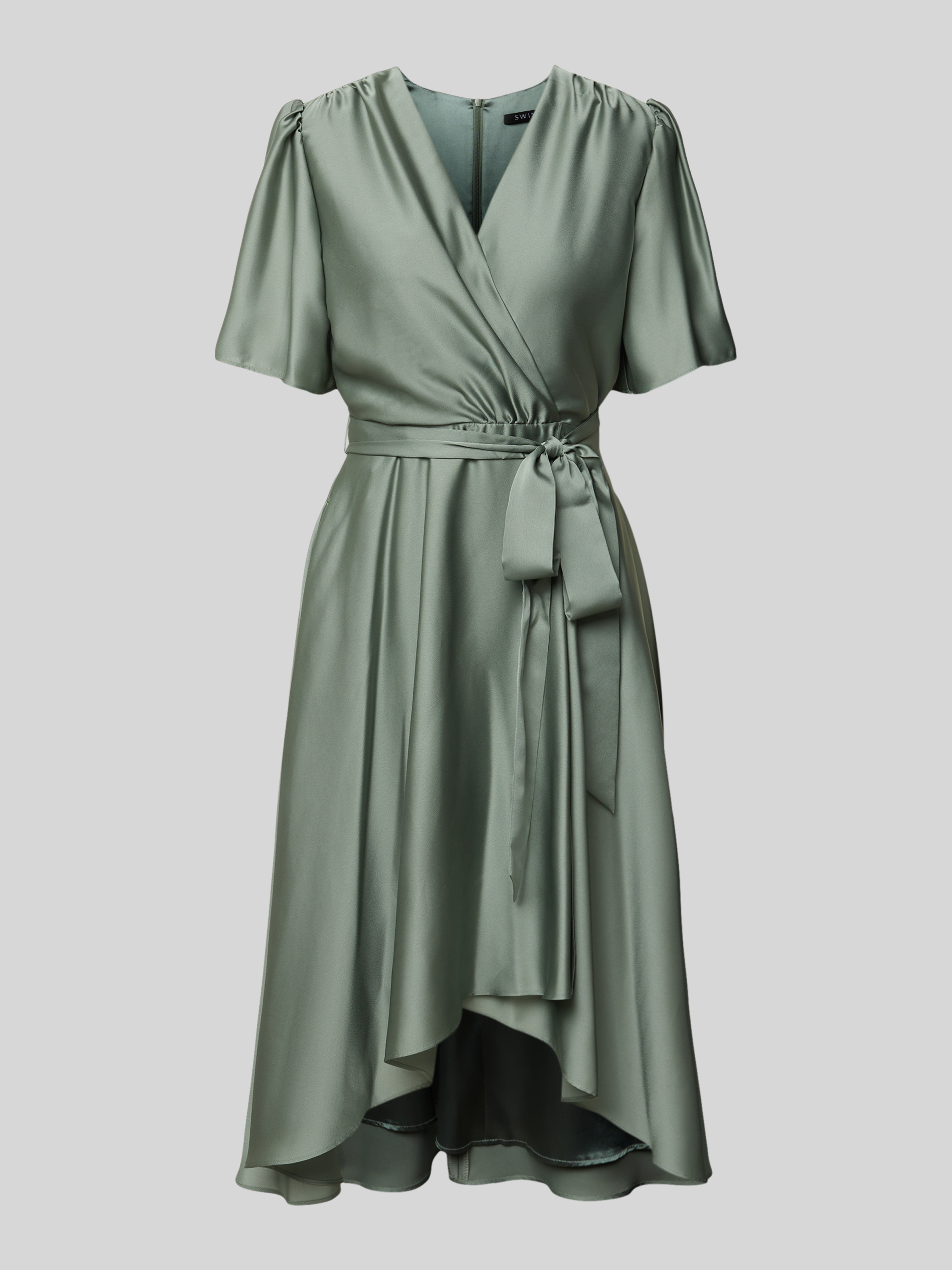 Das Swing Cocktailkleid mit Bindegürtel überzeugt durch seinen taillierten Schnitt und die elegante Wickel-Optik, die die Silhouette vorteilhaft betont. Der V-Ausschnitt verleiht dem Midikleid eine ansprechende Note, während der Bindegürtel individuell angepasst werden kann und für zusätzlichen Tragekomfort sorgt.