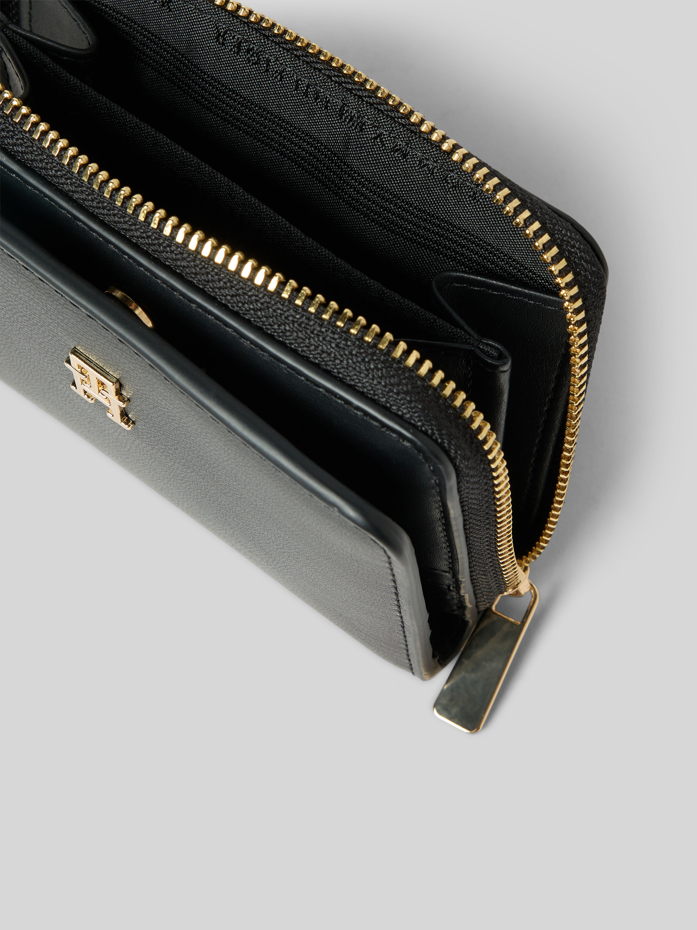 Das Damen Portemonnaie von Tommy Hilfiger in Lederoptik zeigt sich unifarben und wirkt dadurch angenehm zurückhaltend. Dank der durchdachten Aufteilung mit Münzfach, Kartenfächern und Geldscheinfach lässt sich der Alltag strukturiert gestalten. Eine dezente Logo-Applikation aus Metall rundet das Design funktional ab.