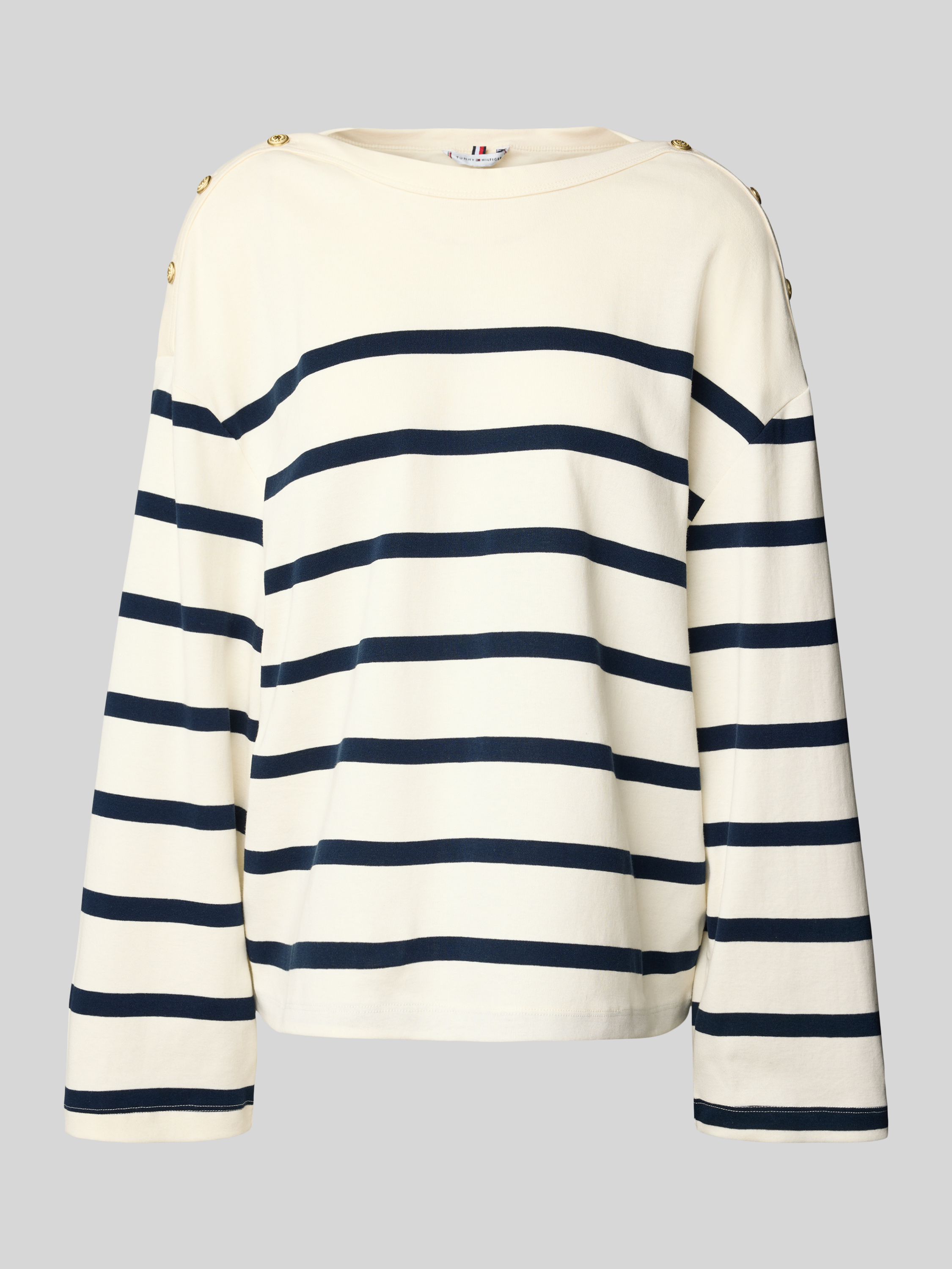 Das Damen Langarmshirt von Tommy Hilfiger kombiniert ein entspanntes Tragegefühl mit stilvollem Design. Hergestellt aus reiner Baumwolle, eignet es sich ideal für den Alltag. Das gestreifte Allover-Muster und die goldfarbenen Knöpfe an den Schultern verleihen dem Shirt einen besonderen Akzent.