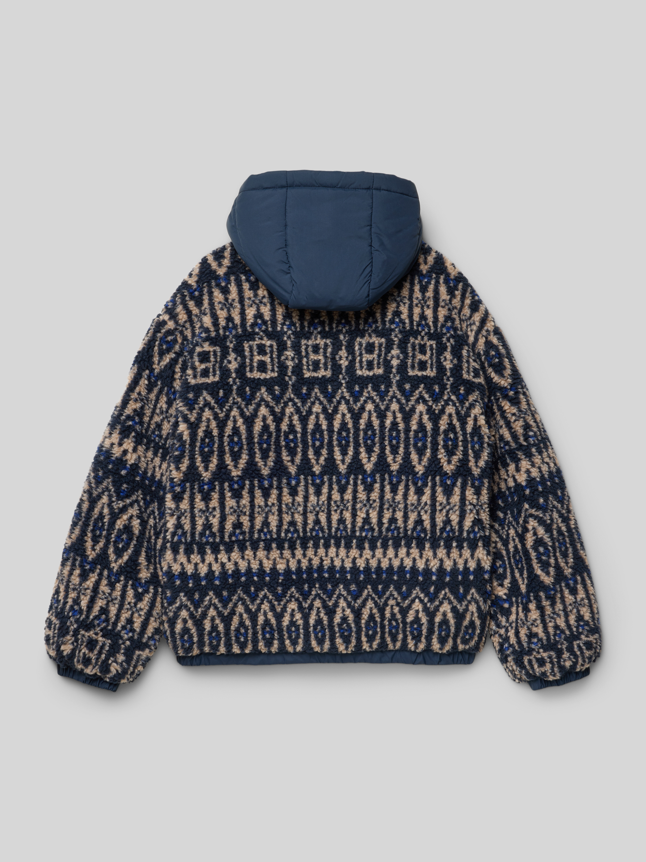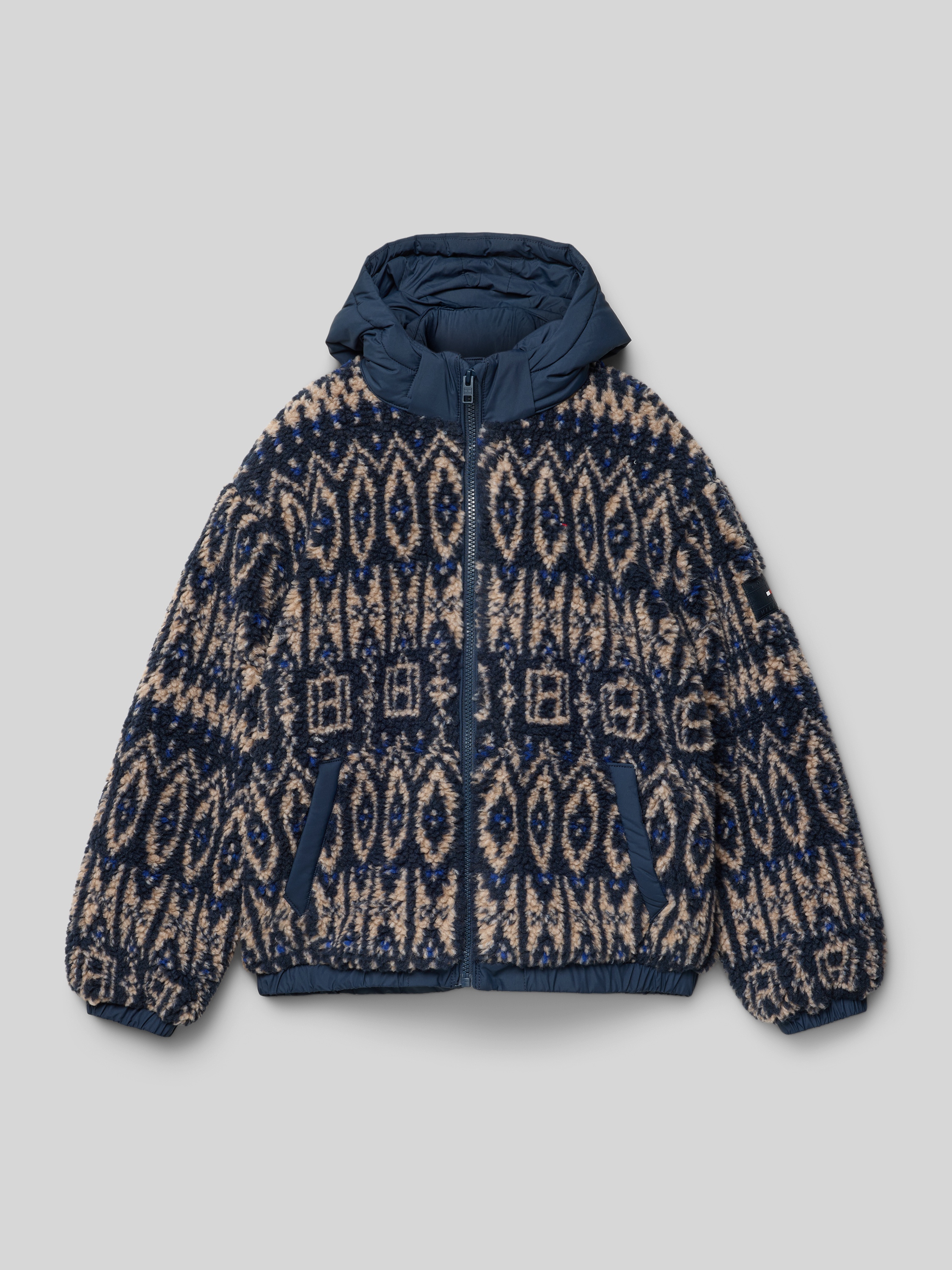 Die Regular Fit Teddyjacke von Tommy Hilfiger Teens zeigt ein norwegisch inspiriertes Allover-Muster und bringt durch ihre abnehmbare Kapuze Flexibilität in den Alltag. Der angenehme Schnitt lässt Bewegungsfreiheit zu, während Stehkragen und lange Ärmel für angenehmen Tragekomfort sorgen. Pattentaschen runden das Design praktisch ab.