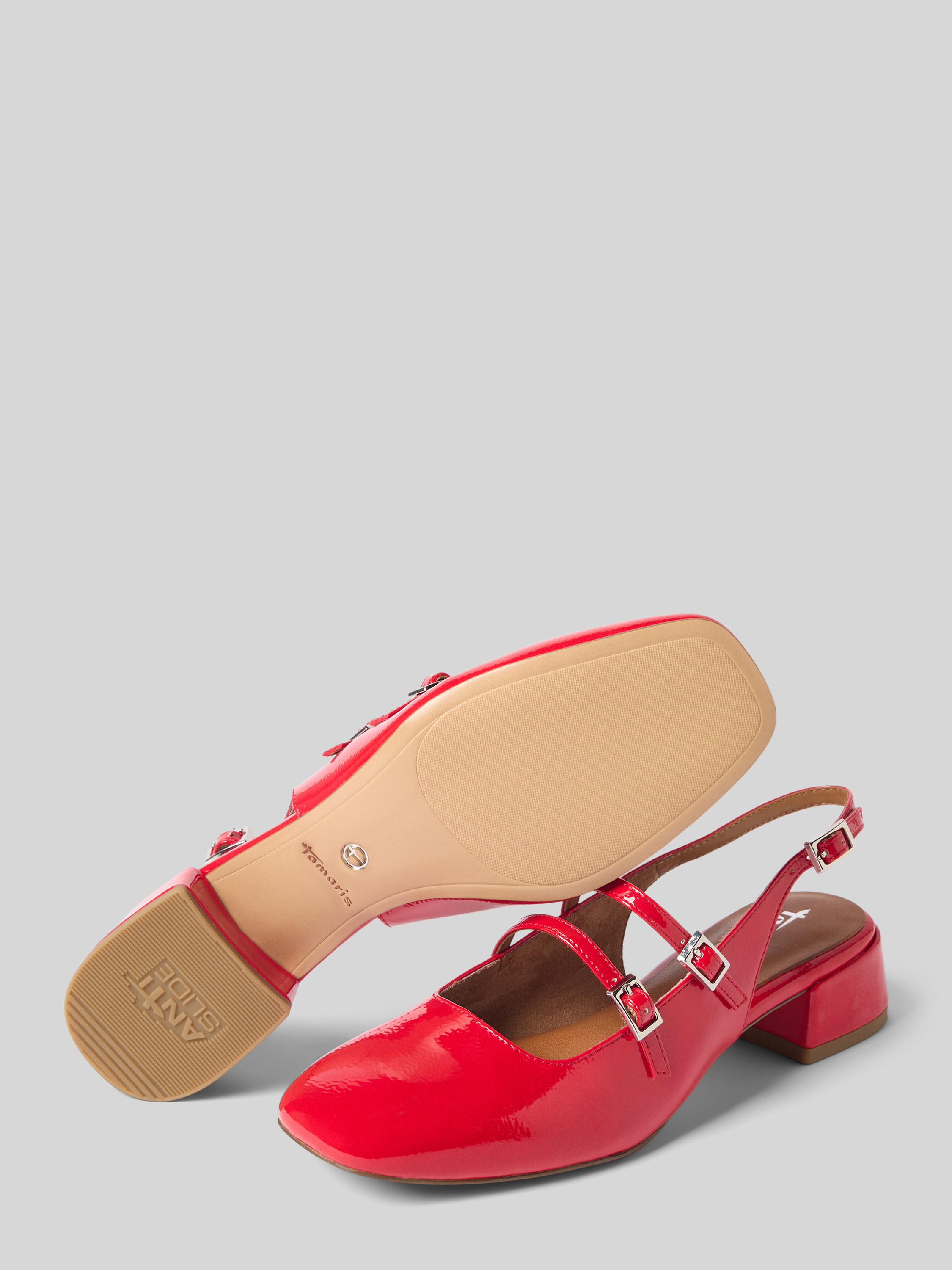 Die Tamaris Pumps mit Blockabsatz kombinieren eine abgerundete Spitze mit einem eleganten Riemen und Dornschließen, was einen sicheren Halt ermöglicht. Der bequeme 3 cm hohe Blockabsatz verleiht Stabilität und sorgt für ein angenehmes Tragegefühl. Die glatte Sohle rundet das Design harmonisch ab.