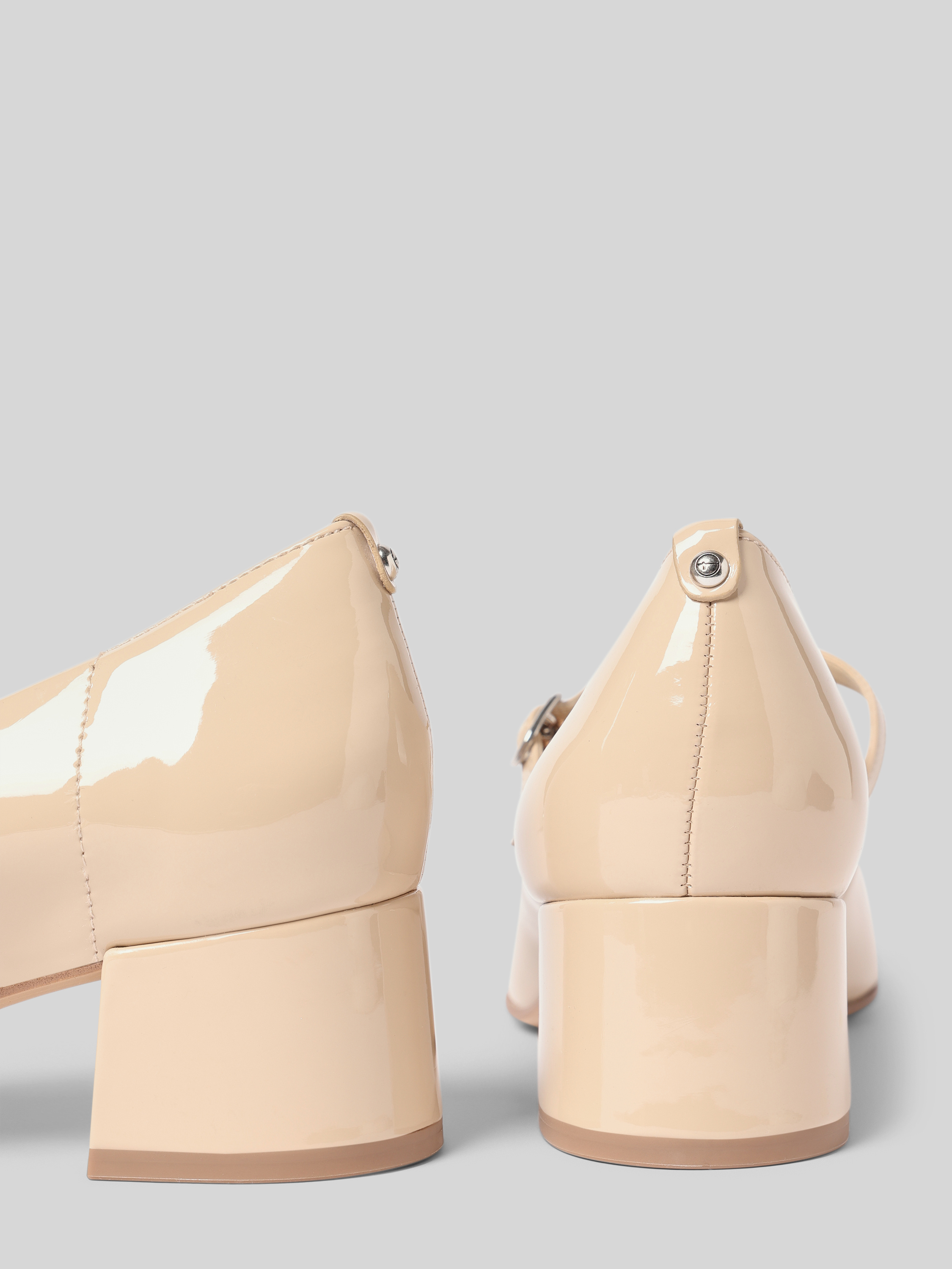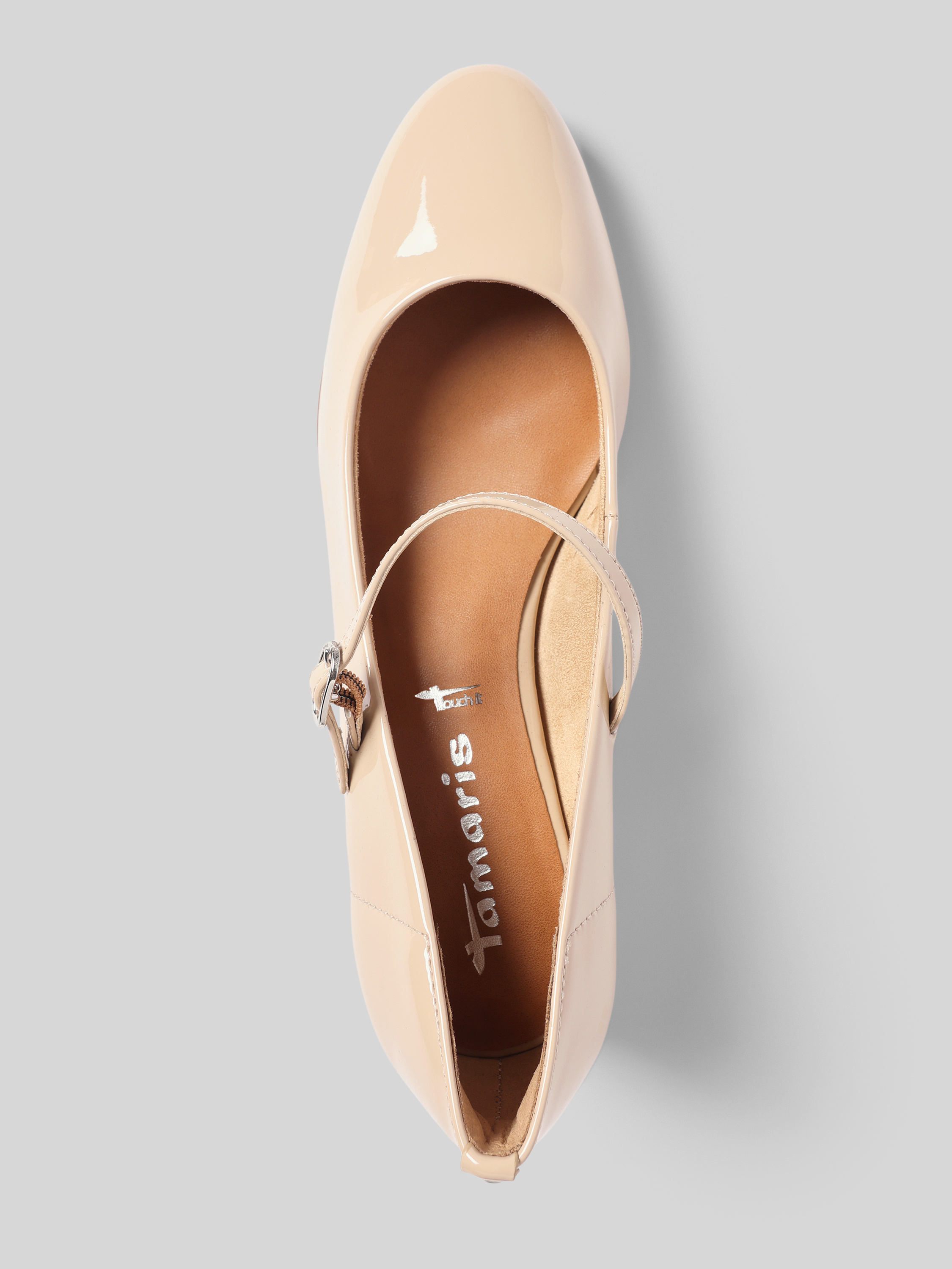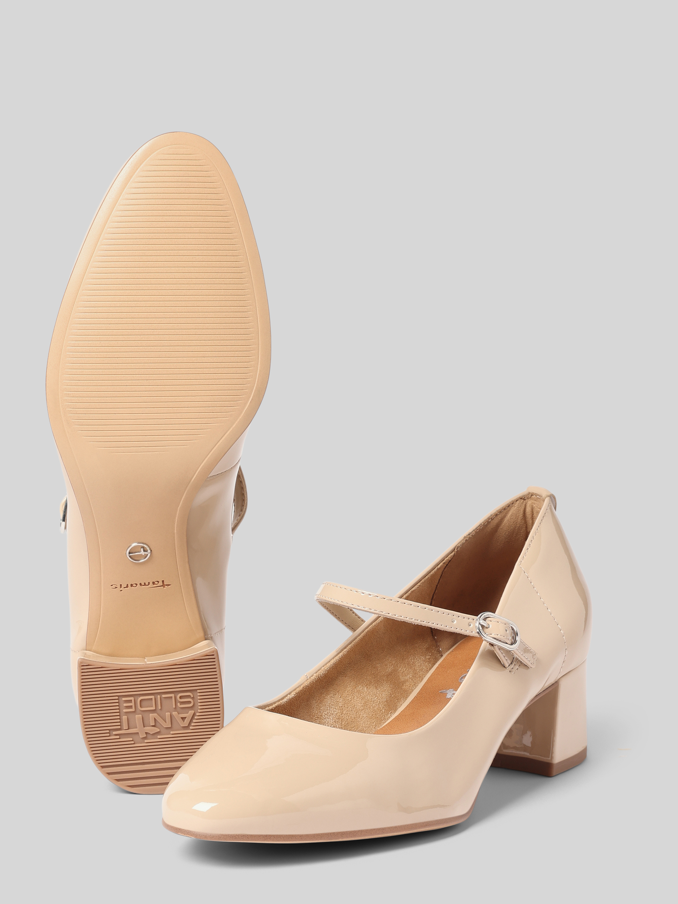 Die Pumps mit Dornschließe von Tamaris präsentieren sich in einer abgerundeten Form und einer glänzenden Optik, die Eleganz und Stil vereinen. Der dünne Riemen mit Dornschließe sorgt für einen sicheren Halt, während der Blockabsatz Komfort bietet. Ideal für lange Tage und elegante Anlässe.