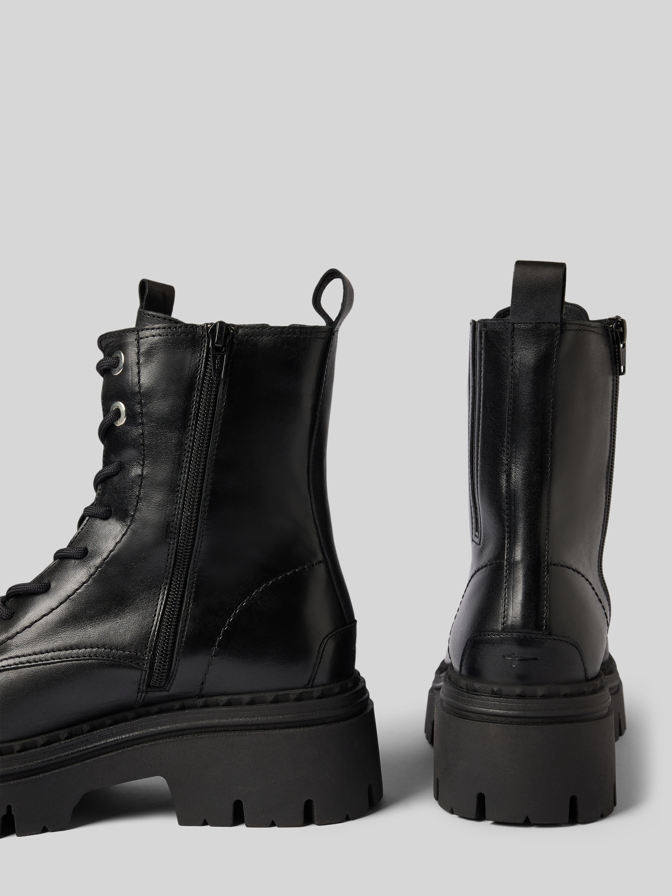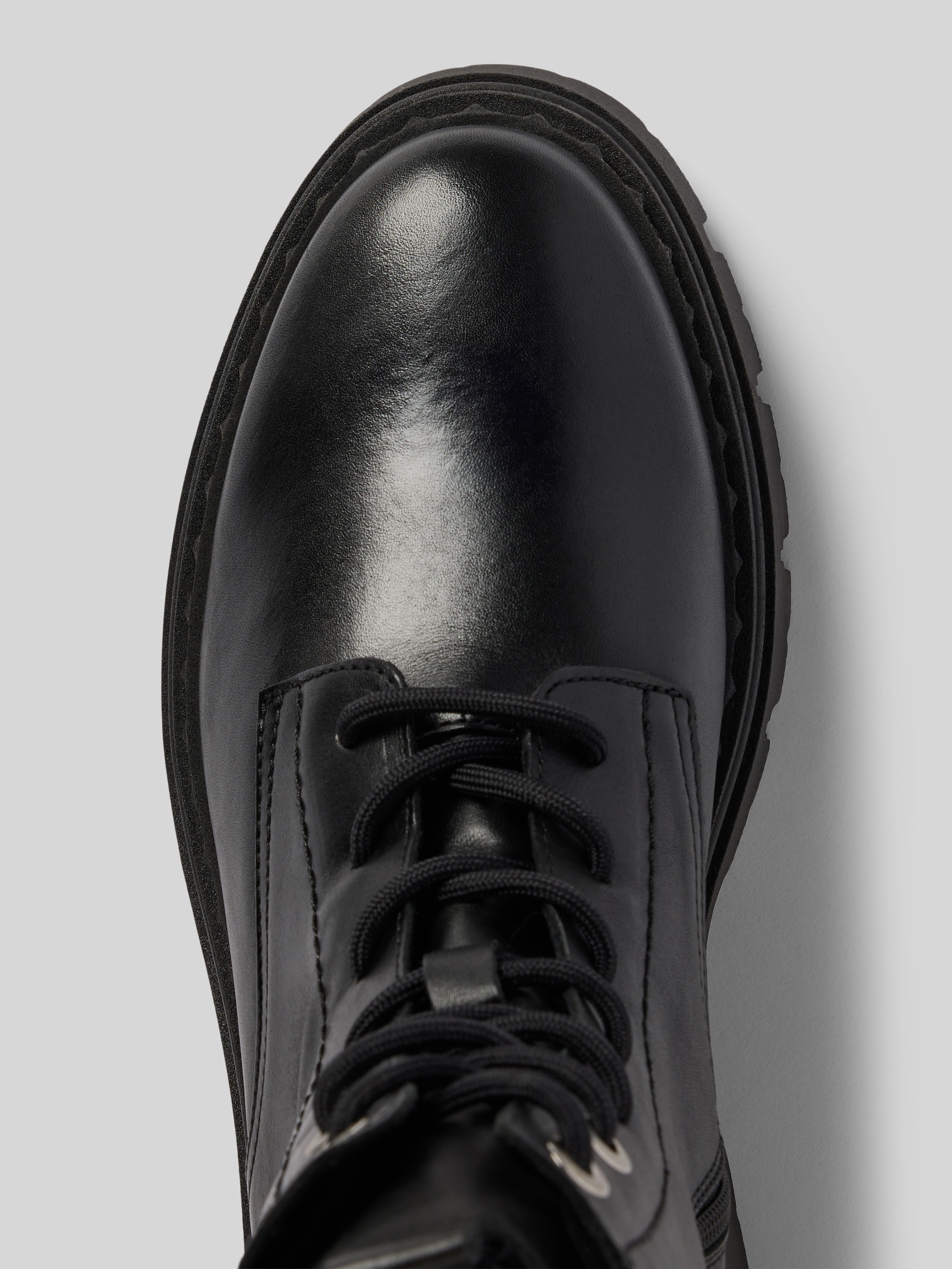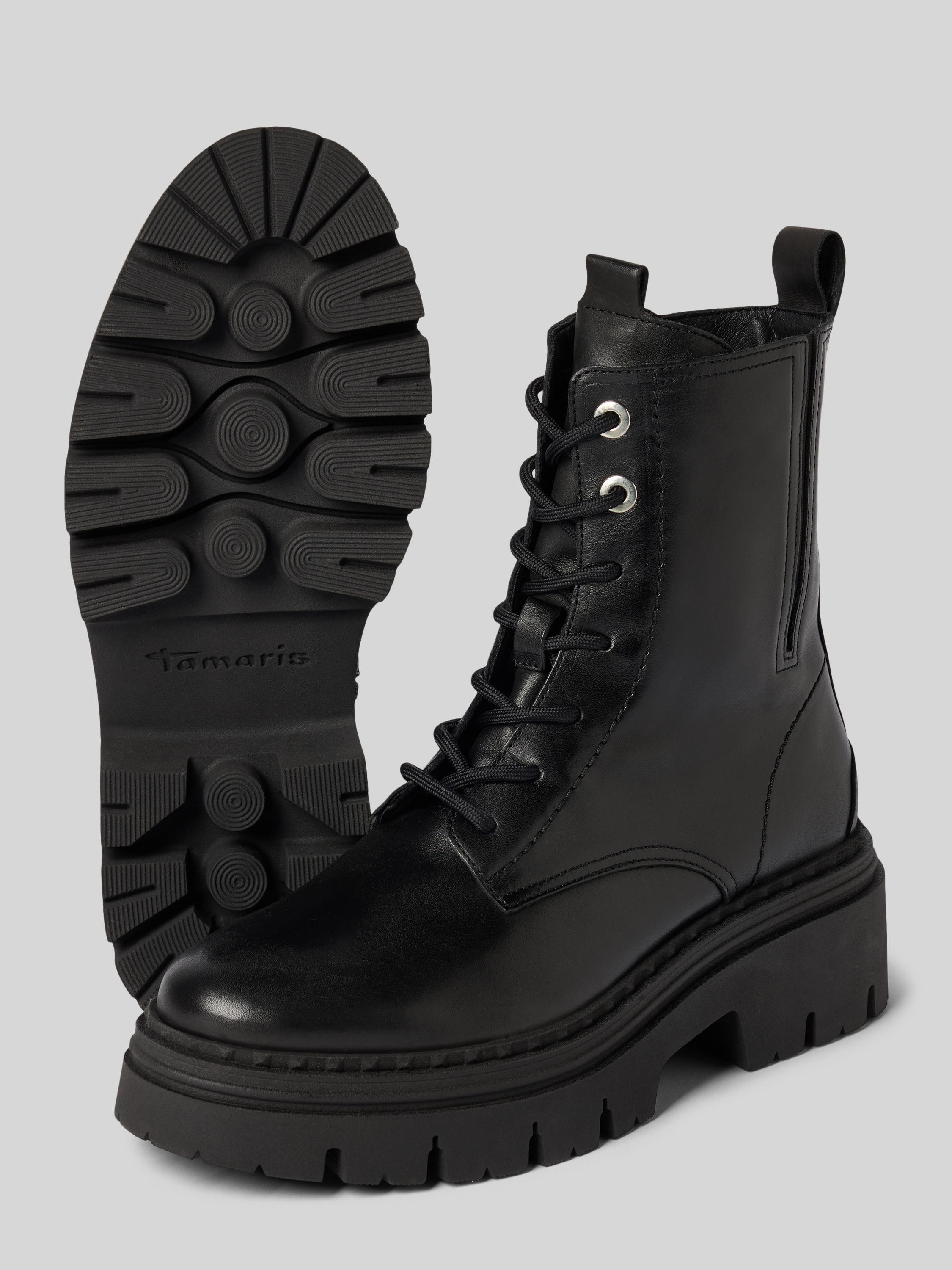 Die Damen Schnürstiefel von Tamaris aus Rindsleder zeigen sich in unifarbener Optik und verbinden einen klassischen Schnitt mit einer angenehm abgerundeten Schuhspitze. Durch den Blockabsatz entsteht ein komfortabler Stand, während das glatte Leder robust und geschmeidig wirkt. Dezente Label-Prägungen runden das Erscheinungsbild ab.