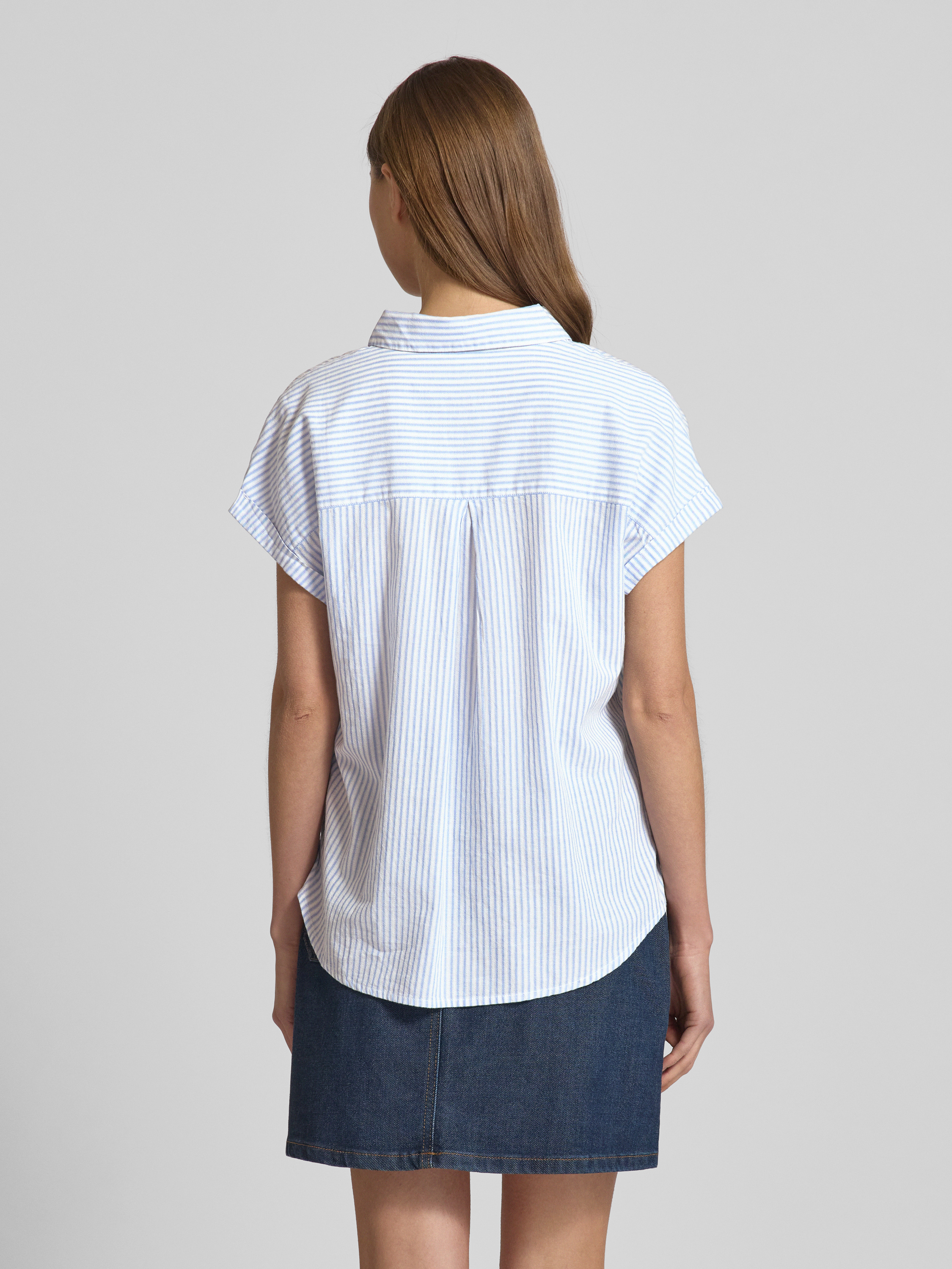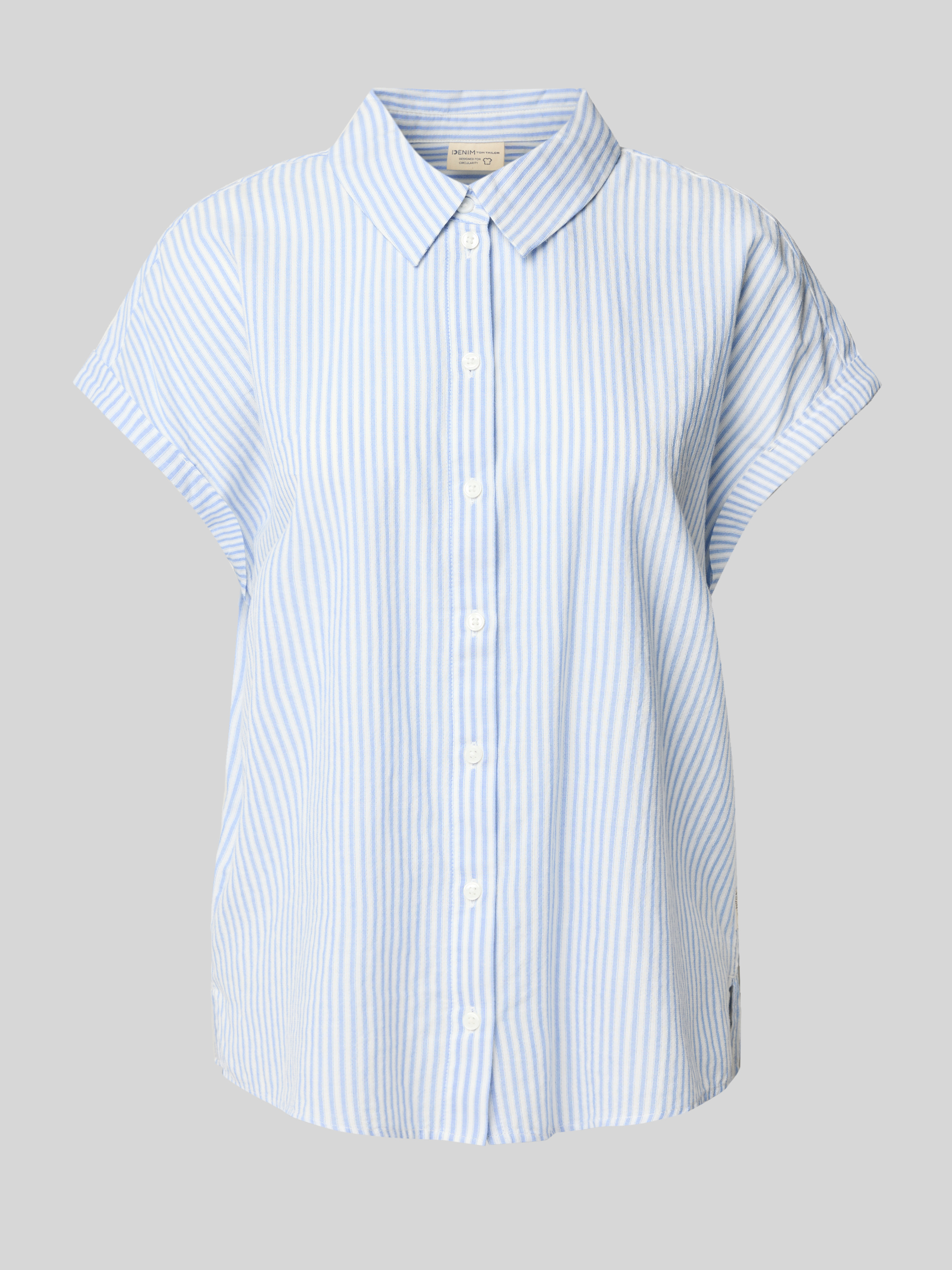 Die Damen Loose Fit Bluse von Tom Tailor Denim kombiniert ein gestreiftes Allover-Muster mit einer angenehm lockeren Passform. Durch den klassischen Hemdkragen und die feine Webstruktur aus reiner Baumwolle eignet sich das Modell für vielfältige Kombinationen. Kurze Ärmel mit fixiertem Umschlag ergänzen den entspannten Stil.