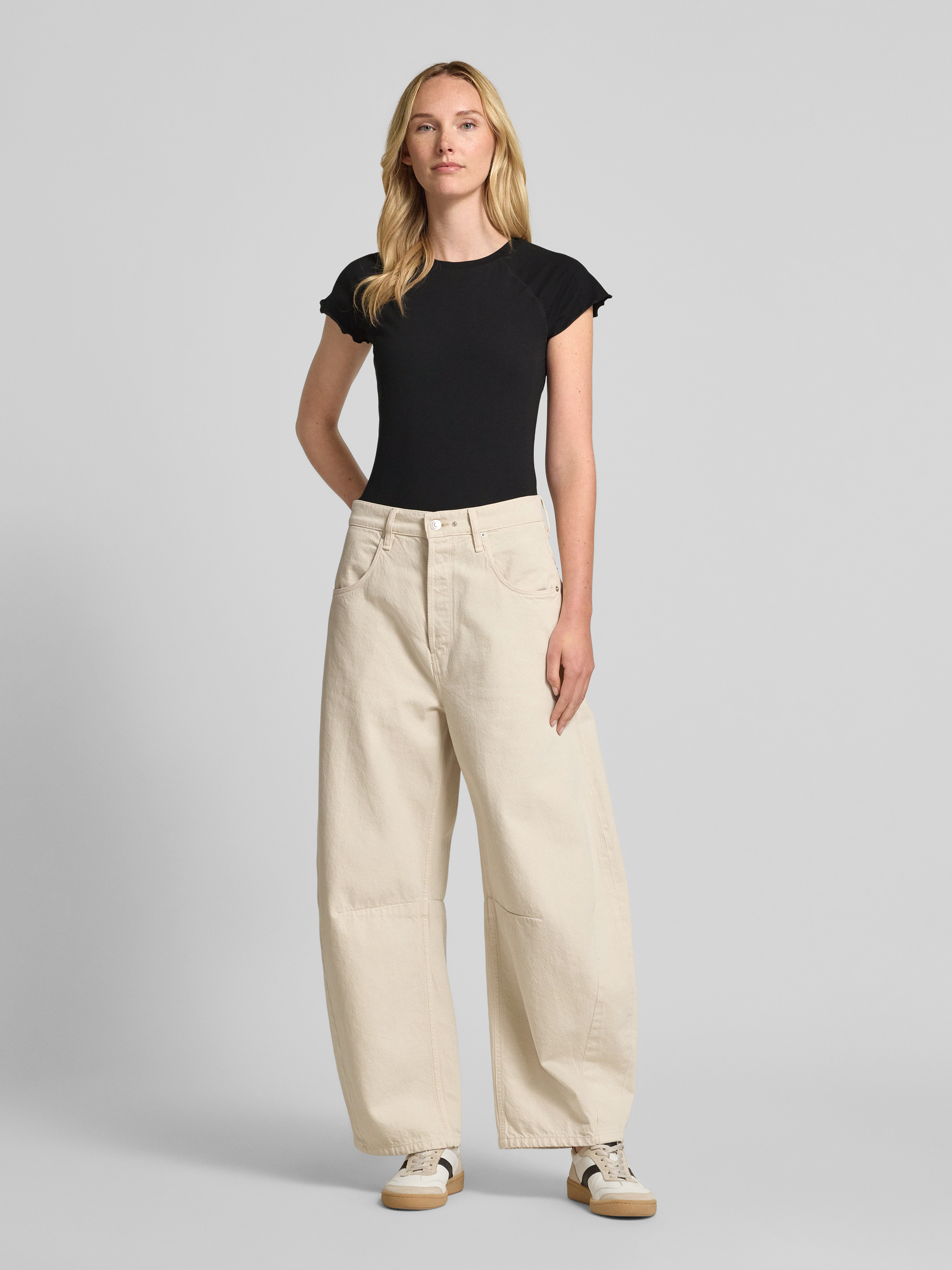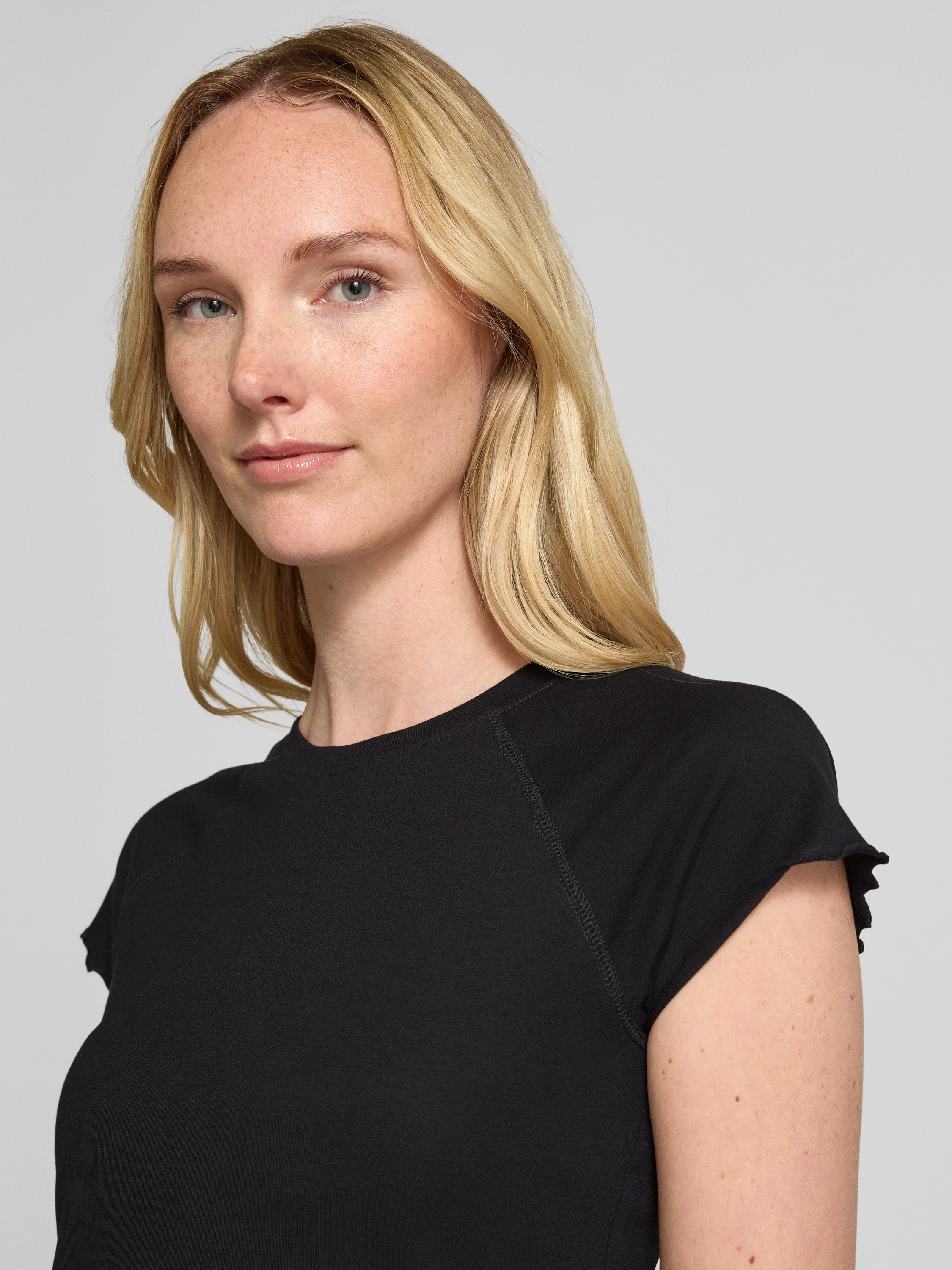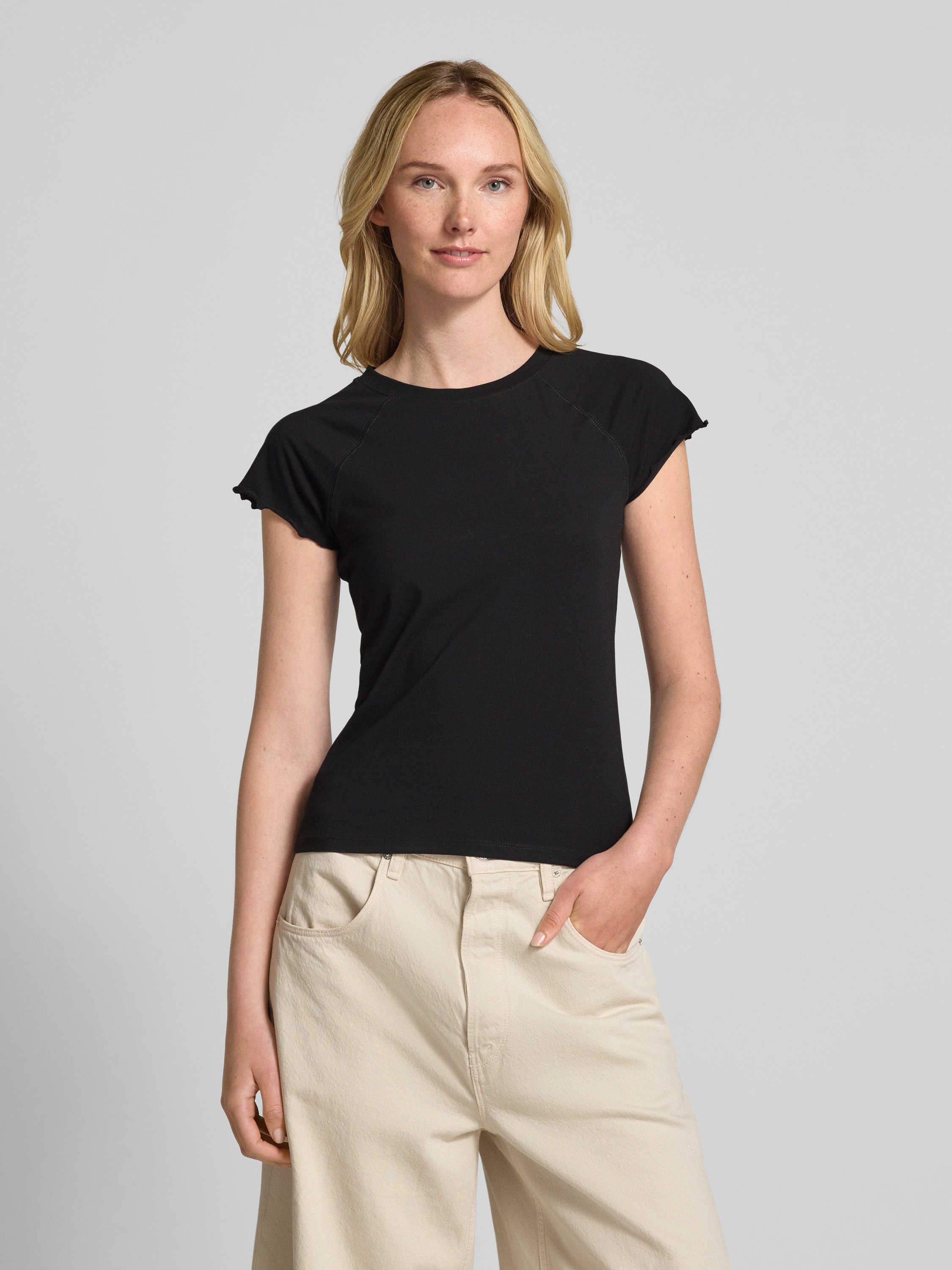 Das Tom Tailor Denim T-Shirt mit Regular Fit Passform kombiniert stilvoll einen unifarbenen Look mit einem bequemen Rundhalsausschnitt und charmanten Frill-Ärmeln. Der Baumwoll-Mix sorgt für ein angenehmes Tragegefühl, während die Raglanärmel subtile Bewegungsfreiheit ermöglichen und dabei eine legere Silhouette schaffen.