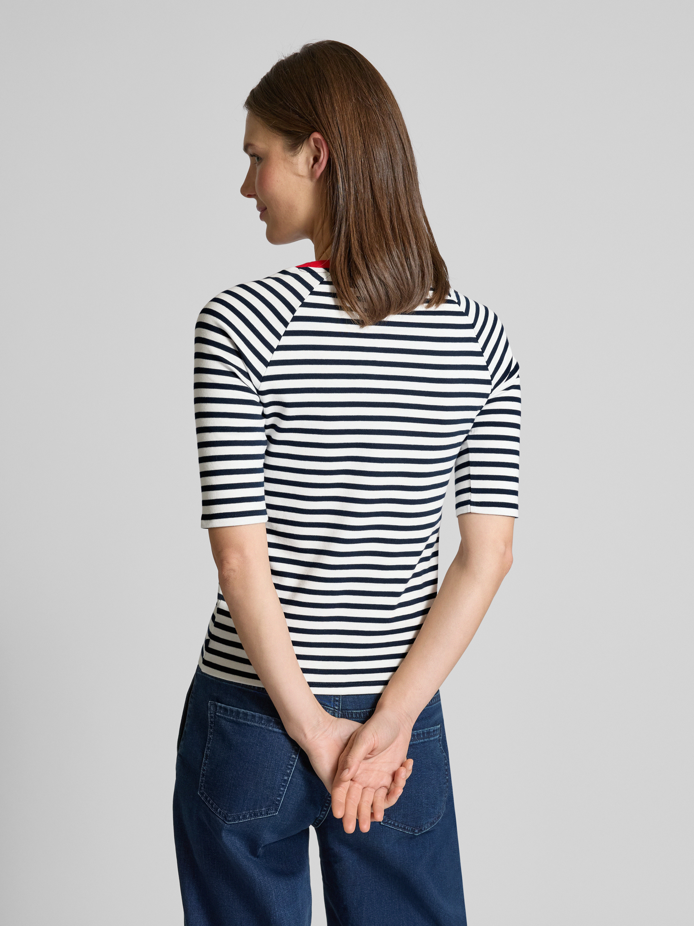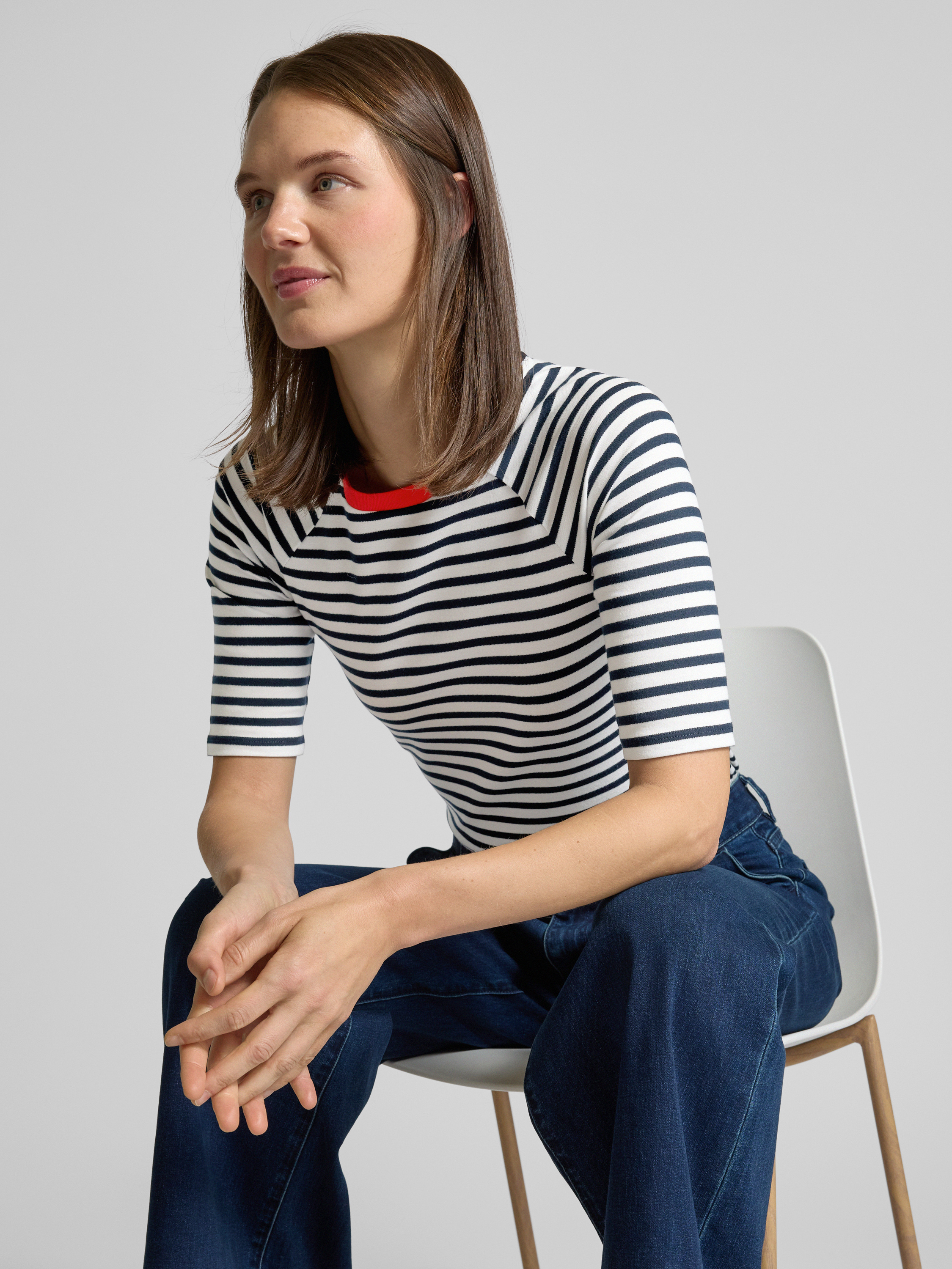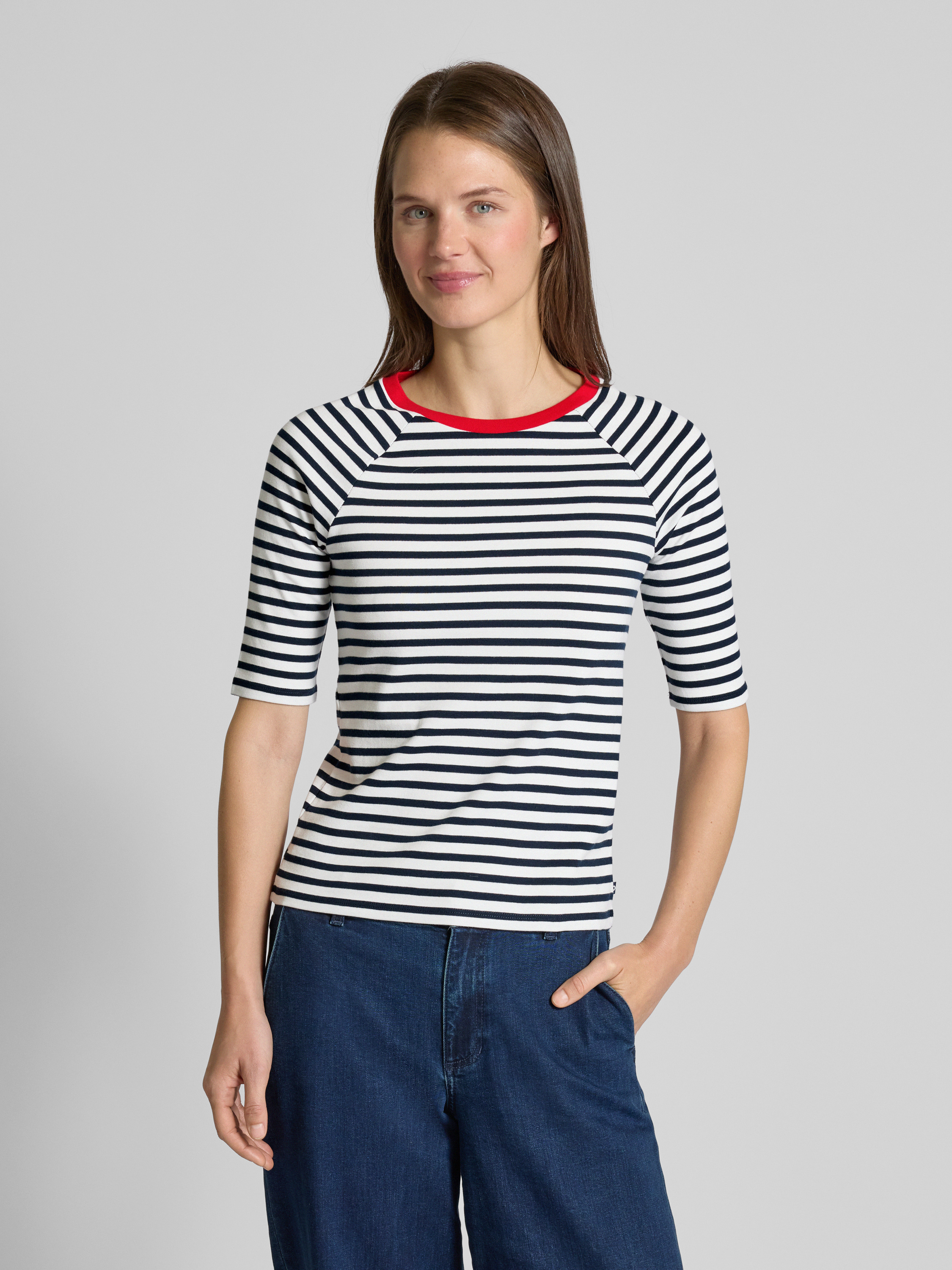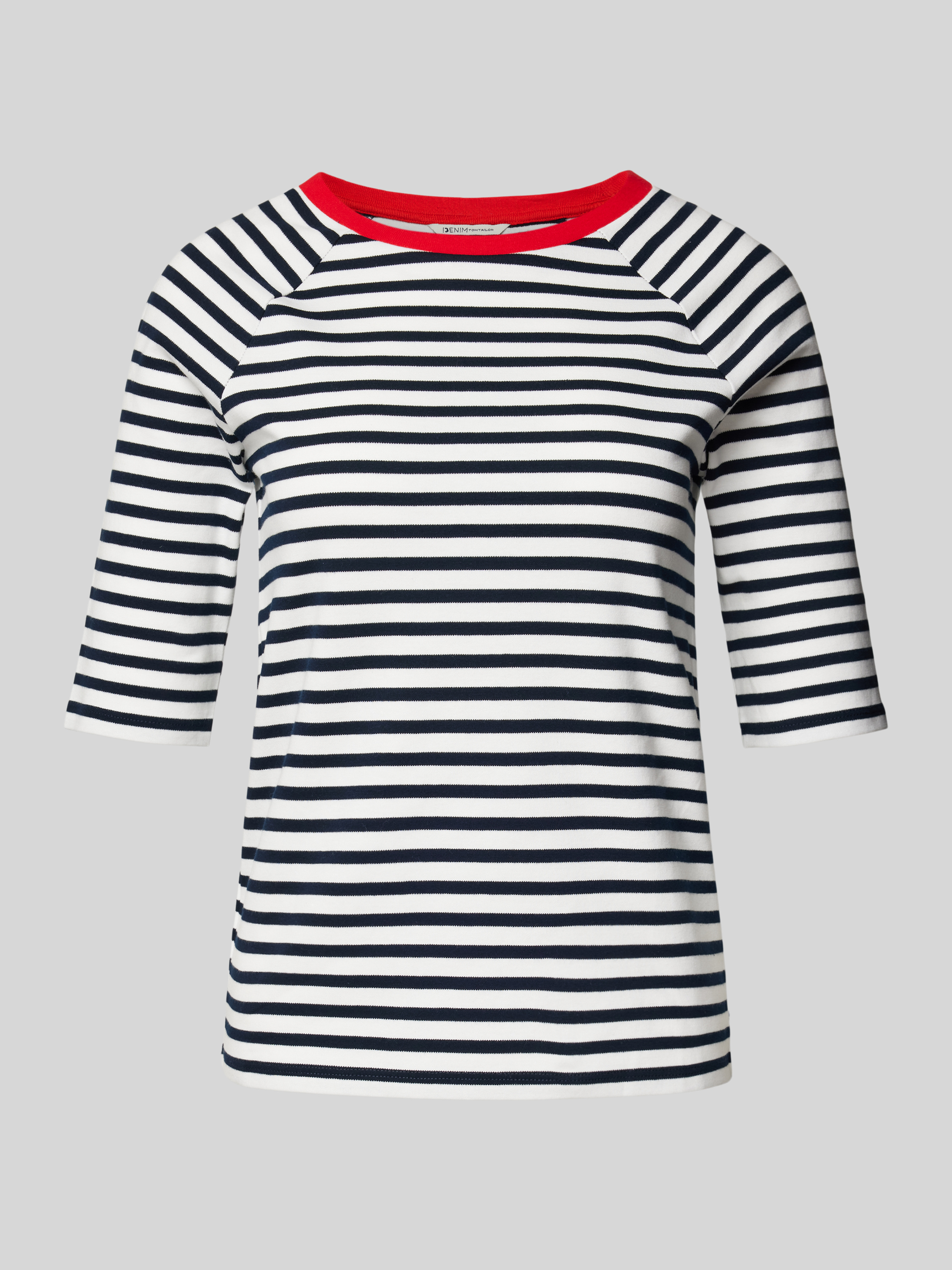 Das Damen T-Shirt von Tom Tailor Denim überzeugt durch seinen entspannten Regular Fit und das lebhafte Streifenmuster. Die reine Baumwollverarbeitung sorgt für ein angenehmes Tragegefühl, während der Rundhalsausschnitt und die Kurzarm-Raglanärmel für einen lässigen Look sorgen. Ein kontrastfarbener Kragen setzt zusätzlich Akzente.