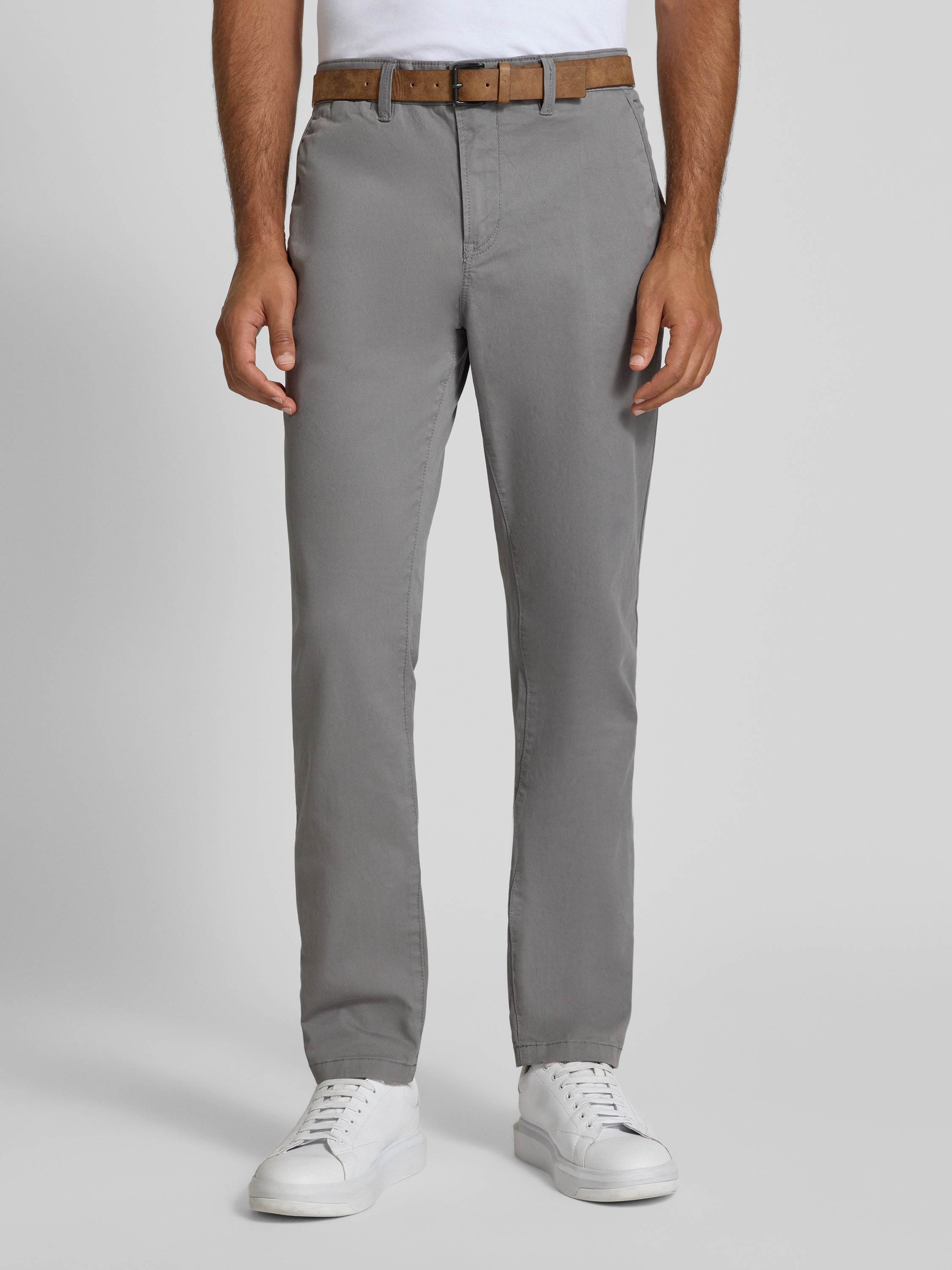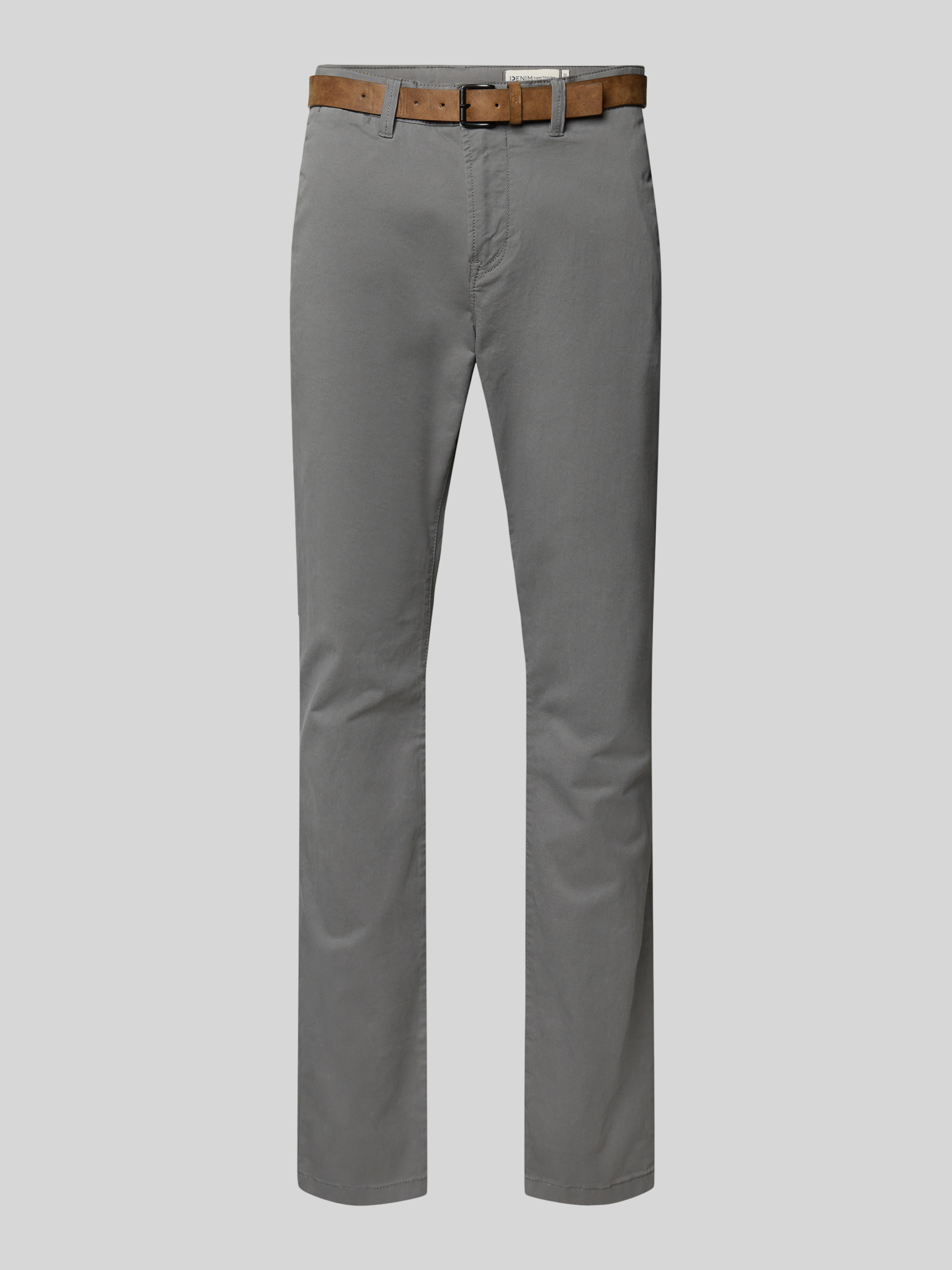 Die schmal geschnittene Slim Fit Chino mit Gürtel von TOM TAILOR Denim bringt durch ihre schlanke Passform und das niedrige Bündchen eine moderne Silhouette ins Spiel. Dank des Baumwoll-Elasthan-Mixes fühlt sich das Gewebe angenehm an und bleibt formstabil. Dezente Details, wie französische Taschen und ein passender Gürtel, runden das Gesamtbild ab.