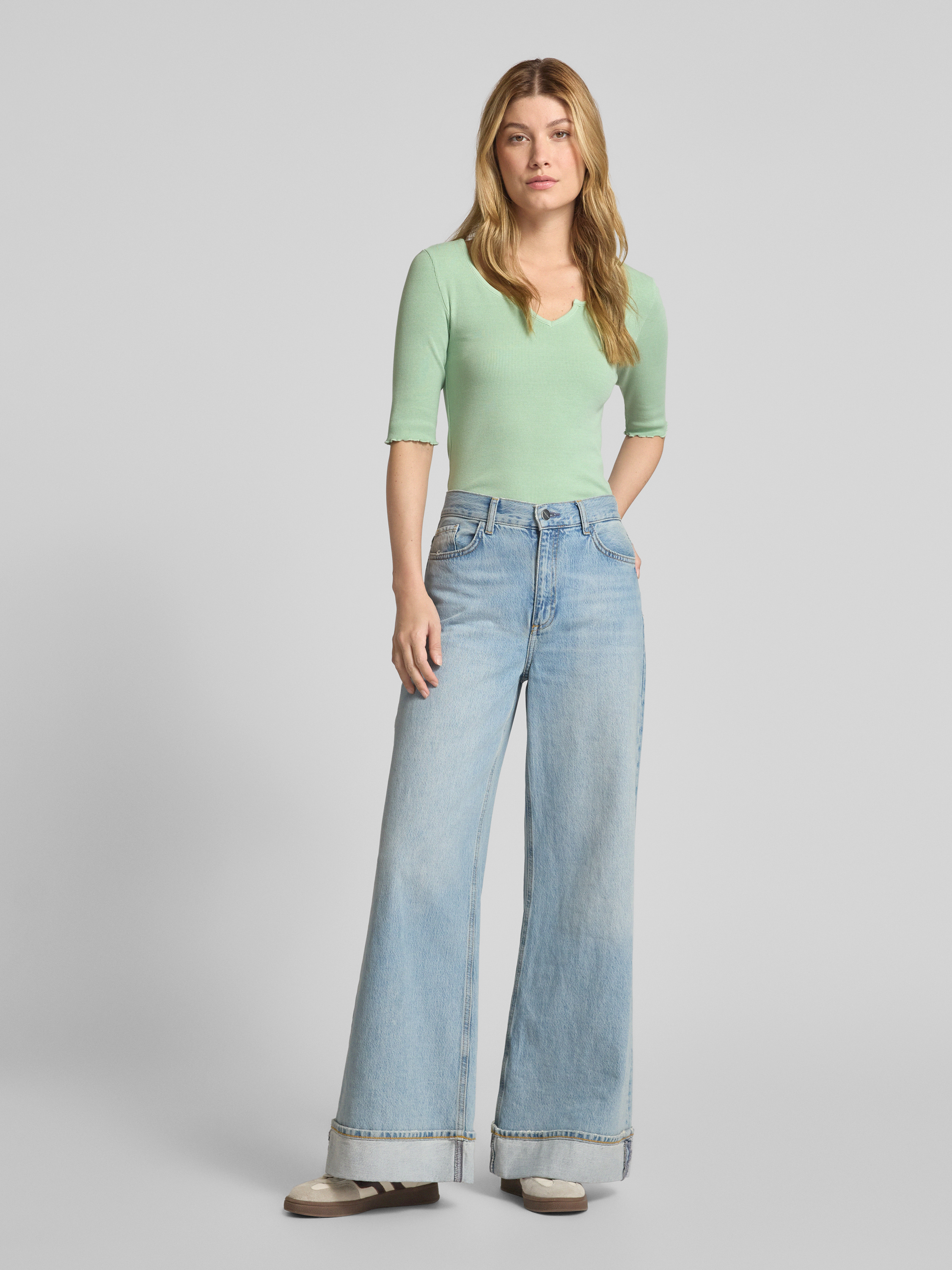Das Tom Tailor Denim Slim Fit T-Shirt aus einem hochwertigen Baumwoll-Mix überzeugt durch seine schmale Passform, die sich angenehm an den Körper anschmiegt. Der U-Ausschnitt mit V-Cut-Out verleiht dem Oberteil eine besondere Note, während die Frill-Details an Ärmeln und Rumpfabschluss für eine verspielte Optik sorgen. Ideal für vielfältige Kombinationen im Alltag.