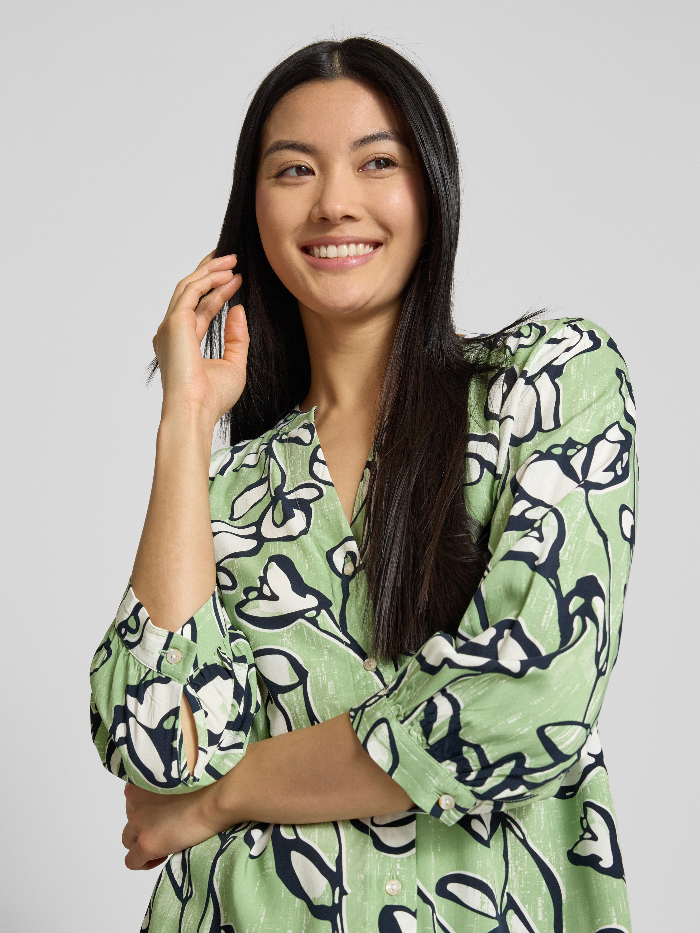 Die Regular Fit Bluse von Tom Tailor aus reiner Viskose kombiniert ein ansprechendes Allover-Muster mit einer feinen Webstruktur. Der Tunika-Kragen und der V-Ausschnitt verleihen dem Design eine elegante Note. Die 3/4-Ärmel sorgen für einen lässigen und gleichzeitig stilvollen Look.