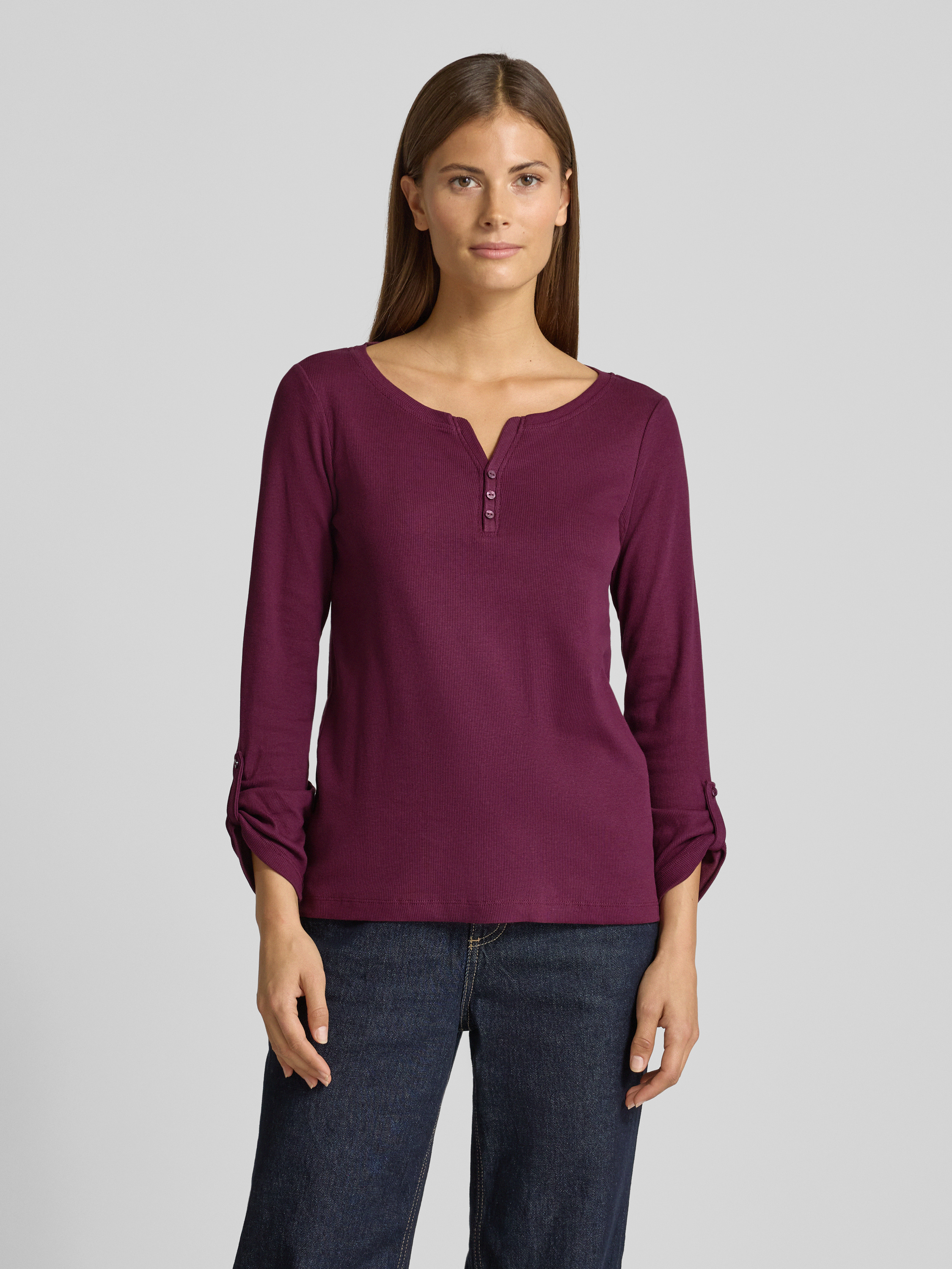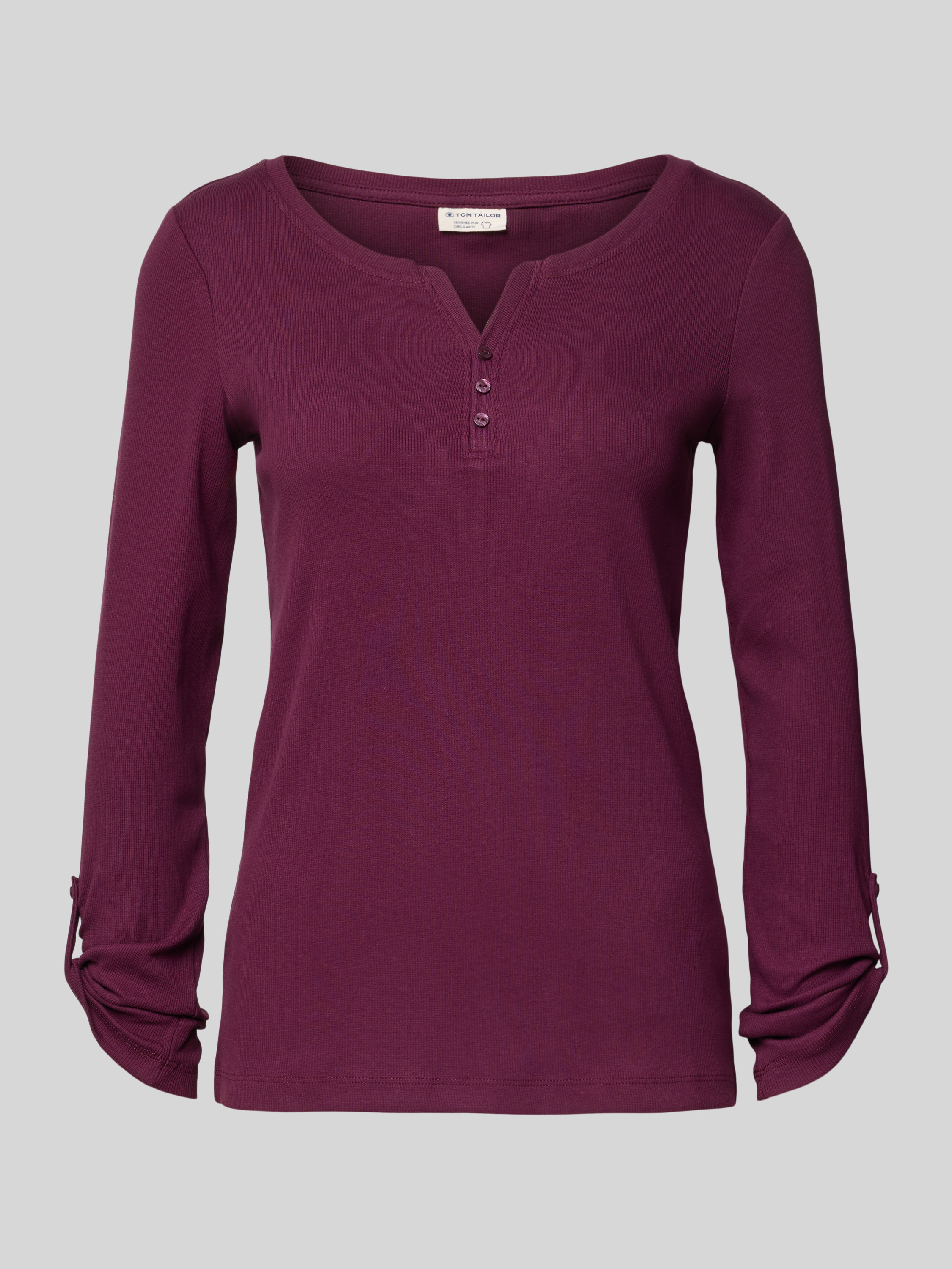 Das Damen Langarmshirt von Tom Tailor zeigt sich im Regular Fit und sorgt mit dem unifarbenen Baumwoll-Mix für angenehmen Tragekomfort. Der V-Ausschnitt und die langen Ärmel mit Turn-up-Option bringen unkomplizierte Vielseitigkeit in den Alltag. So lässt sich der Look flexibel kombinieren.