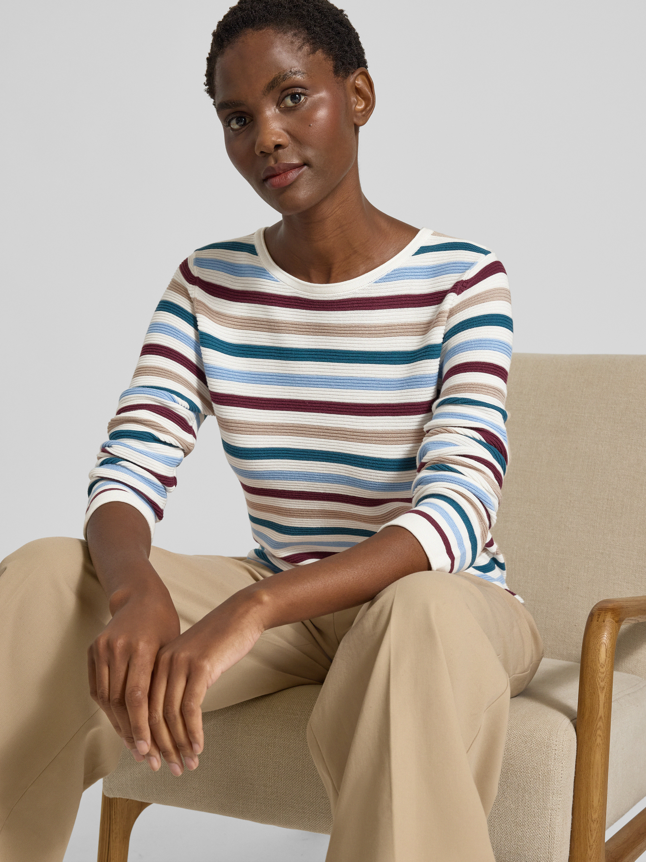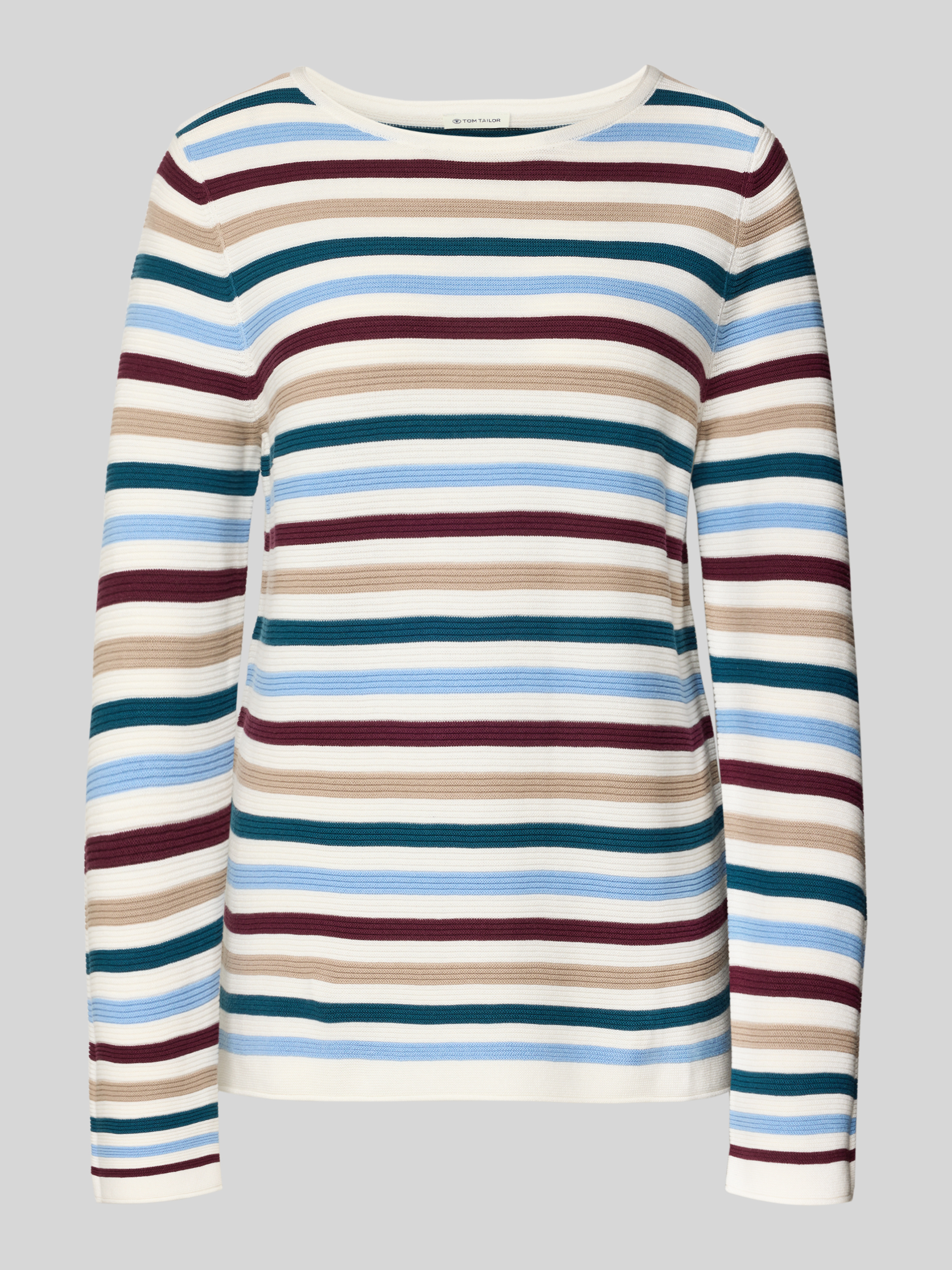 Der Damenpullover von Tom Tailor präsentiert sich in klassischem Regular Fit und zeigt ein dezentes Allover-Muster. Durch den U-Boot-Ausschnitt und die gerollten Abschlüsse entsteht eine lässige Silhouette, die vielseitig kombiniert werden kann. Reine Baumwolle in feinem Strick sorgt dabei für ein angenehmes Tragegefühl.