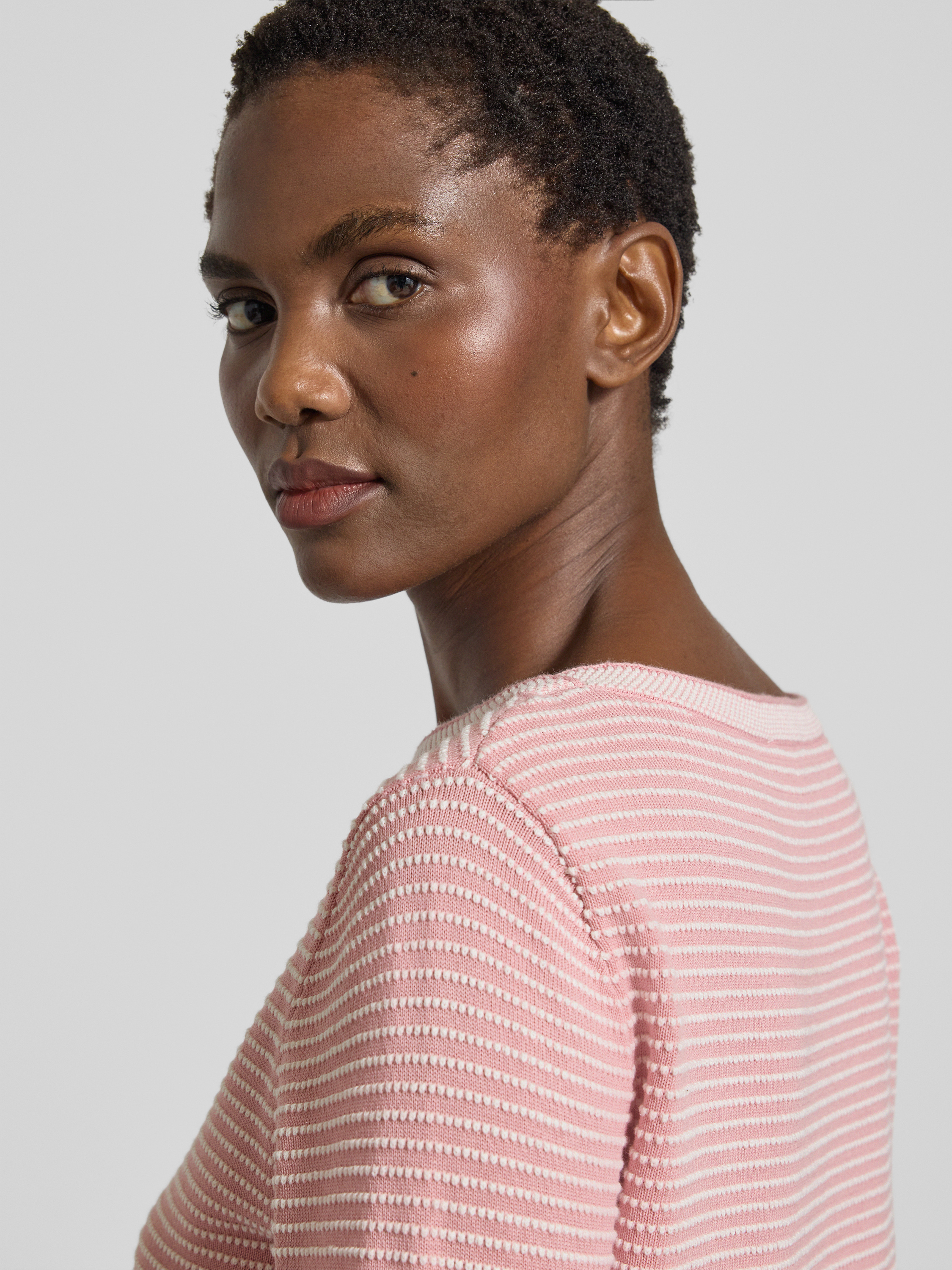 Der Damen Pullover von Tom Tailor im Regular-Fit zeigt ein gestreiftes Allover-Muster, das den Feinstrick aus reiner Baumwolle unterstreicht. Durch den U-Boot-Ausschnitt und gerollte Abschlüsse entsteht eine legere Silhouette, die vielseitig kombinierbar wirkt. So fühlt man sich im Alltag angenehm angezogen und bleibt flexibel.