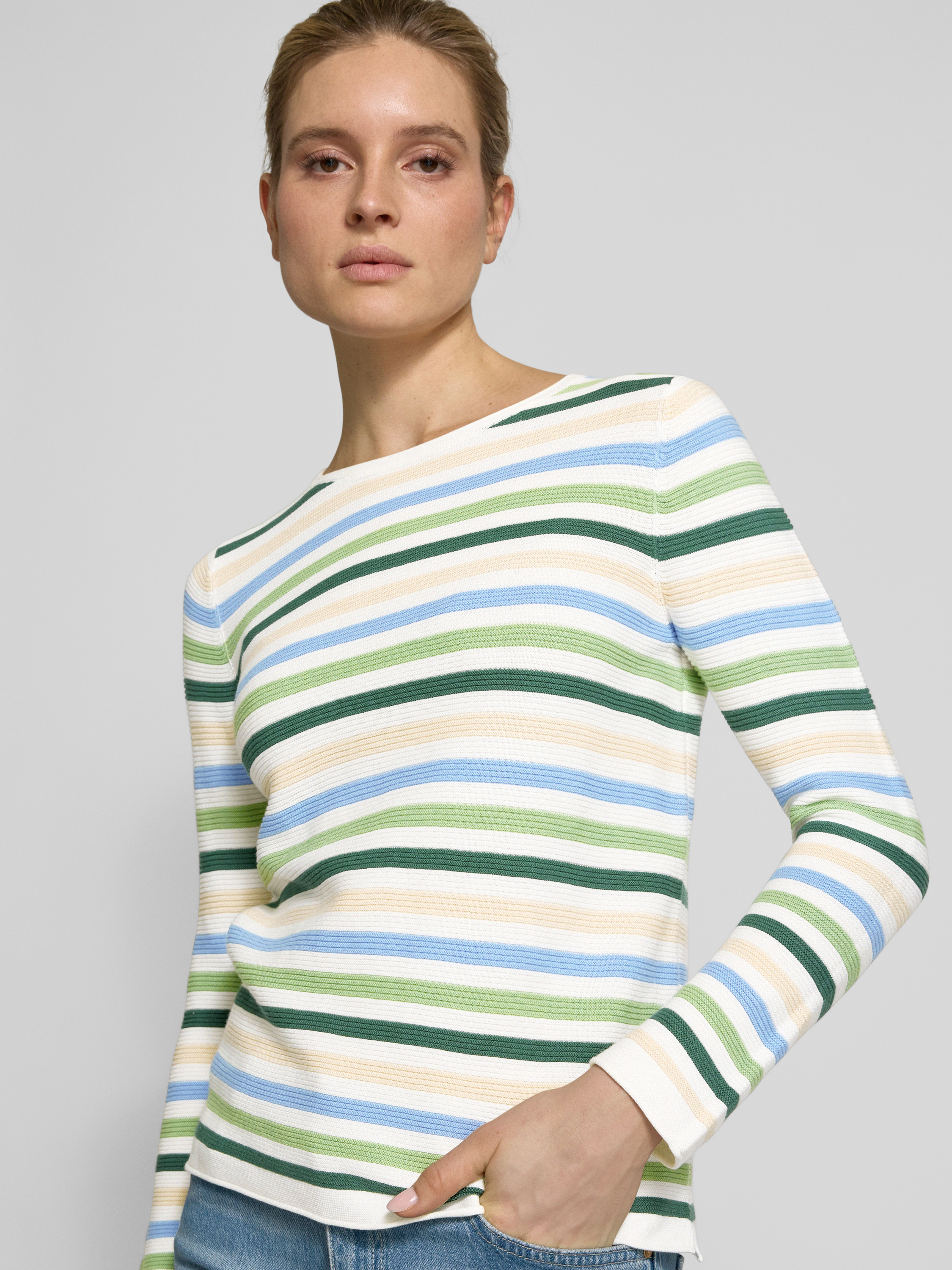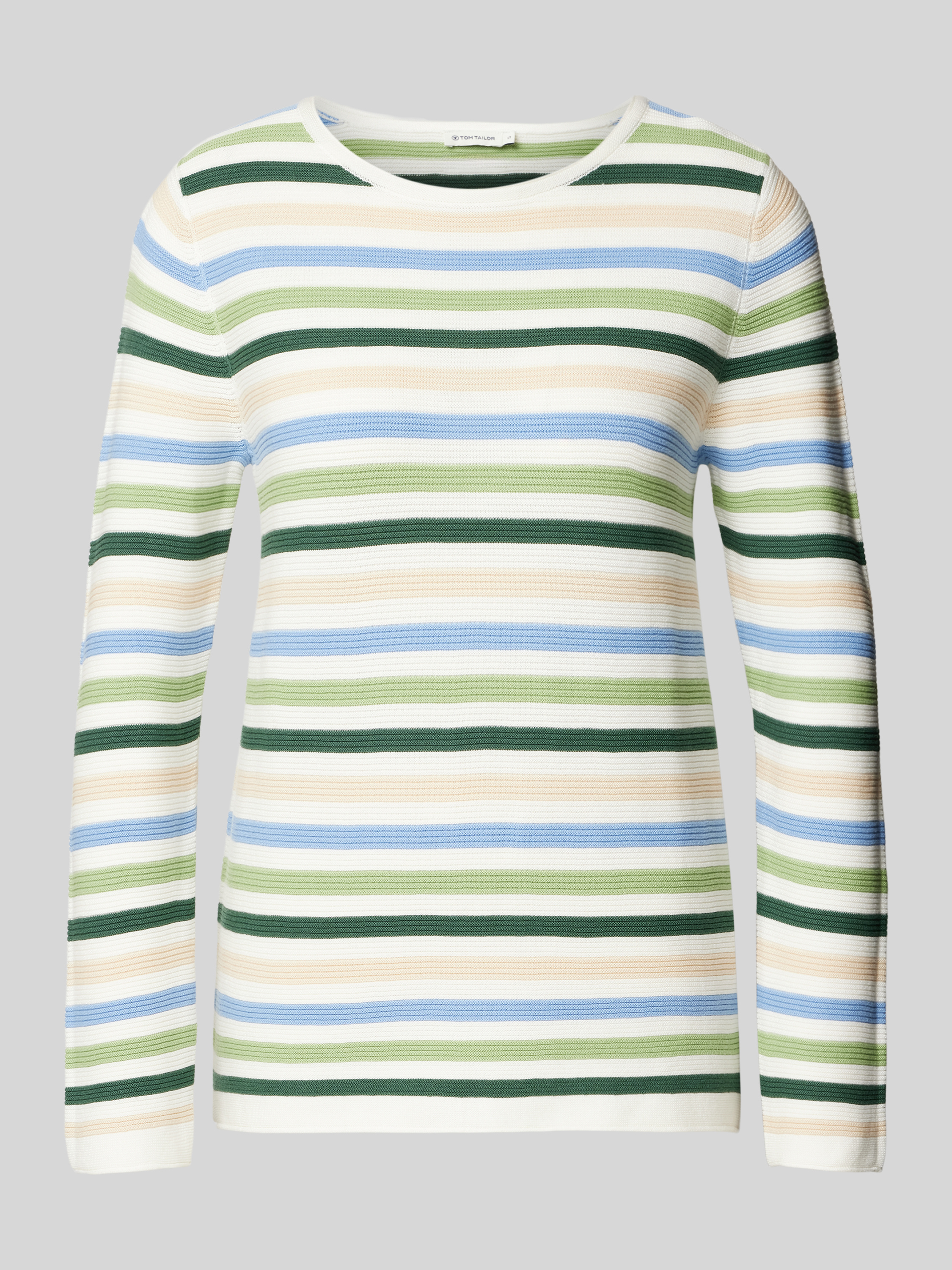 Der Damen Strickpullover von Tom Tailor vereint zeitlose Eleganz und bequemen Tragekomfort durch seine Regular Fit Passform und die Verwendung von reiner Baumwolle. Das mehrfarbige Streifenmuster und der U-Boot-Ausschnitt mit Rollkante verleihen dem Pullover eine besondere Note. Lange Ärmel und Rollsäume an den Abschlüssen runden das Design harmonisch ab.