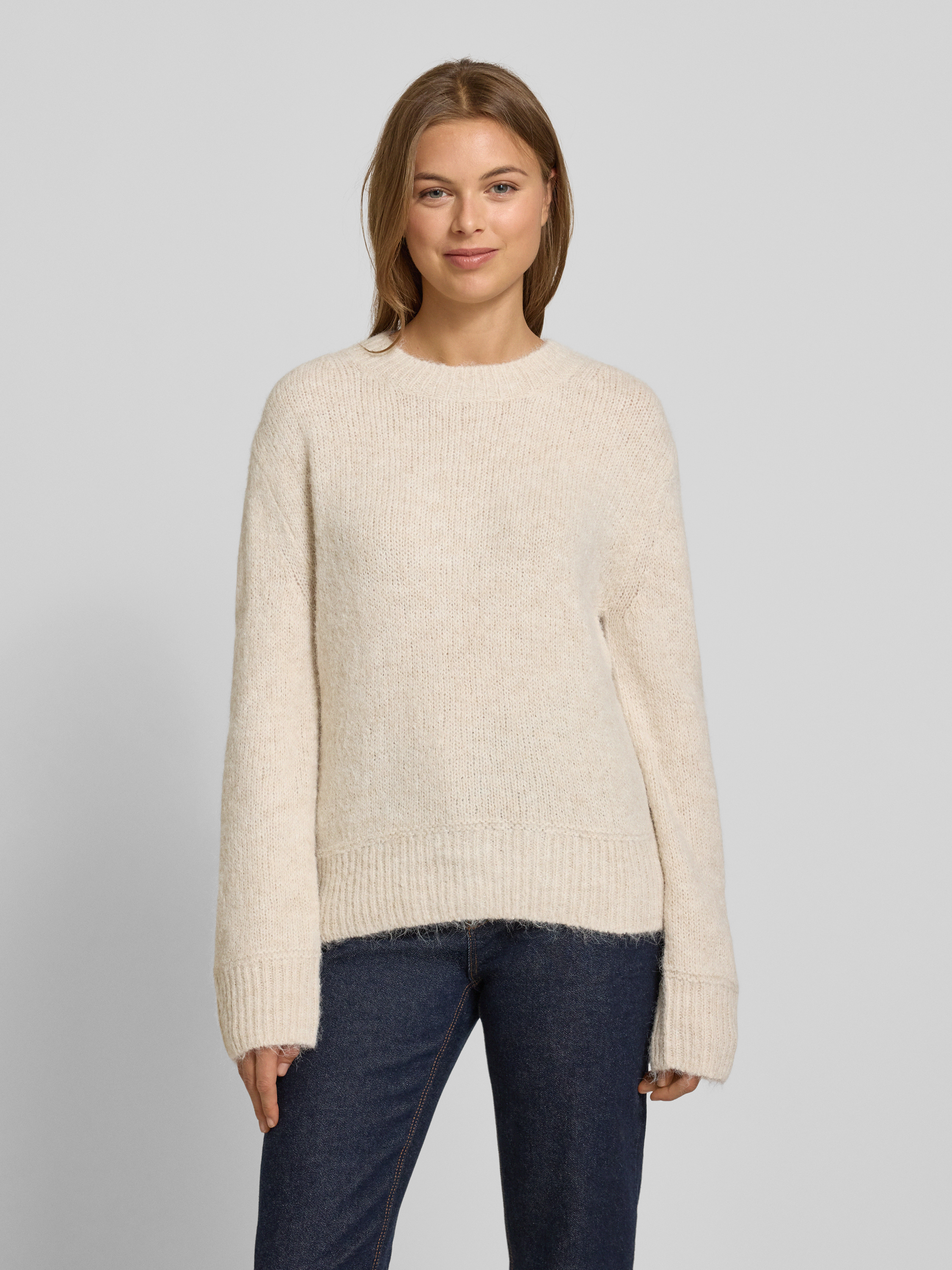 Der Damen Strickpullover von Tom Tailor verbindet eine Regular-Fit Passform mit einer angenehmen Melange-Optik und sorgt so für ein entspanntes Tragegefühl im Alltag. Durch den Woll-Anteil fühlt sich der Strickpullover spürbar weich an und hält dezent warm. Rippstrick und Crew Neck unterstreichen den zeitgemäßen Look, den man vielseitig kombinieren kann.