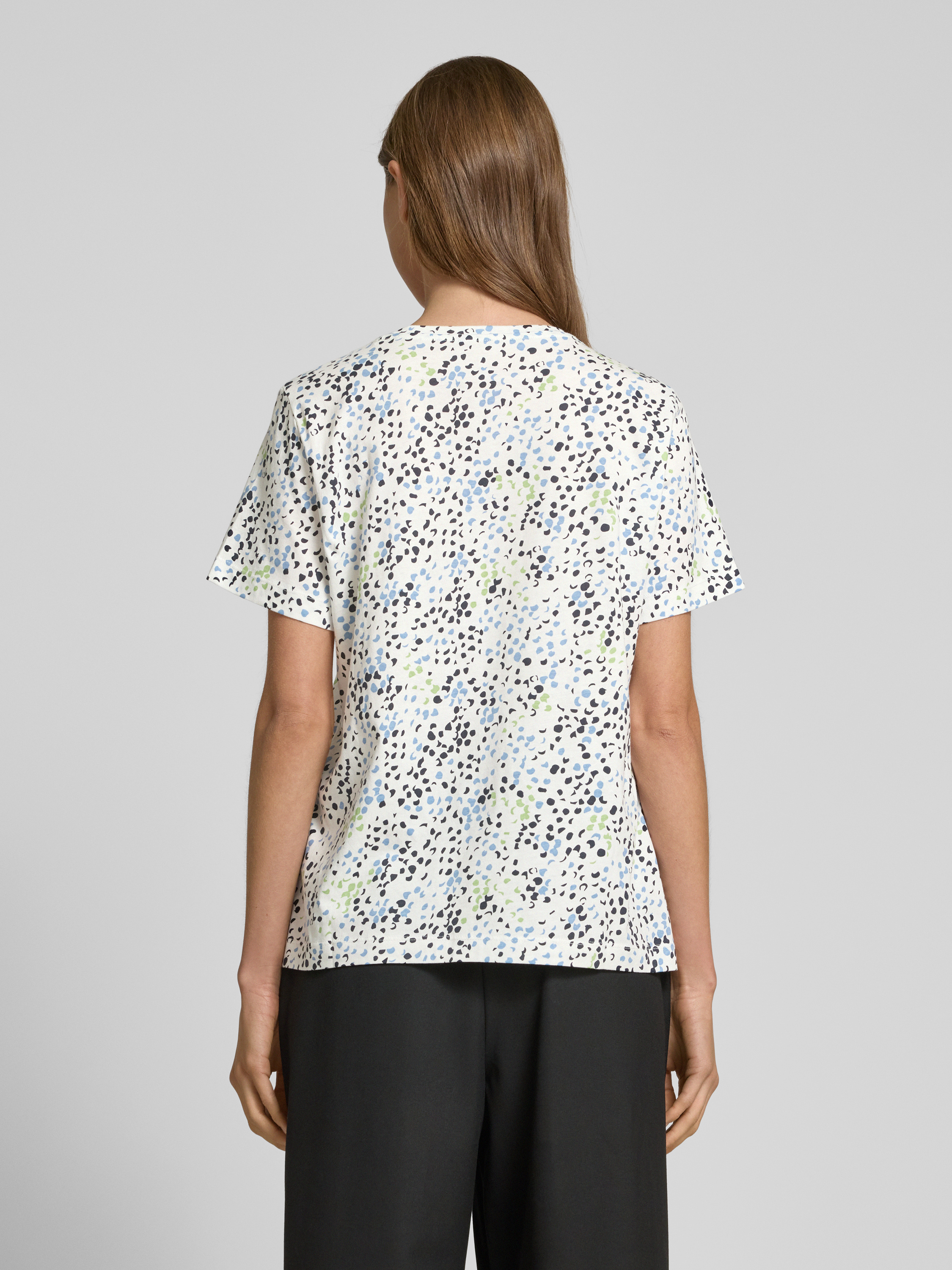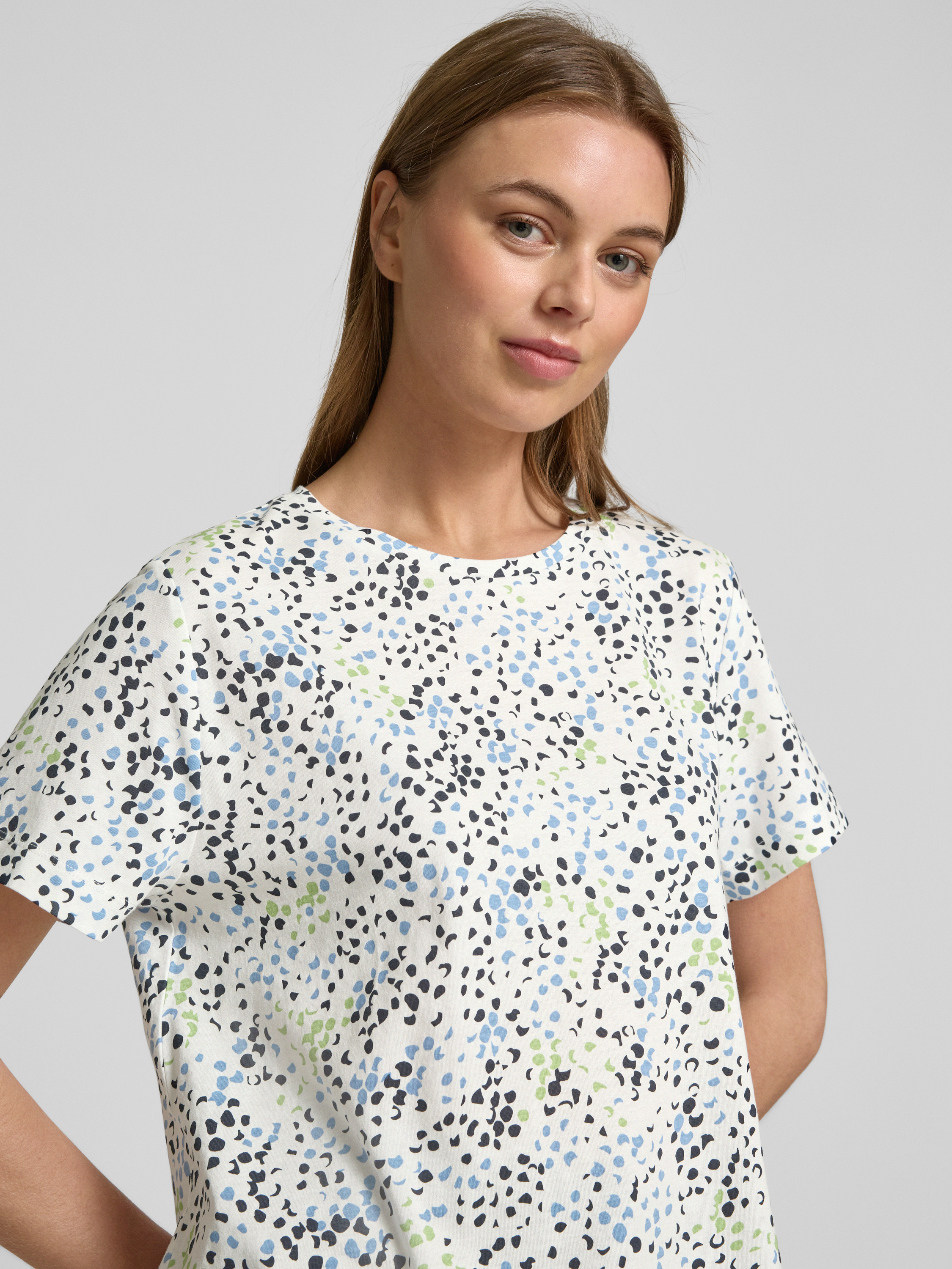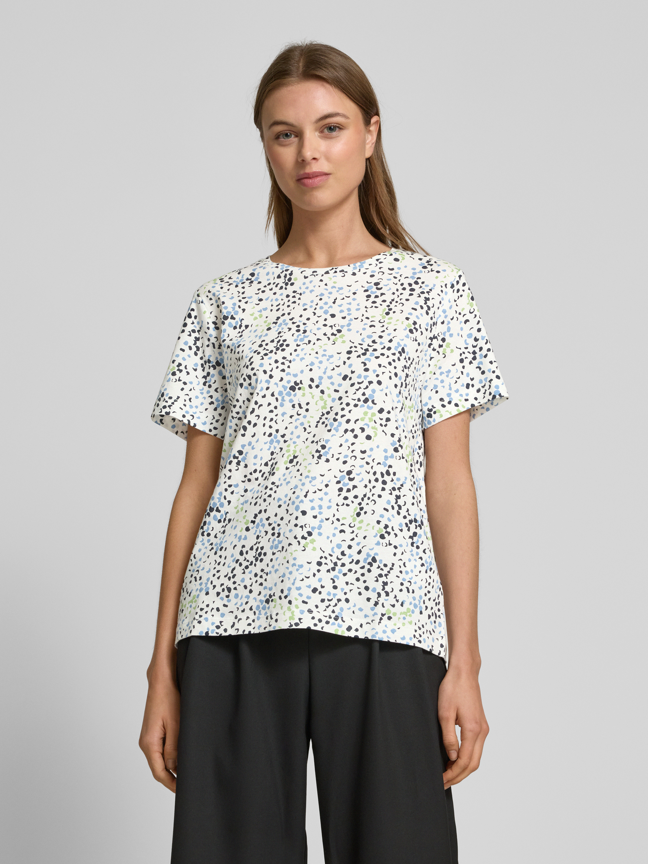 Das Damen T-Shirt von Tom Tailor kombiniert ein stilvolles Allover-Muster mit der angenehmen Passform des Regular Fit. Der Rundhalsausschnitt verleiht dem Modell einen klassischen Touch, während das weiche Jersey aus reiner Baumwolle hohen Tragekomfort gewährleistet. Ideal für vielseitige Outfits.