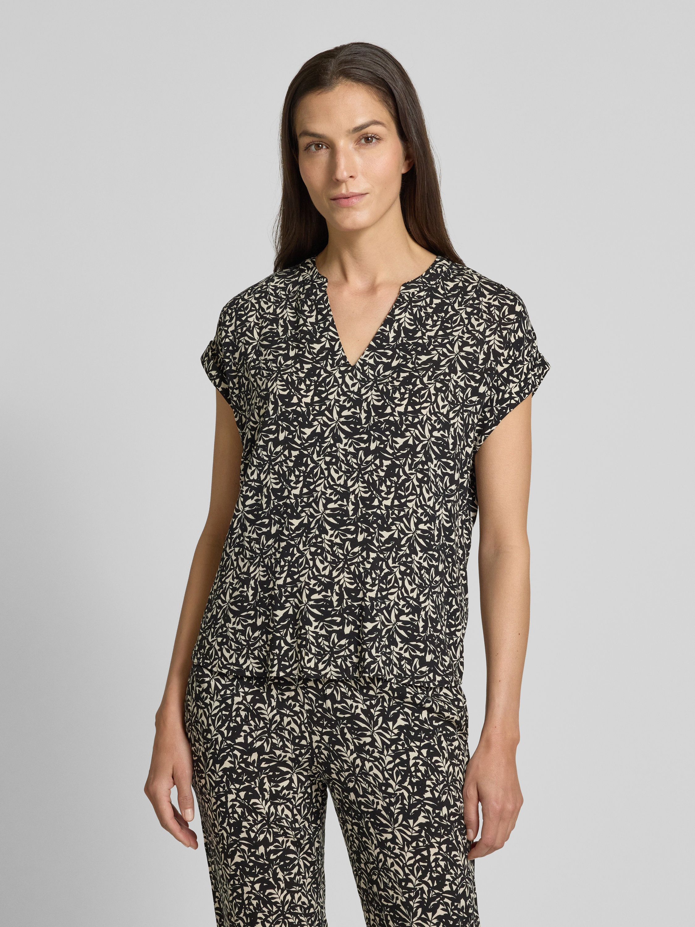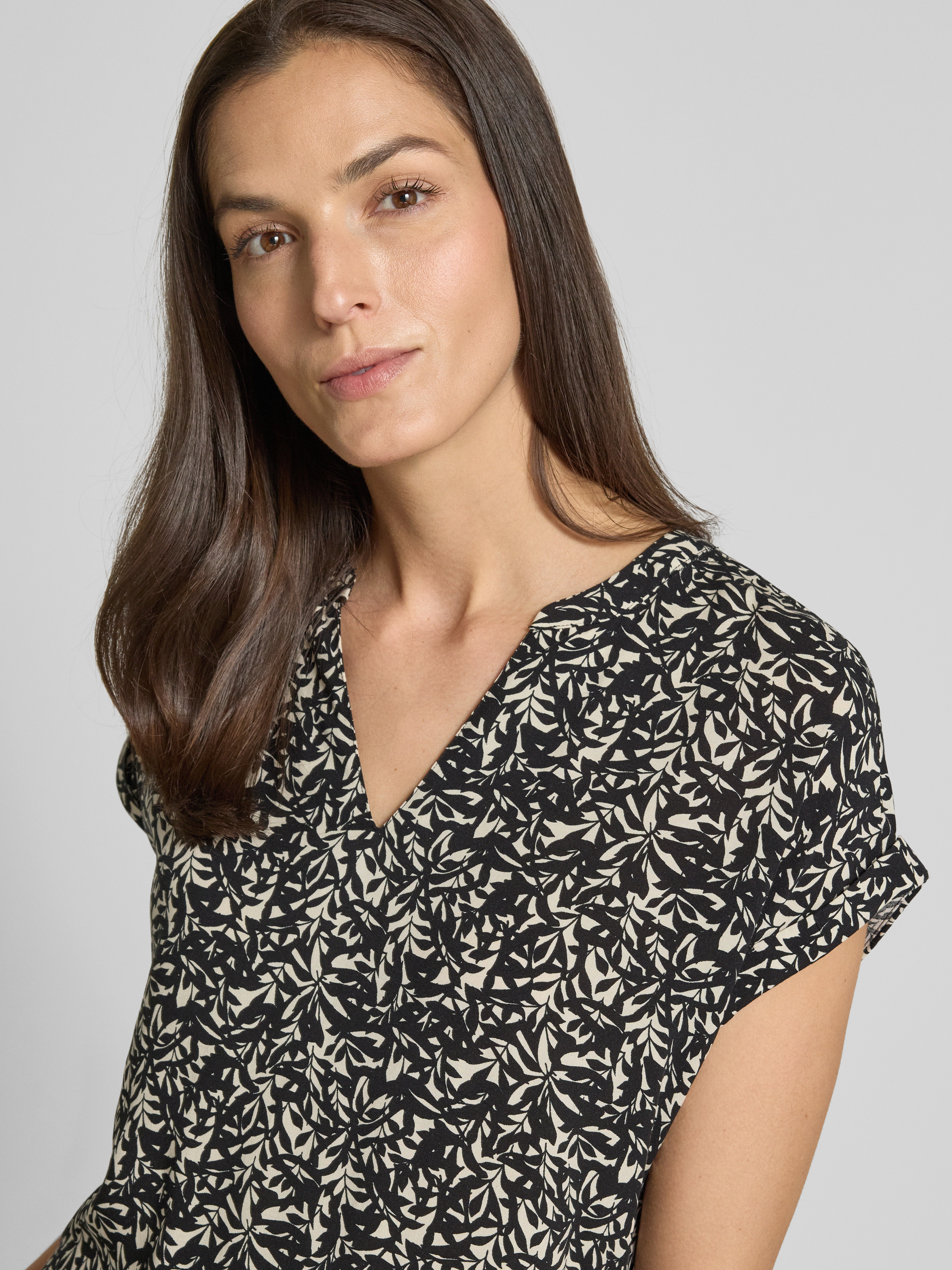 Das Damen Blusenshirt von Tom Tailor zeigt sich in entspannter Relaxed Fit-Passform und sorgt durch überschnittene Schultern für angenehme Bewegungsfreiheit. Die reine Viskose fühlt sich leicht an, während der V-Ausschnitt mit Tunika-Kragen für eine lockere Note sorgt. Ein fixierter Umschlag am Ärmel rundet das Gesamtbild ab.